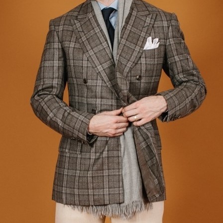 许多人穿多了藏青色,会觉得单调,这款青蓝小格纹远看像是纯色,近看会发现是有花纹的,可以降低一些正式感,平时休闲场合穿着是很好的选择。