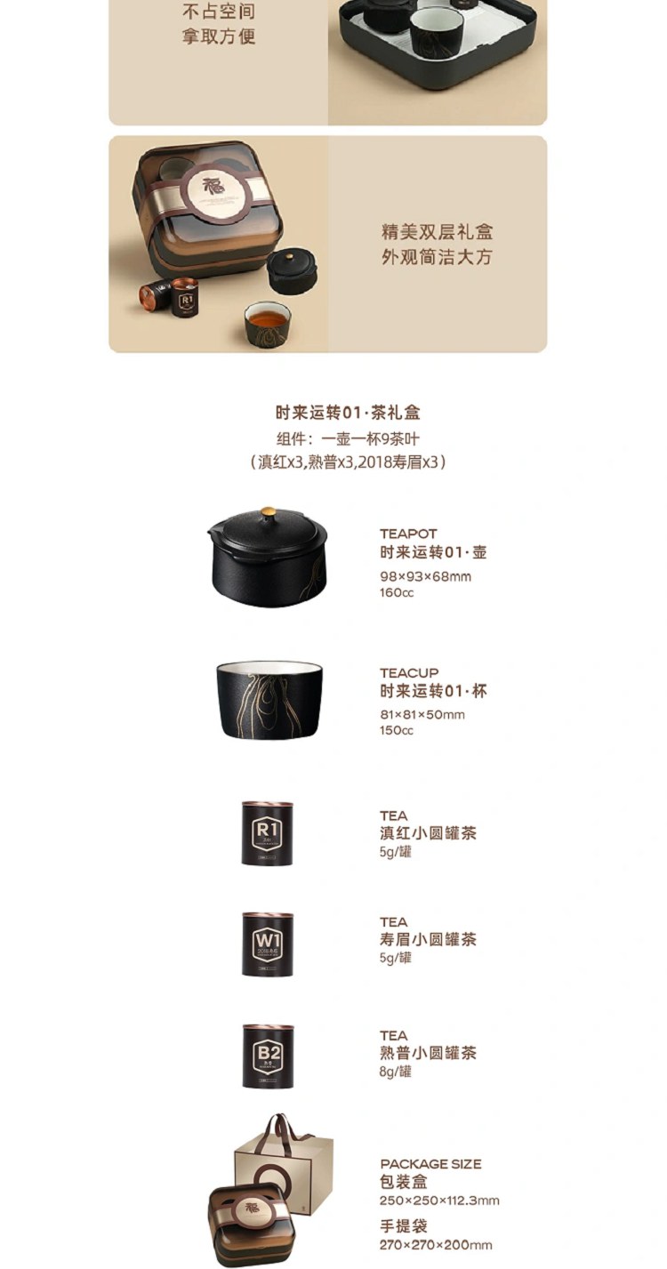 尺寸:壶尺寸容量:99*93*68mm 160cc杯尺寸容量:83*83*51mm 150cc茶叶:滇红:5g/罐 寿眉:5g/罐;熟普:8g/罐礼盒:250*250*112.3mm