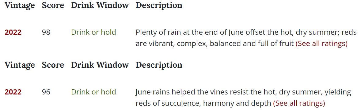2022 年可谓是勃艮第的大年,无论是干白、还是干红都表现很不错。《葡萄酒观察家》(Wine Spectator)给出了勃艮第整体 95-98 的高分肯定(夜丘 98、伯恩丘 96、干白 95)。