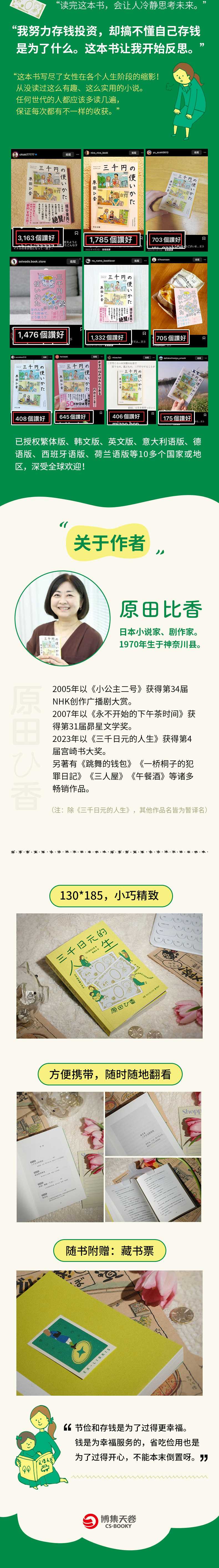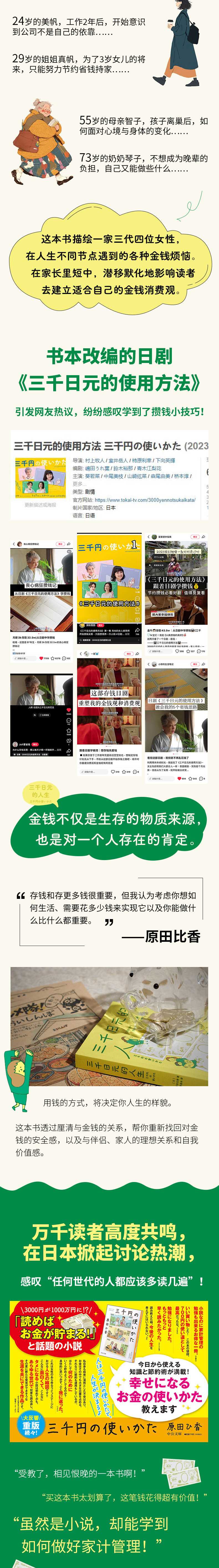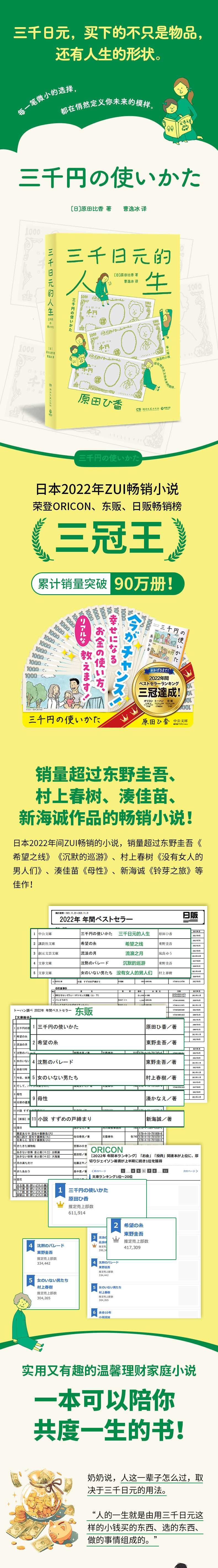 ★日本2022年销量超过东野圭吾、村上春树、凑佳苗、新海诚作品的畅销小说! 2022年日本销量领先的畅销小说,销量超过同年出版的东野圭吾《希望之线》《沉默的巡游》、村上春树《没有女人的男人们》、凑佳苗《母性》、新海诚《铃芽之旅》等佳作! ★三千日元,买下的不只是物品,还有人生的形状。每一笔微小的选择,都在悄然定义你未来的模样。这本书从;家计的角度出发,描绘主角家三代女性,在人生不同节点遇到的各种金钱烦恼。在家长里短中,潜移默化地影响读者去建立适合自己的金钱消费观。 ★金钱是人生观、价值观的缩影。金钱不仅是生存的物质来源,也是对一个人存在的肯定。这本书透过厘清与金钱的关系,帮你重新找回对金钱的安全感,以及与伴侣、家人的理想关系和自我价值感。 ★日本2022年备受瞩目的畅销书,荣登 ORICON、东贩、日贩畅销榜三冠王!累计销量突破90万册! ★万千读者高度共鸣,感叹;任何世代的人都应该多读几遍! ★已授权繁体版、韩文版、英文版、意大利语版、德语版、西班牙语版、荷兰语版等10多个国家或地区,深受欢迎!