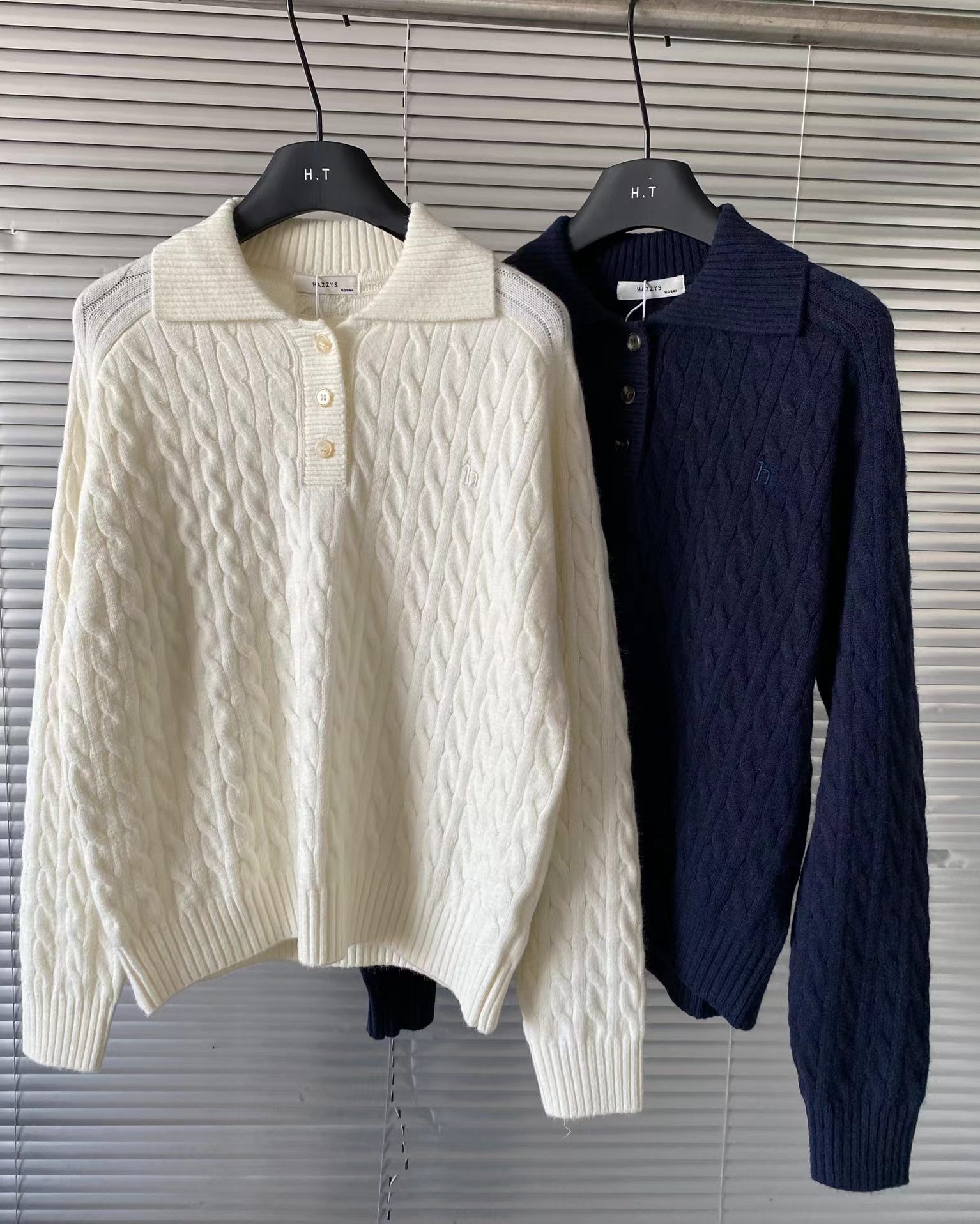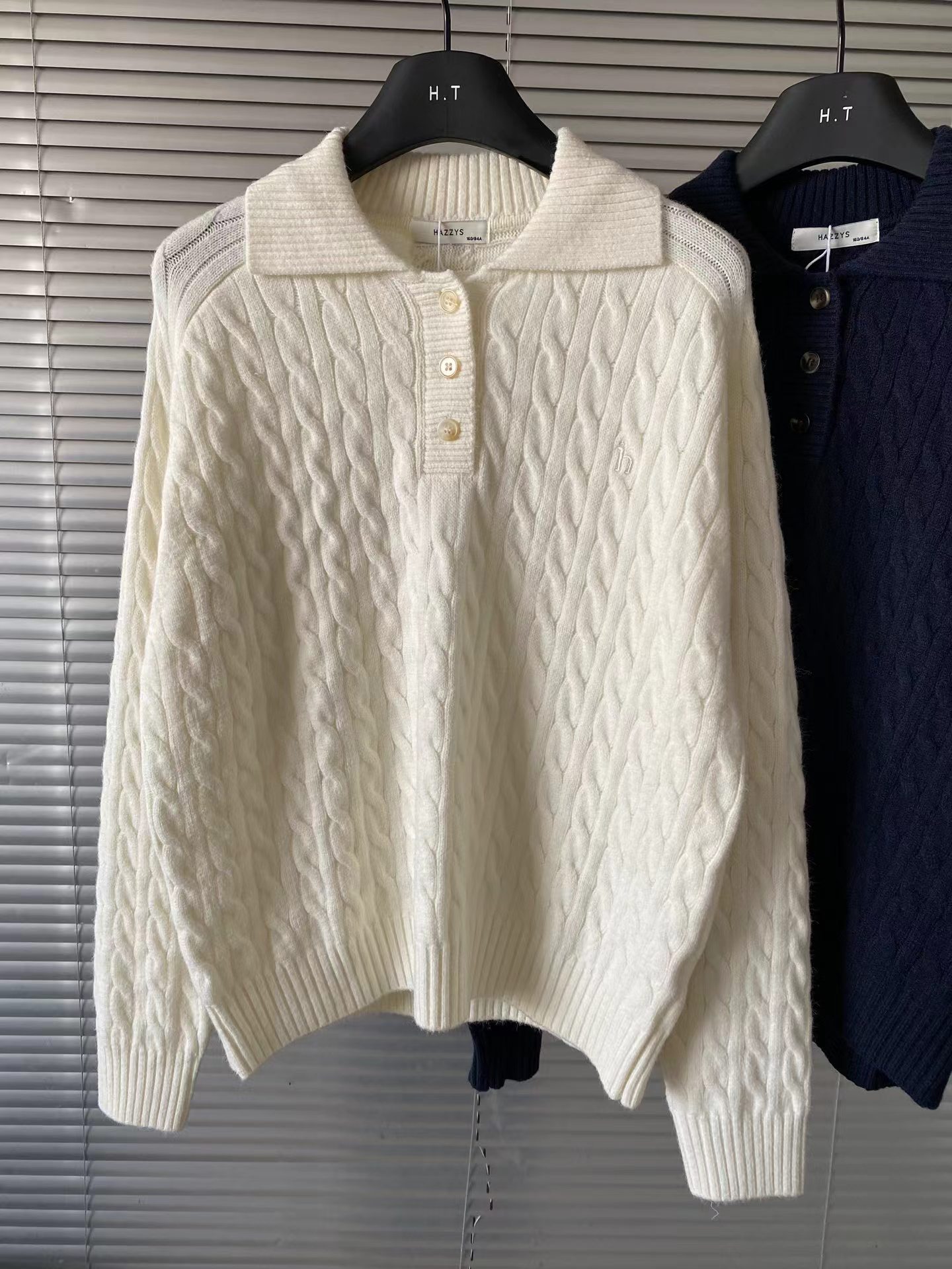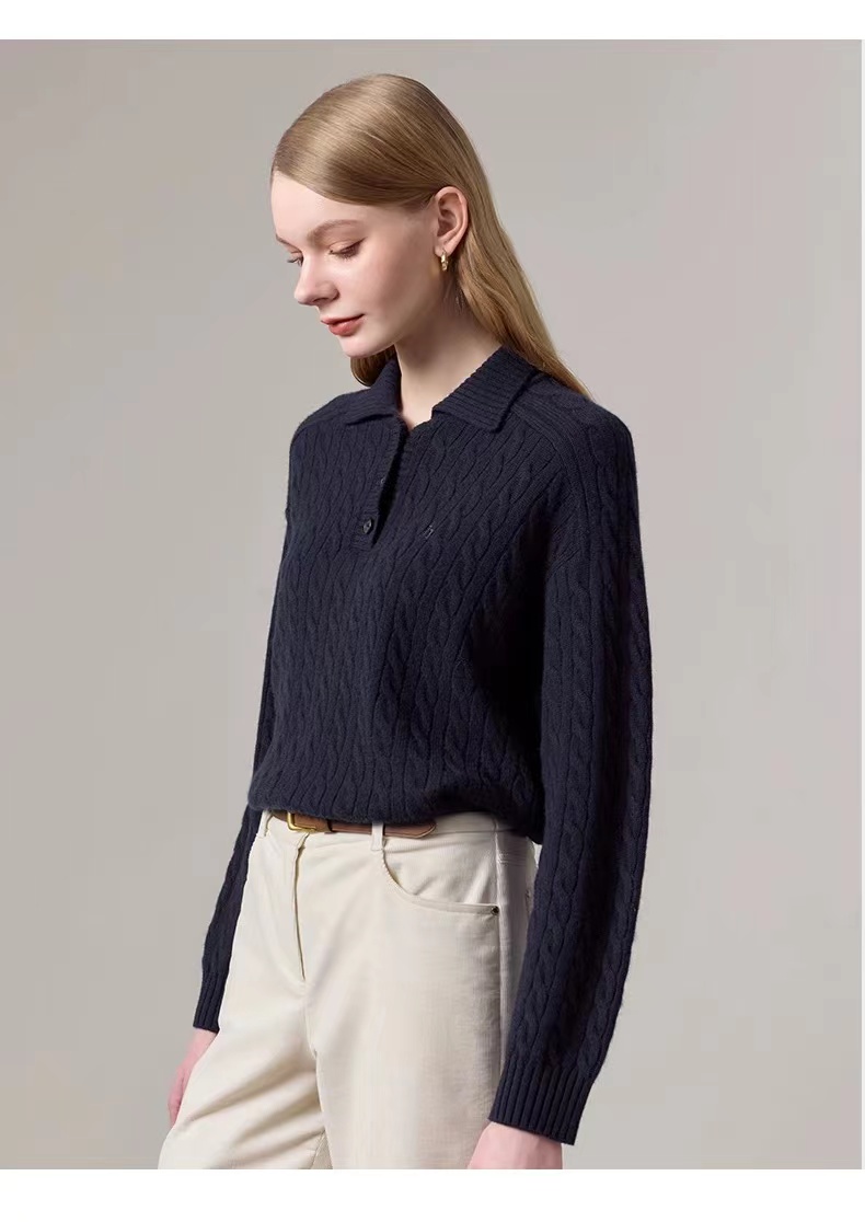 翻领绞花毛衫女2025秋冬新品针织衫!!经d的阿兰编织手法,赋予毛衣立体感和复古学院风。POLO衫式的纽扣翻领,打造干练又减龄的造型。采用优质羊毛混纺,保证保暖性的同时兼顾亲肤感和抗起球能力。实穿性与搭配 非常百搭,可内搭衬衫露出领口,或直接单穿。下装可搭配牛仔裤、休闲裤或半身裙,适用于通勤、休闲等多种场合。