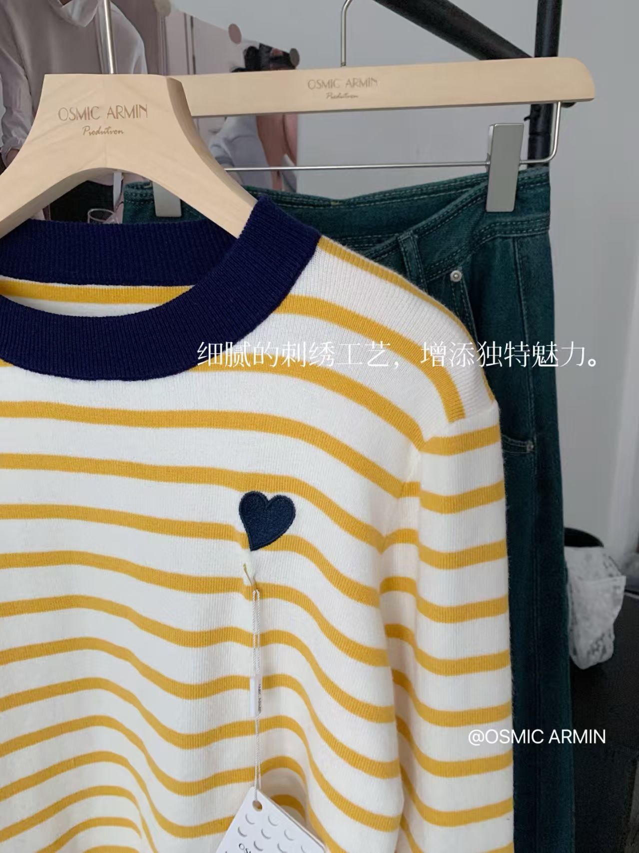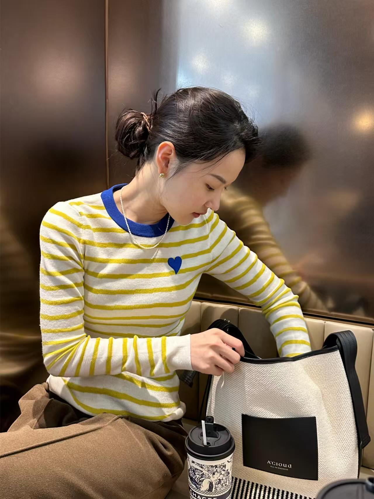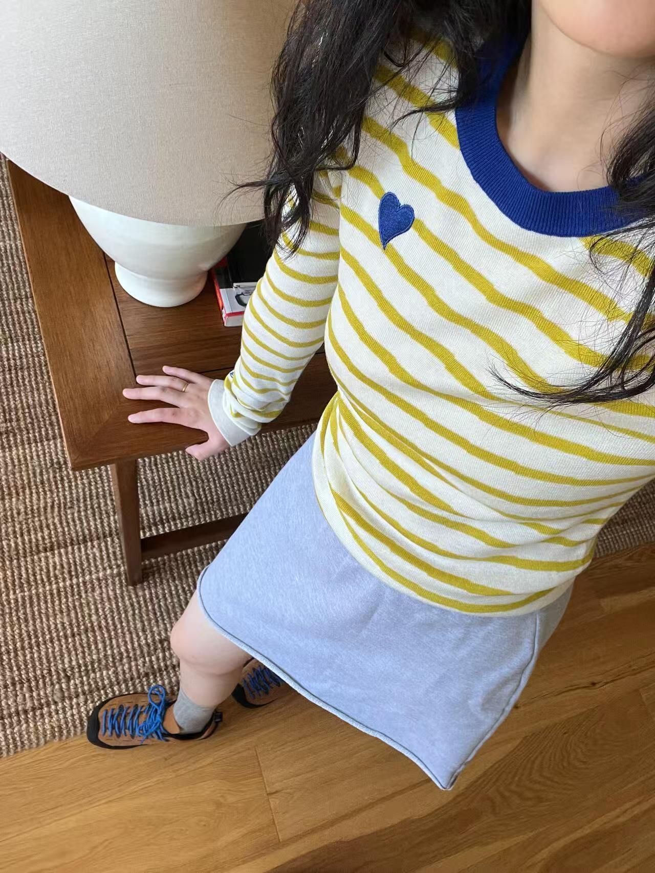 绵羊毛爱心刺绣条纹撞色针织衫,克莱茵兰撞色领口,超显白❗️亮色系点亮春日好心情,好穿又好打理!