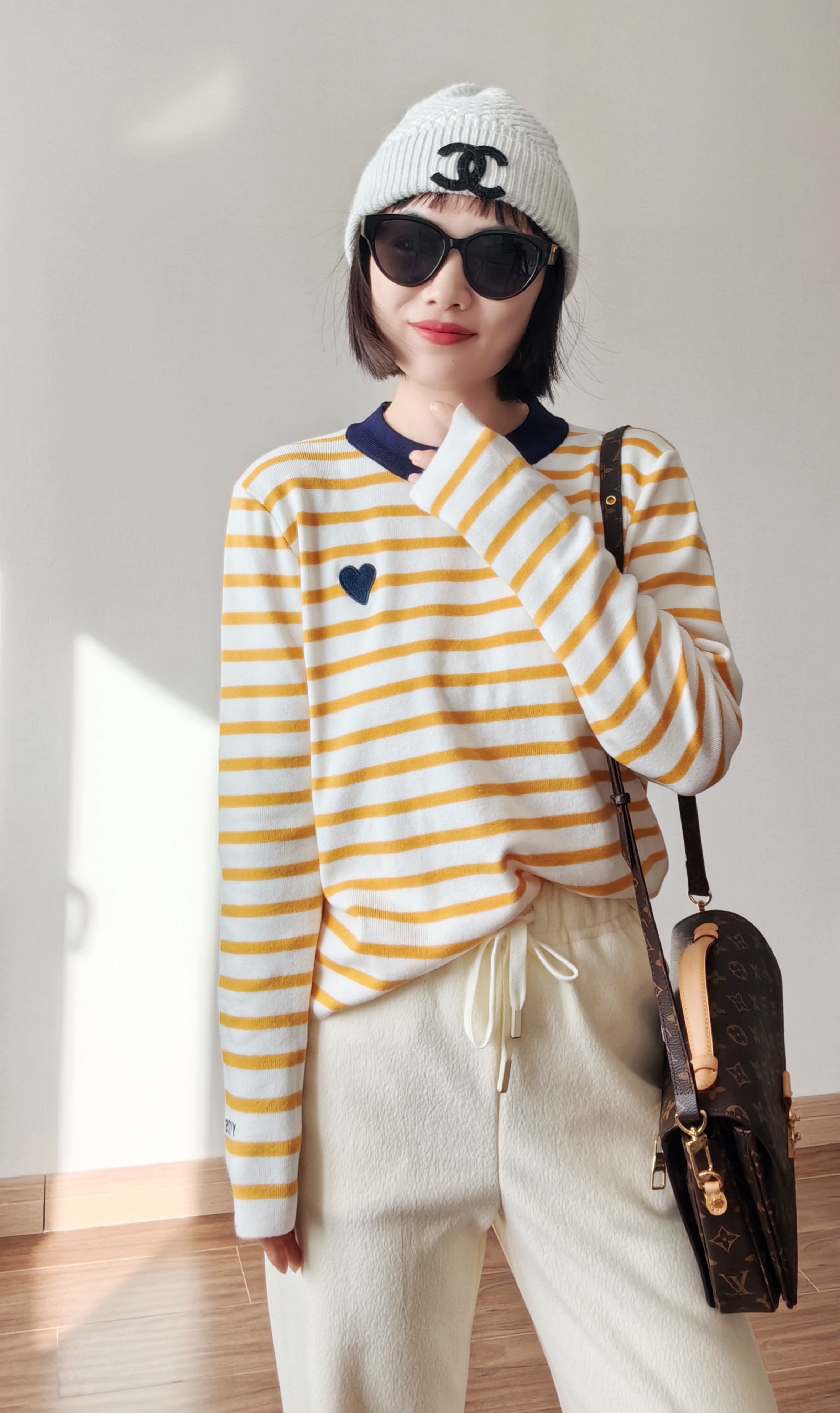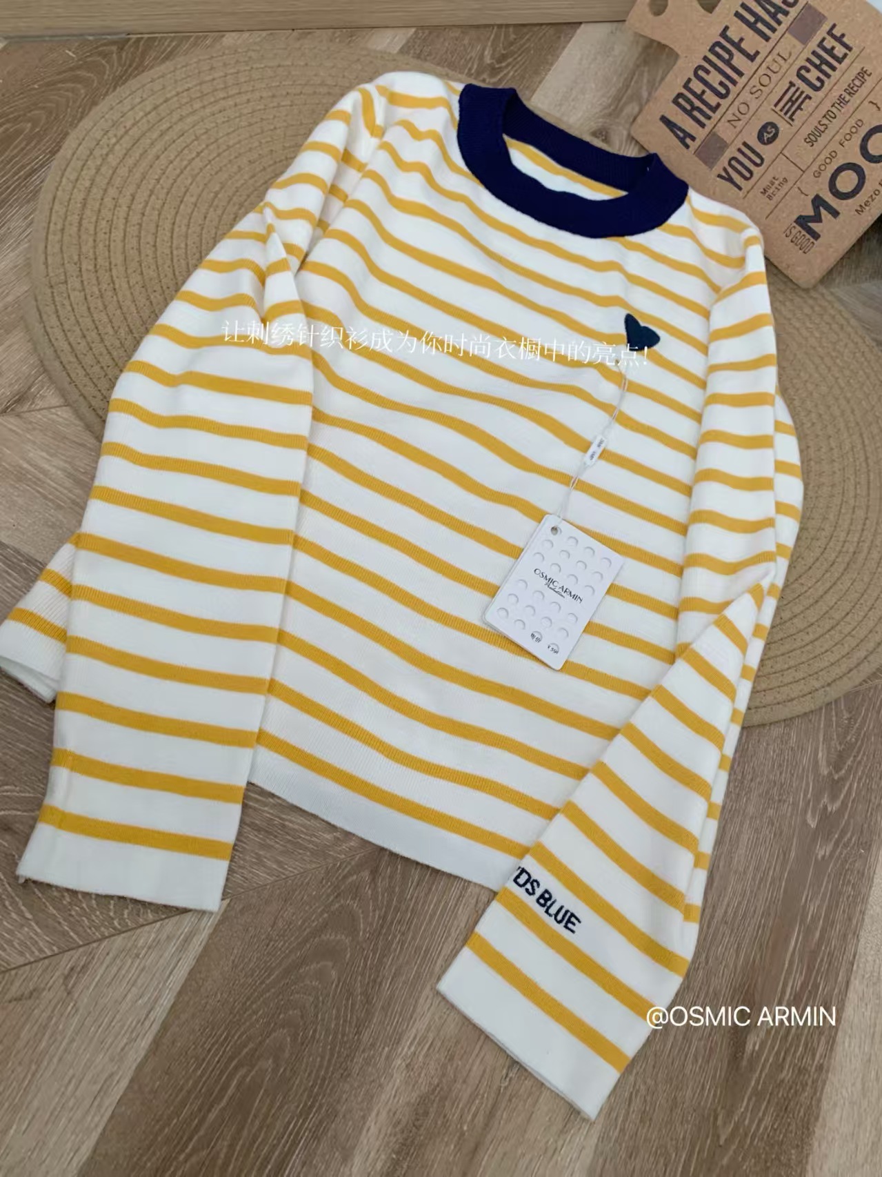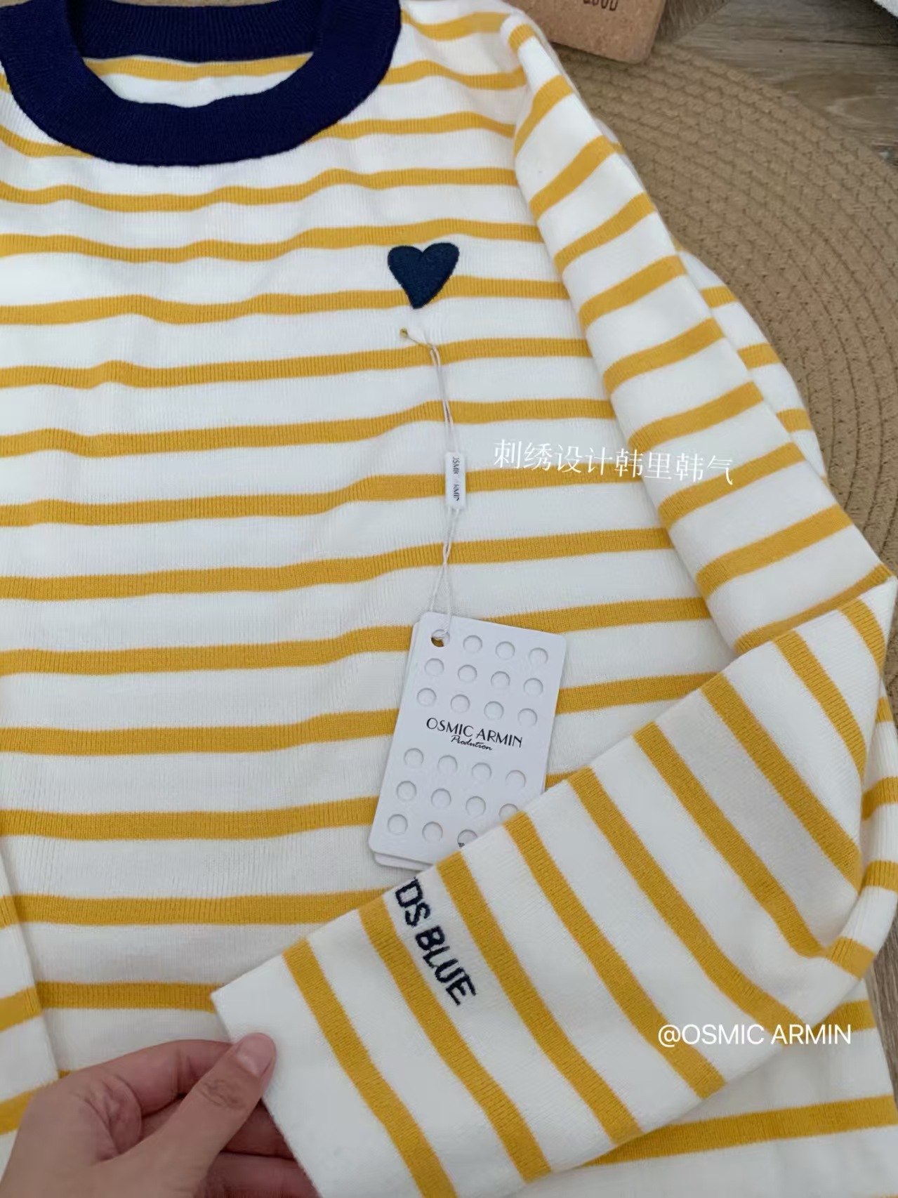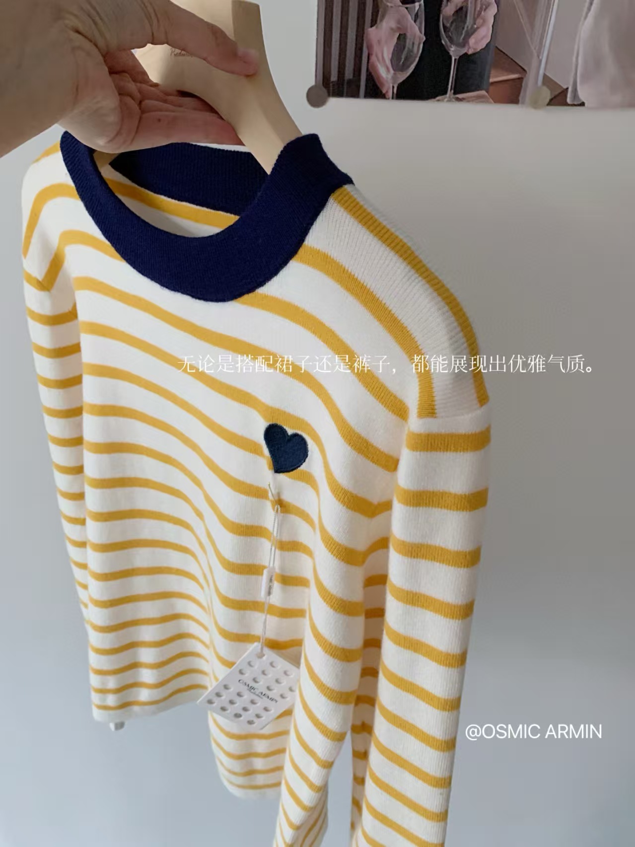 绵羊毛爱心刺绣条纹撞色针织衫,克莱茵兰撞色领口,超显白❗️亮色系点亮春日好心情,好穿又好打理!