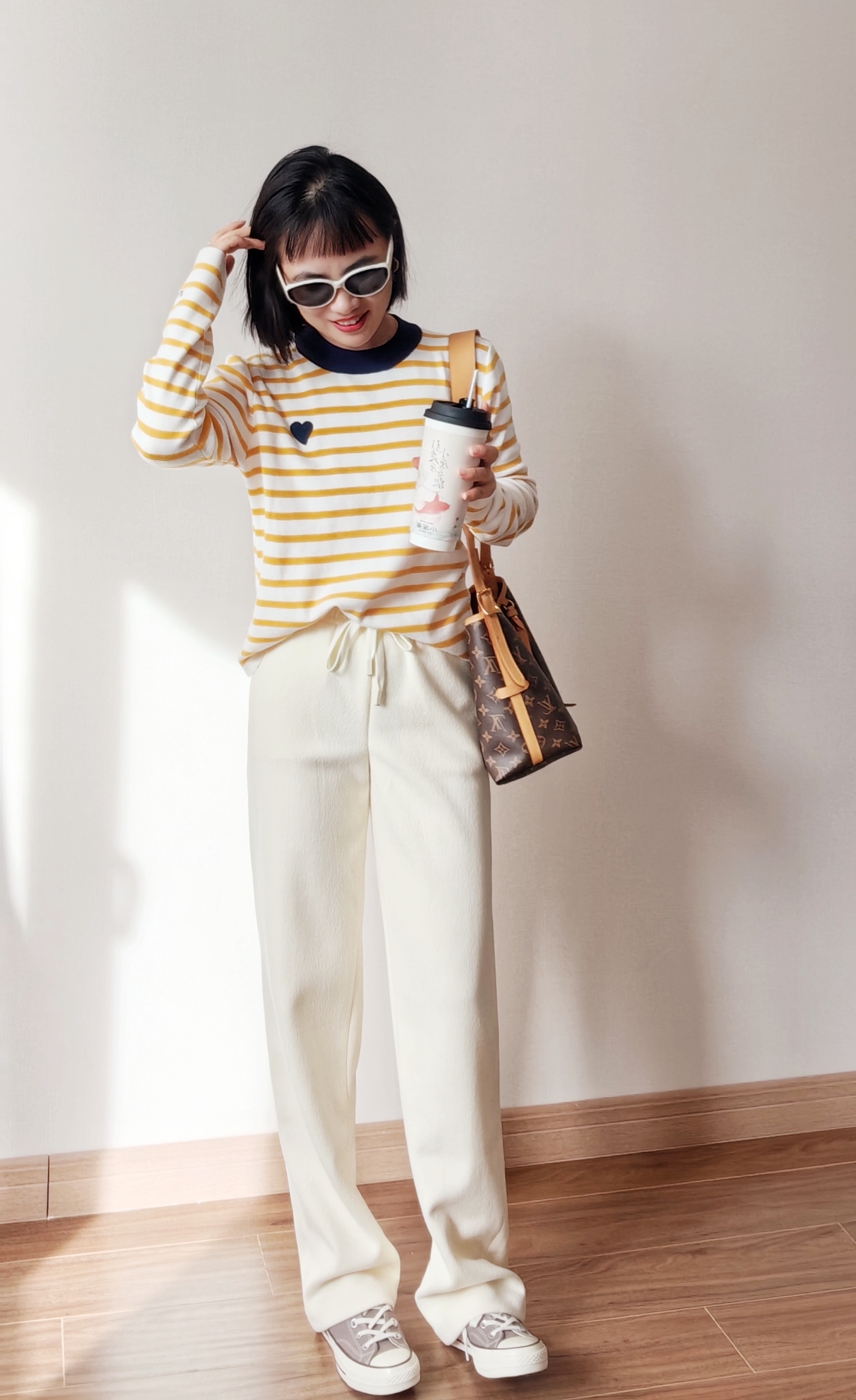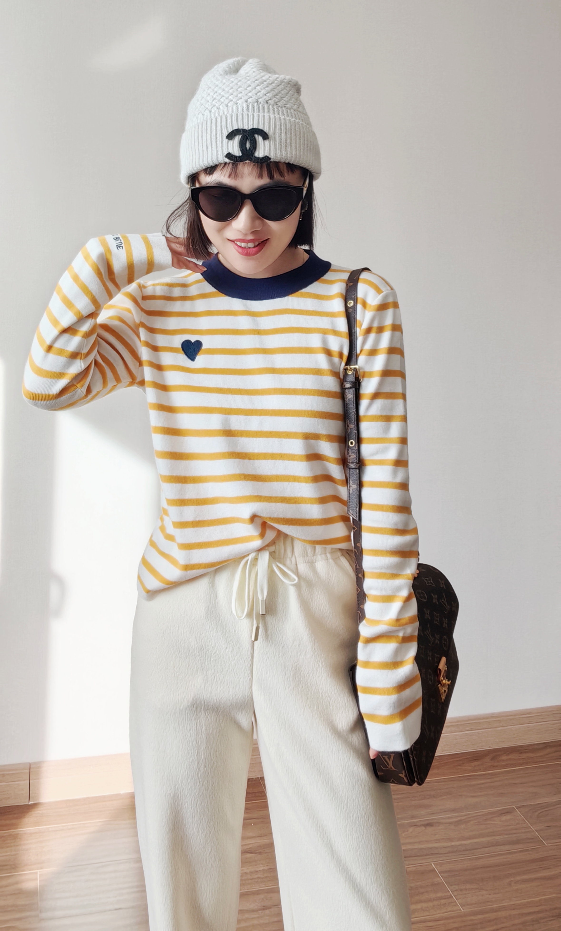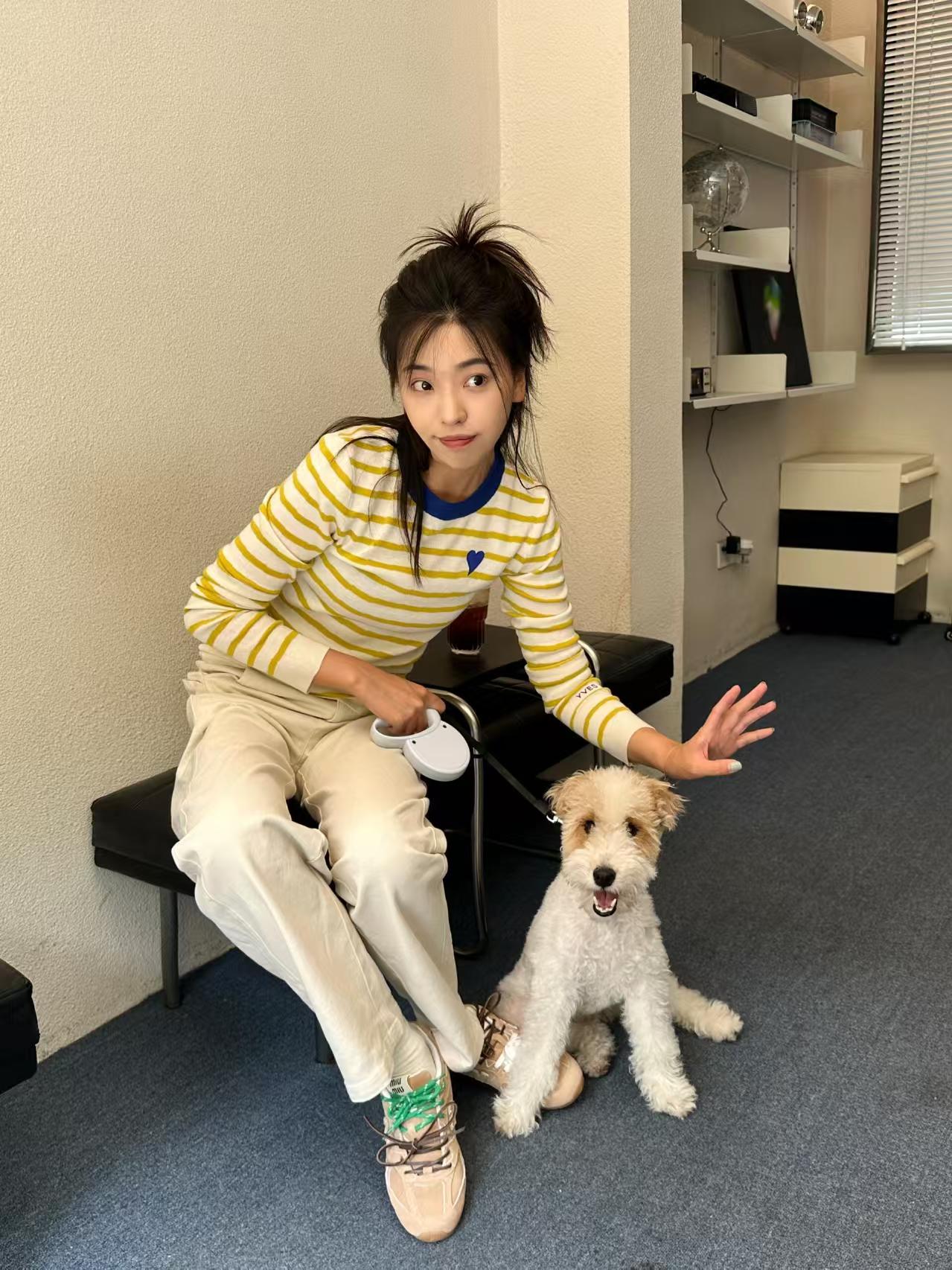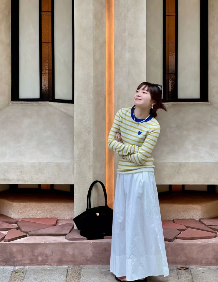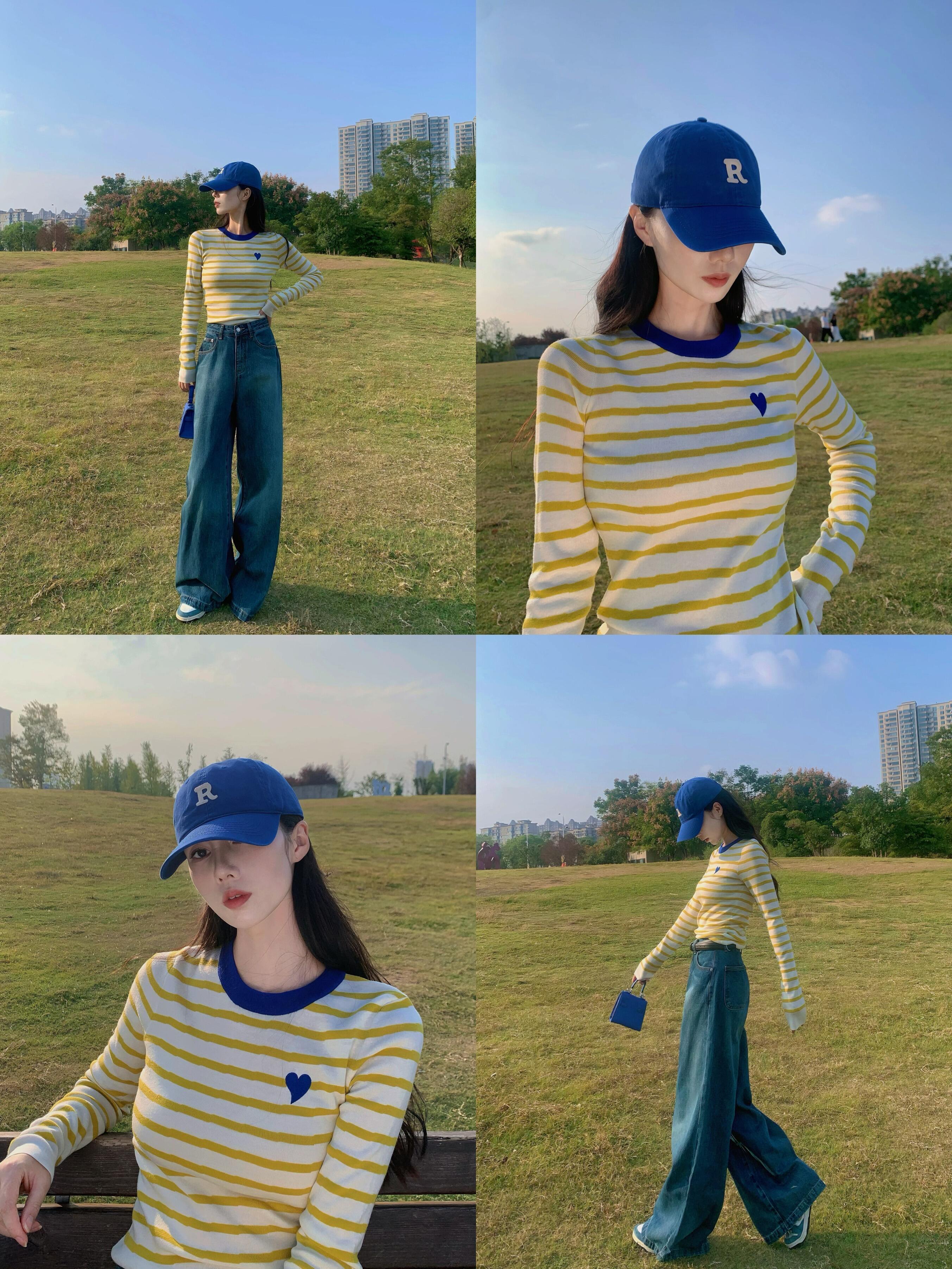 ✅亮眼条纹,克莱茵兰撞色领口,点亮好心情。