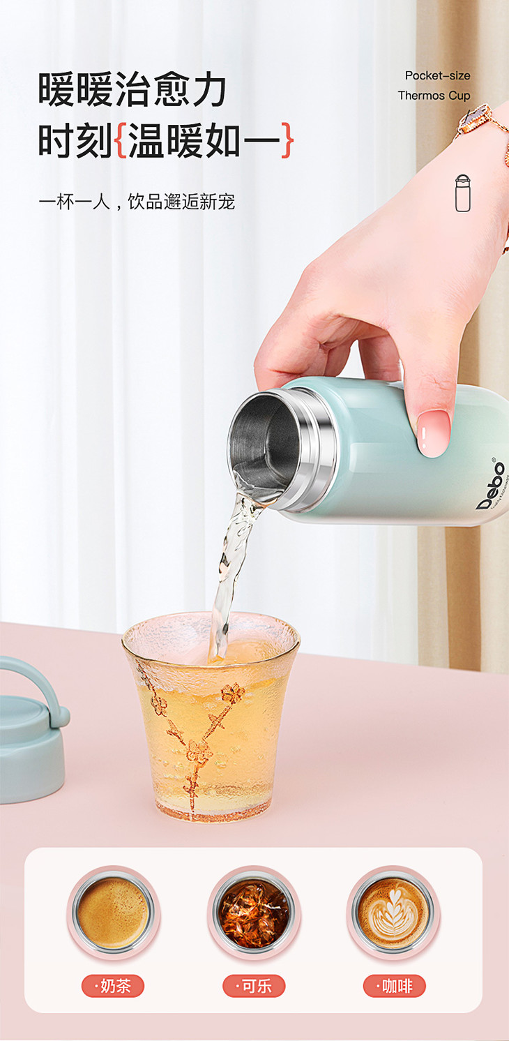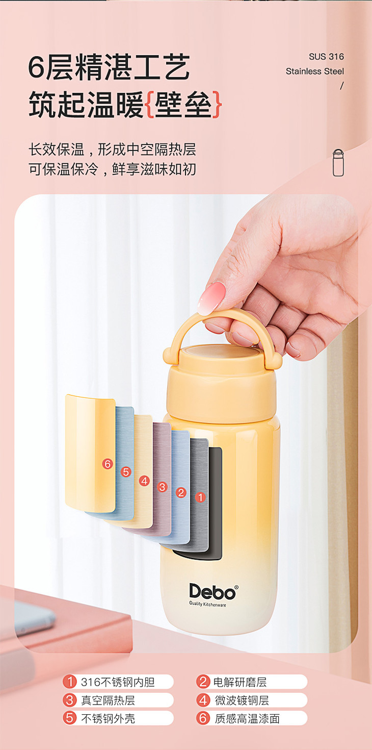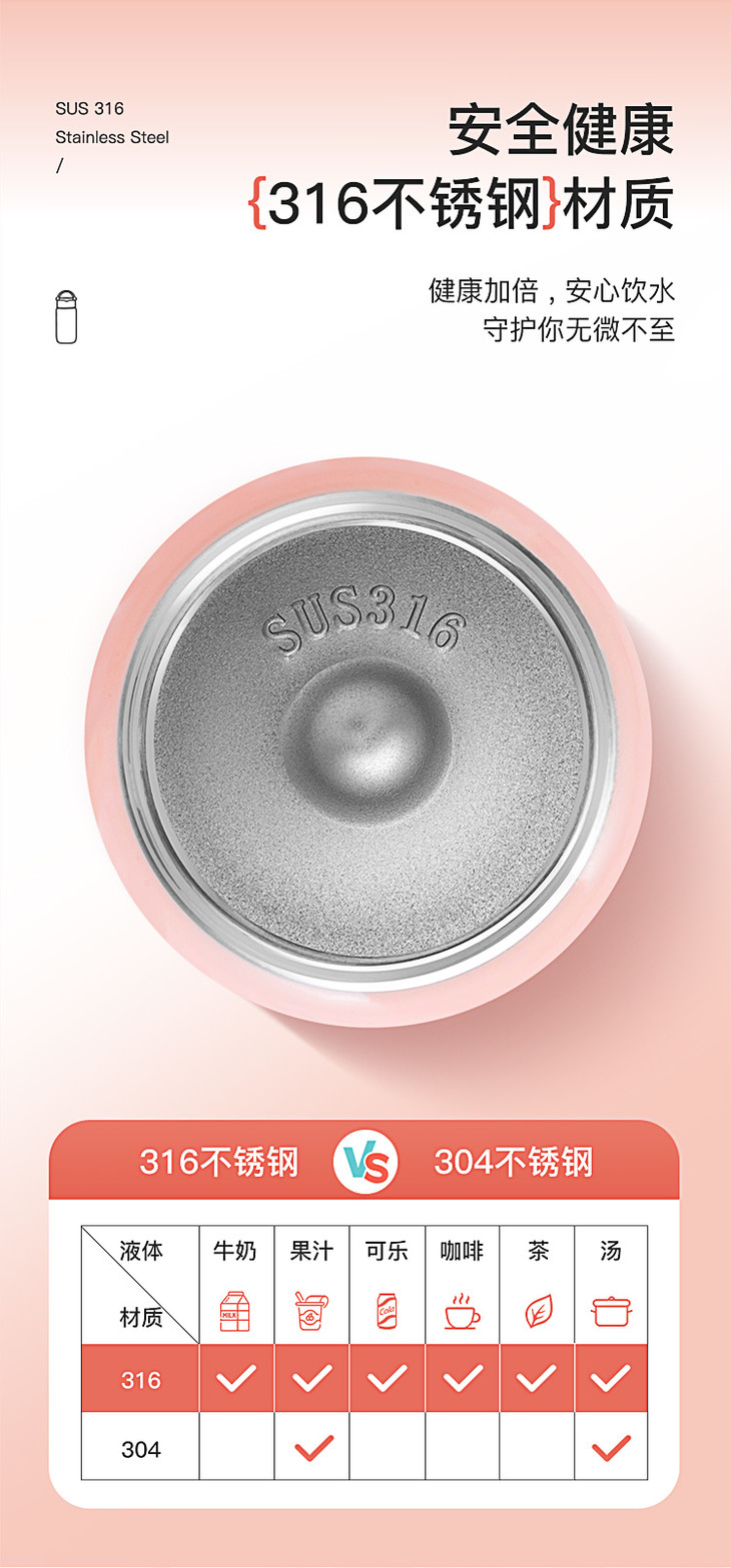 德铂Debo迷你熊保温杯,用的是食品级316不锈钢材质,比普通的304不锈钢更加耐腐蚀、耐高温,抗氧化、不易滋生细菌。可乐、咖啡、茶以及养生汤等含盐分或酸性的液体,都可以随便装。加上6层锁温工艺,无论是寒冬的热饮还是夏日的冷饮,都能轻松hold住,保温保冷长达6小时!小细节也是很贴心,弧形饮水口设计不仅贴合唇形,还能防止烫伤;杯盖上的小提手让你在不想放口袋里时也能拎着走;360°密封防漏设计,倒置大力摇晃也不漏水,出行时更加安心!