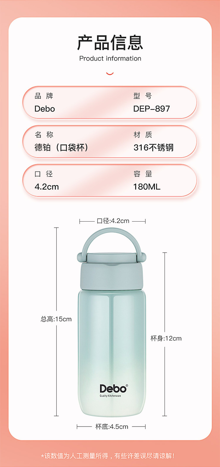 又又又又又来上杯杯杯杯杯了!没有办法,对美丽的杯杯完全没有抵抗力,而且,极其喜新厌旧,总想换!大大保温杯上了很多,这次的德铂Debo迷你杯杯,没想到也打在了我的心趴上,180ml的容量,是可以装进口袋里的,非常非常可爱,而且还有个小小的提手,随时随地都能喝上暖暖的!29.9的价格,也是超美丽了!