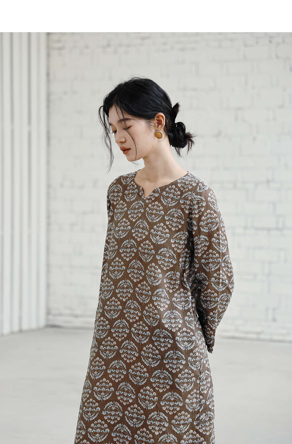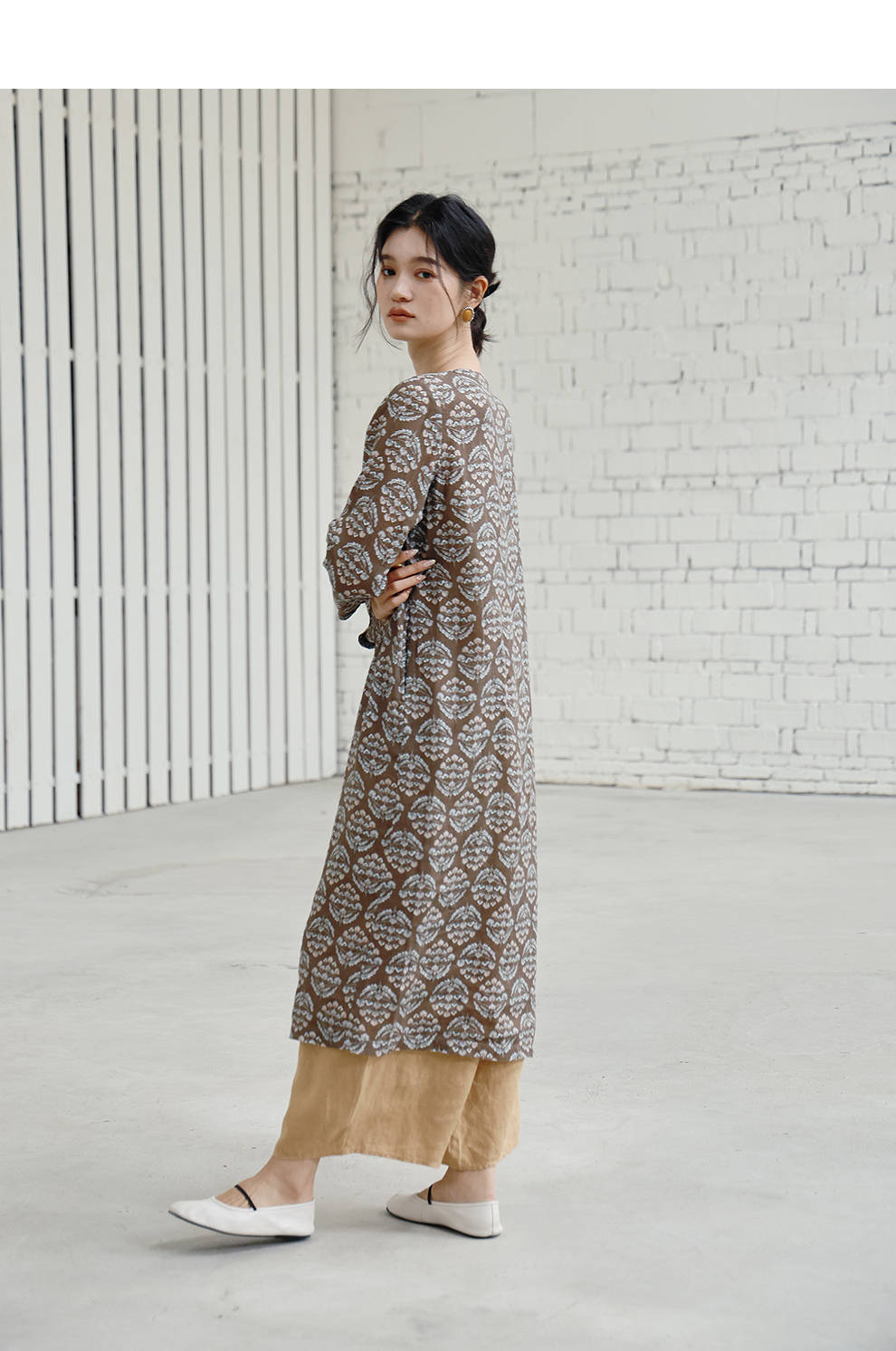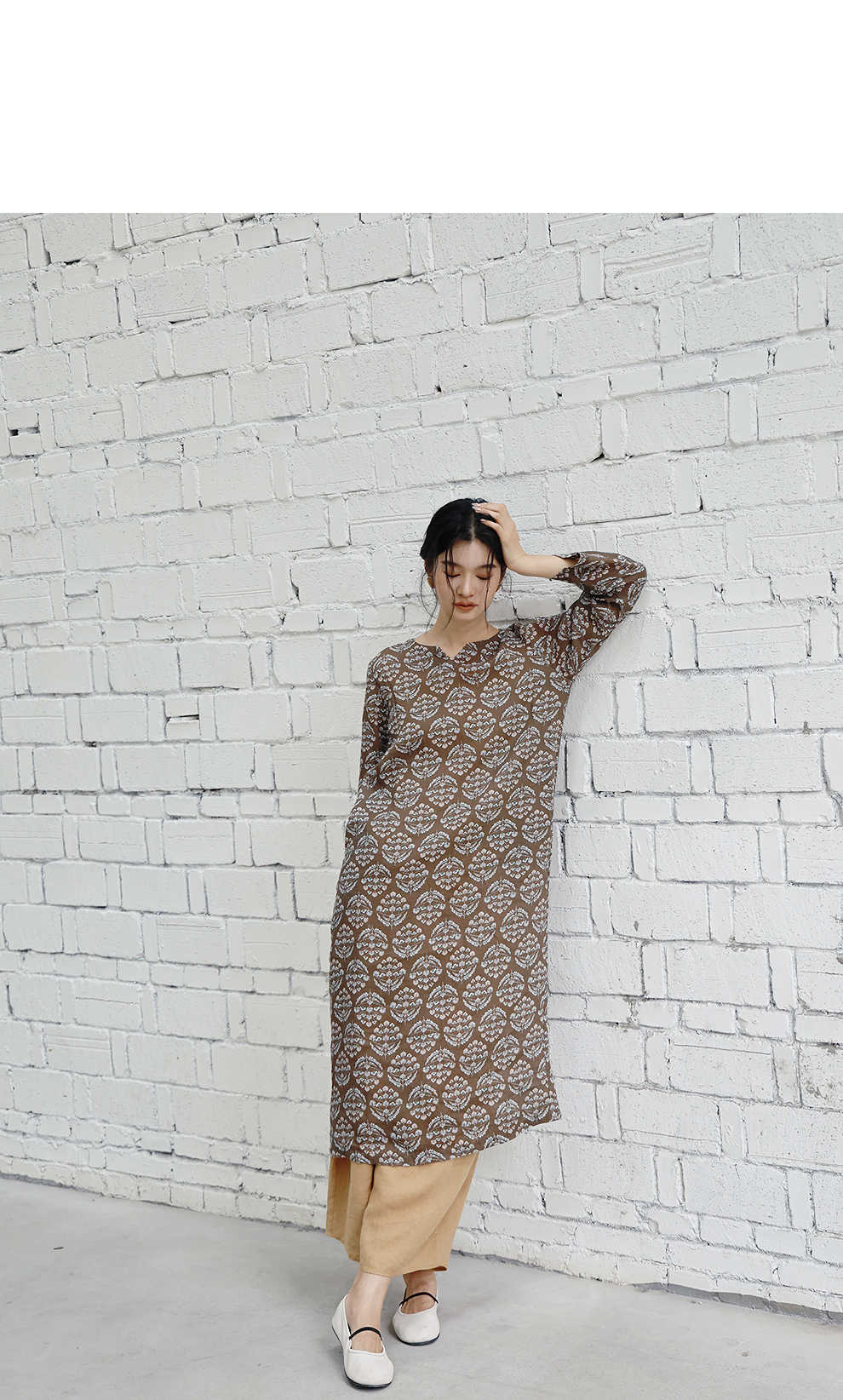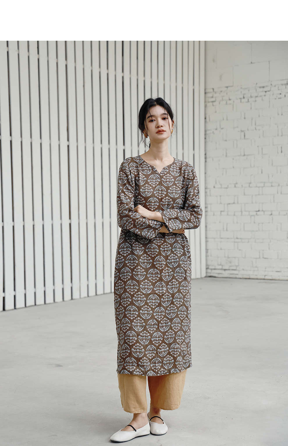 绽放旅行女装412朵/【莫兰迪系列】双支数亚麻底布印花长袖连衣裙