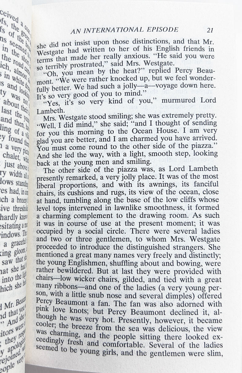 At the little town of Vevey, in Switzerland, there is a particularly comfortable hotel; there are indeed many hotels, since the entertainment of tourists is the business of the place, which, as many travellers will remember, is seated upon the edge of a remarkably blue lake —a lake that it behoves every tourist to visit. The shore of the lake presents an unbroken array of establishments of this order, of every category, from the “grand hotel” of the newest fashion, with a chalk-white front, a hundred balconies, and a dozen flags flying from its roof, to the small Swiss pension of an elder day, with its name inscribed in German-looking lettering upon a pink or yellow wall and an awkward summer-house in the angle of the garden. One of the hotels at Vevey, however, is famous, even classical, being distinguished from many of its upstart neighbours by an air both of luxury and of maturity. In this region, through the month of June, American travellers are extremely numerous; it may be said indeed that Vevey assumes at that time some of the characteristics of an American watering-place. There are sights and sounds that evoke a vision, an echo, of Newport and Saratoga. There is a flitting hither and thither of “stylish” young girls, a rustling of muslin flounces, a rattle of dance-music in the morning hours, a sound of high-pitched voices at all times. You receive an impression of these things at the excellent inn of the “Trois Couronnes,” and are transported in fancy to the Ocean House or to Congress Hall. But at the “Trois Couronnes,” it must be added, there are other features much at variance with these suggestions: neat German waiters who look like secretaries of legation; Russian princesses sitting in the garden; little Polish boys walking about, held by the hand, with their governors; a view of the snowy crest of the Dent du Midi and the picturesque towers of the Castle of Chillon.