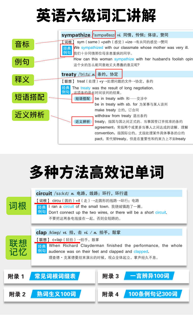 2.四个附录,包括常见词根词缀表、熟词生义100词、一言辨异100词、100条例句记300词;