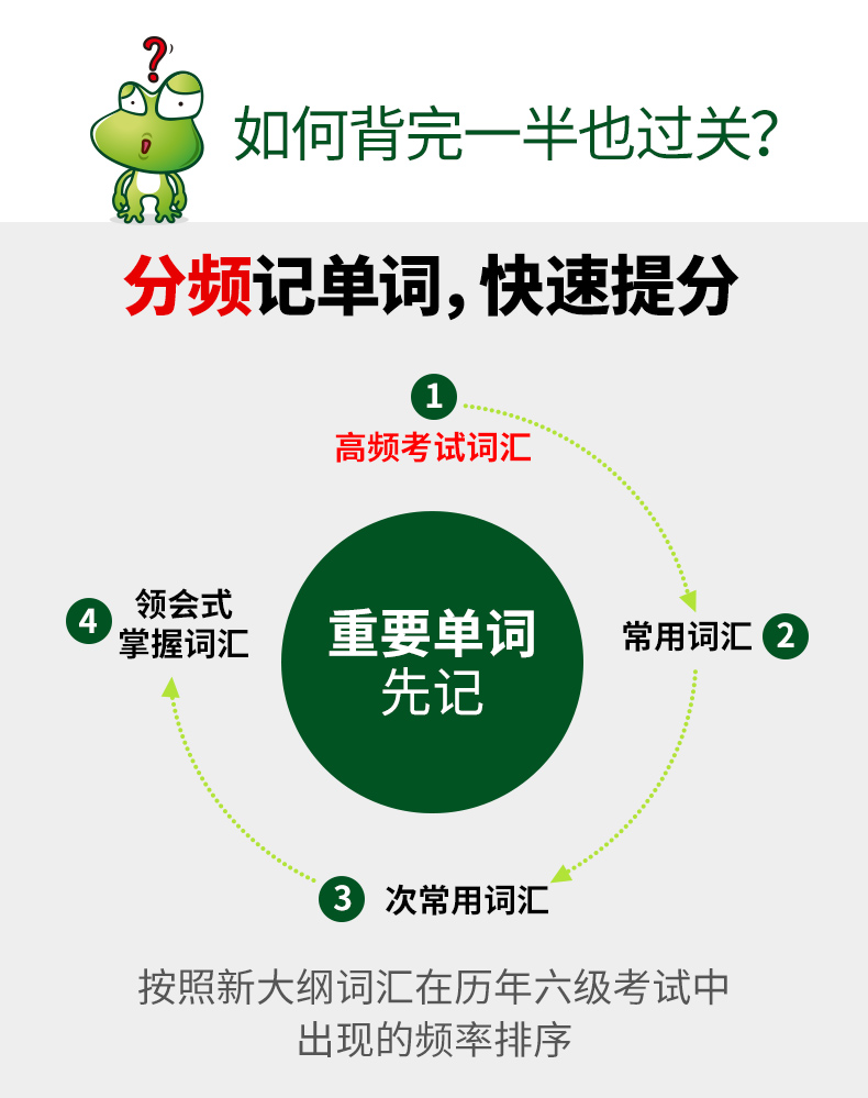 2.采用电脑分频的英语六级词汇书,按照大纲词汇在历年六级考试中出现的频率排序,重要的单词先记;科学乱序编排英语六级词汇,杜绝形近词干扰,帮助考生快速提分;