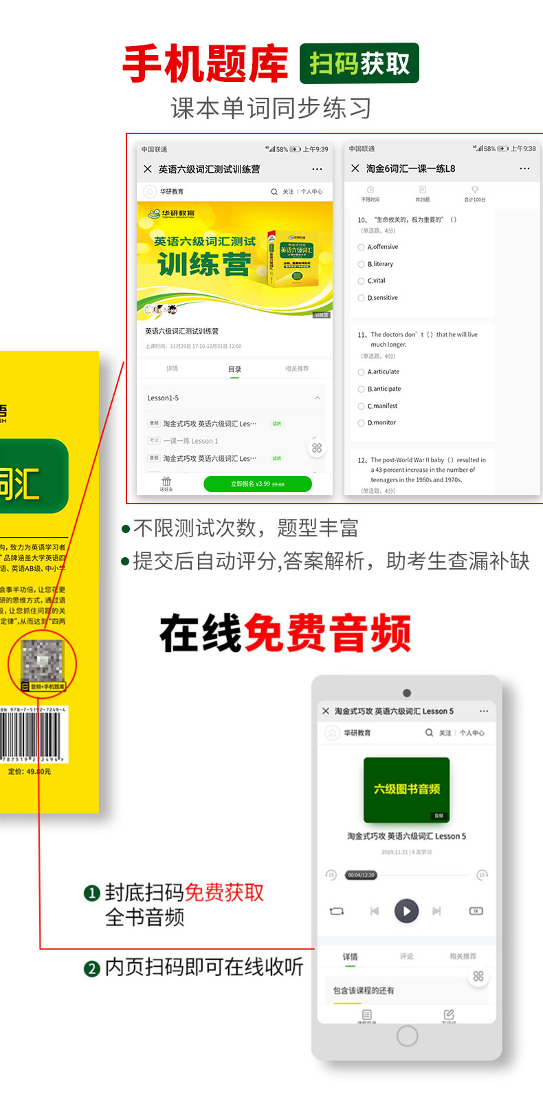 5.扫描每课首页二维码,可获取手机题库测试,课本单词同步测试;不限测试次数,题型丰富,提交后自动评分,并配有答案解析,助考生查漏补缺;