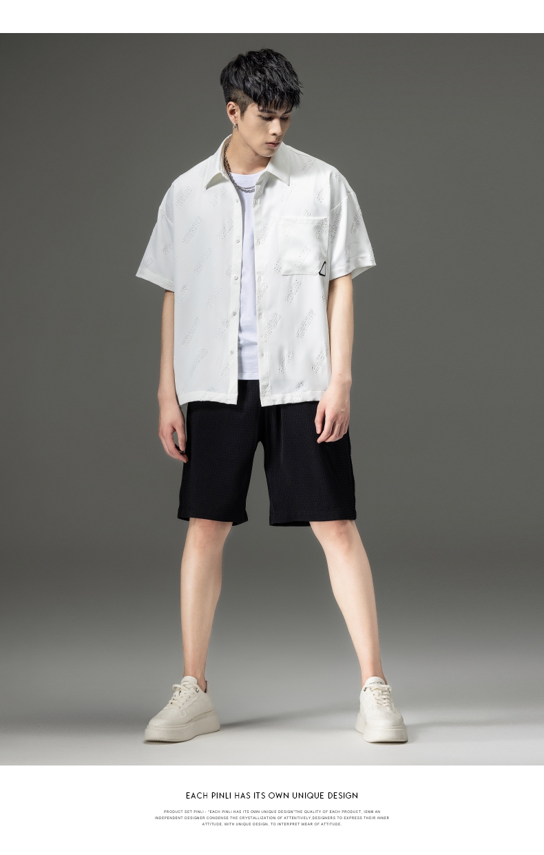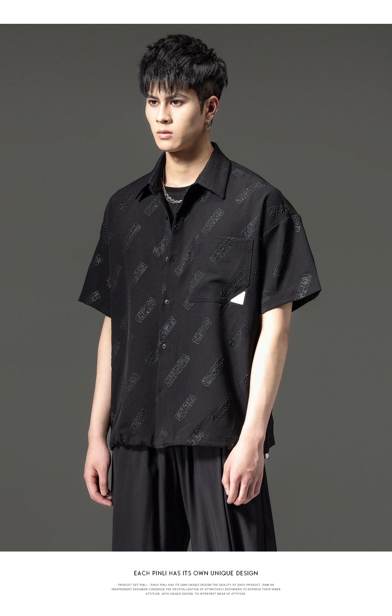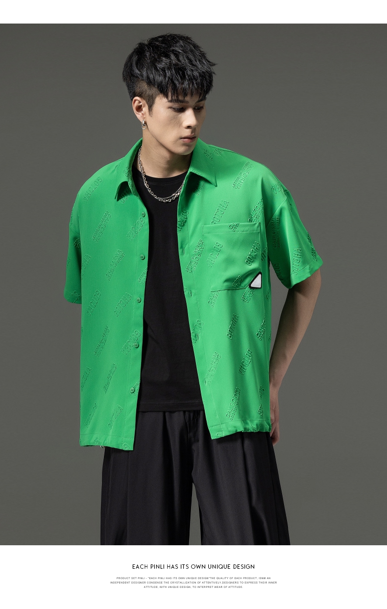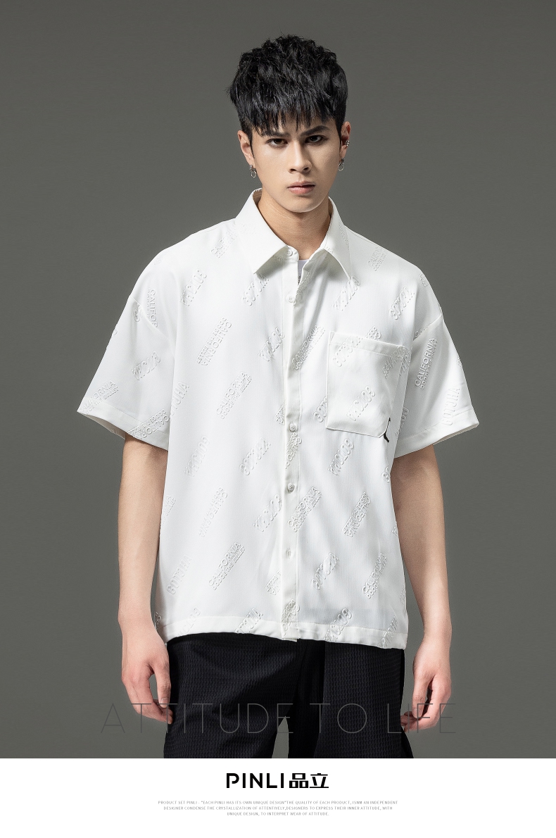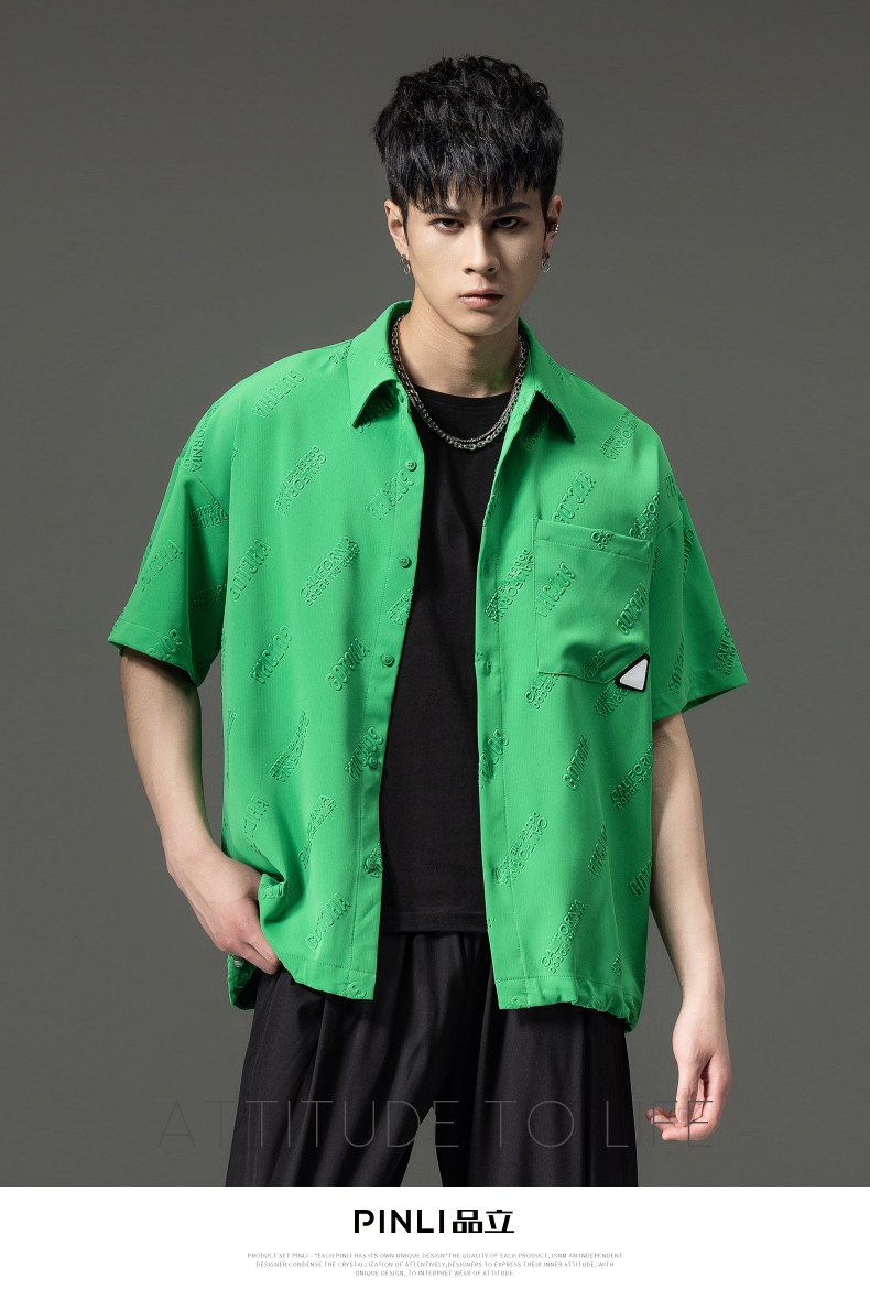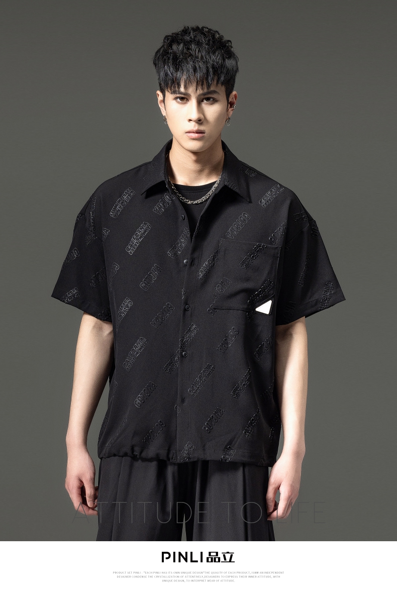 PINLI品立夏季新款纯色翻领衬衫潮牌字母短袖衬衣休闲男上衣B232113026