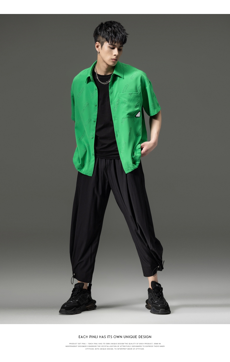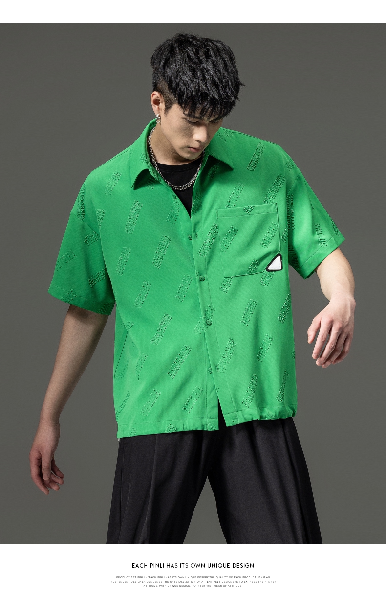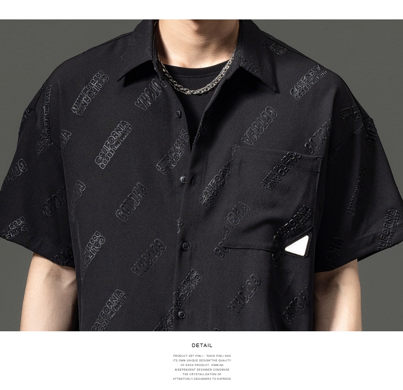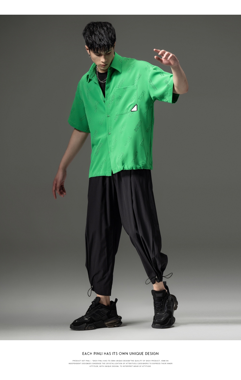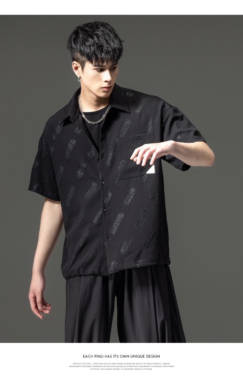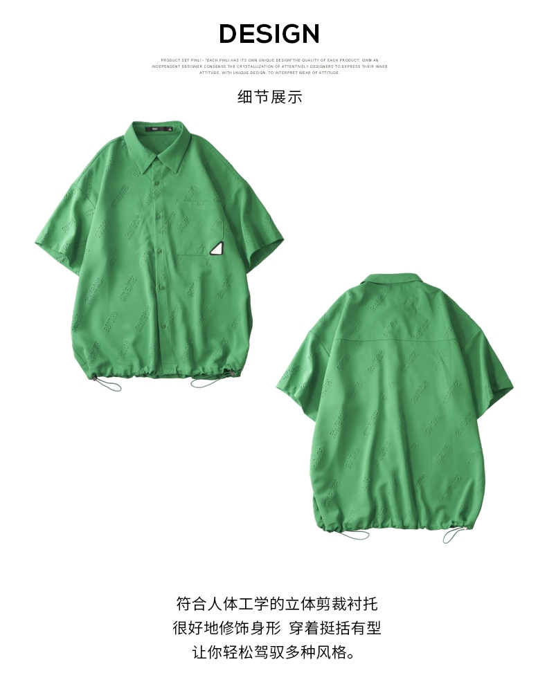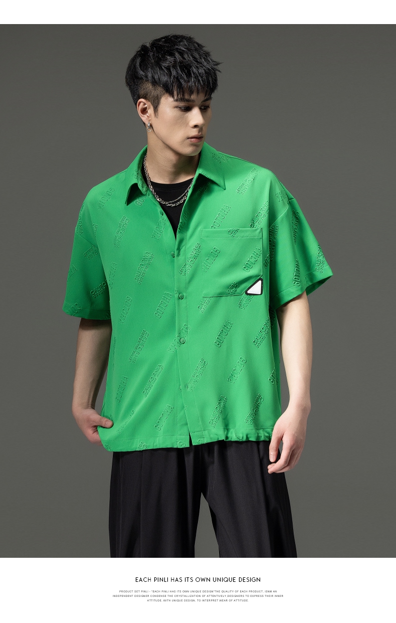 PINLI品立夏季新款纯色翻领衬衫潮牌字母短袖衬衣休闲男上衣B232113026