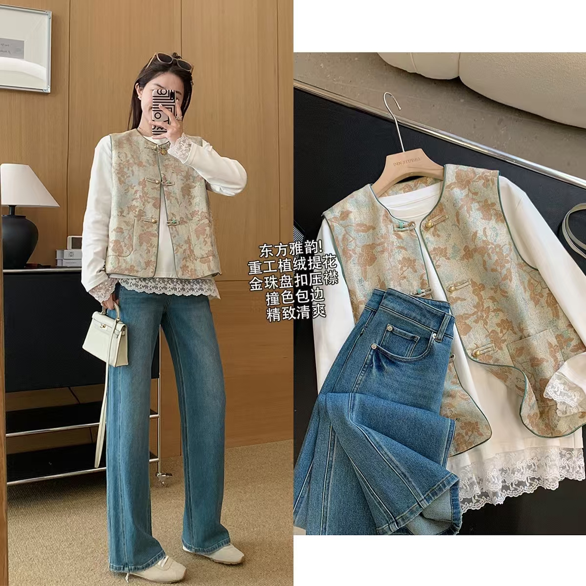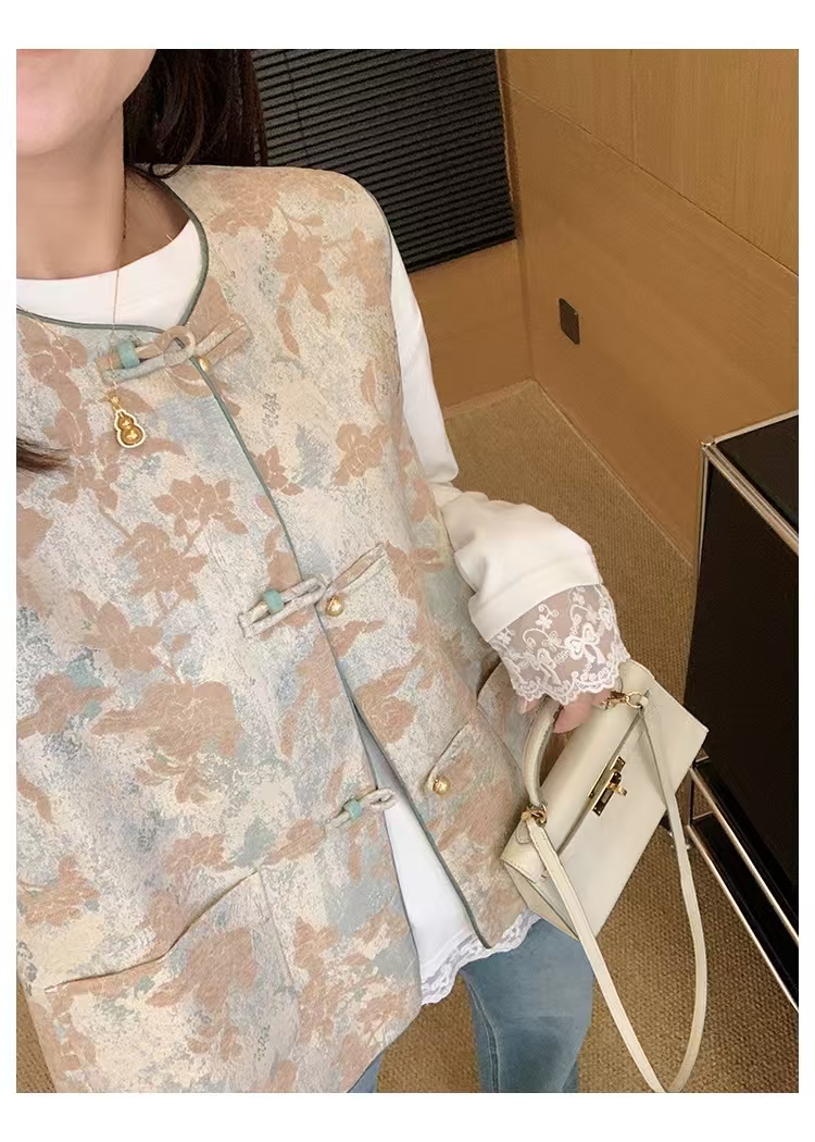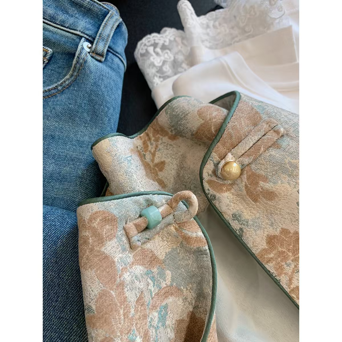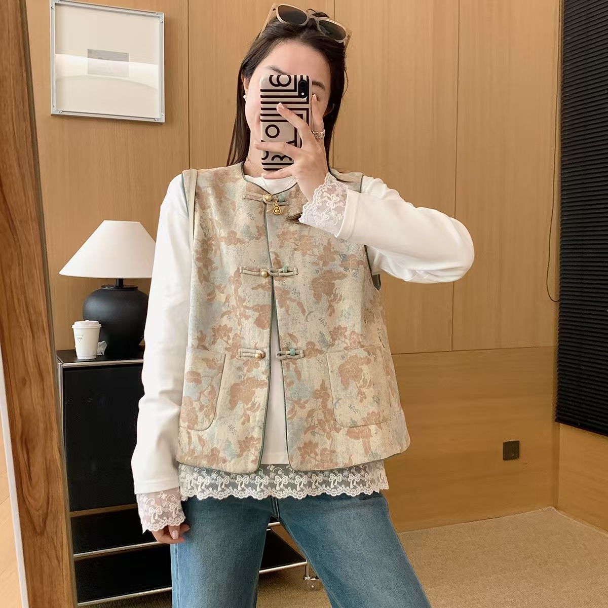 东方雅韵重工植绒提花盘扣压襟背心马甲!