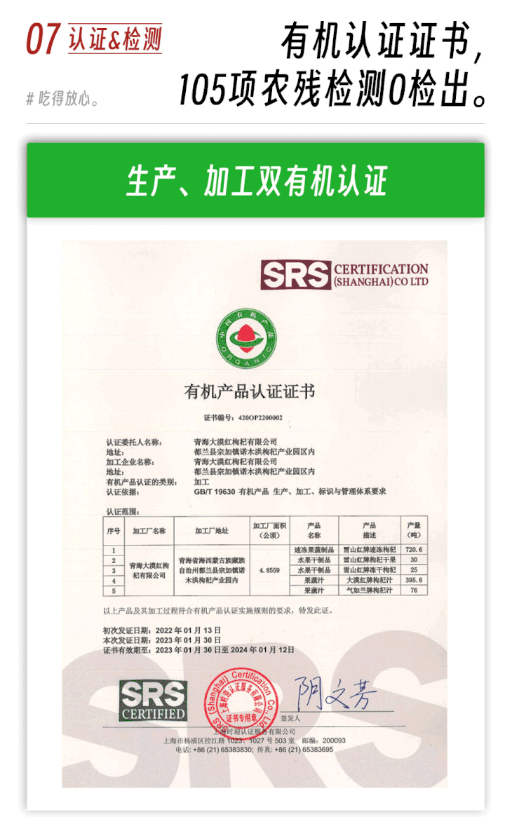 【净含量】250g 【原料】有机鲜枸杞 【产品种类】低温干燥枸杞 【产地】青海省柴达木盆地 【贮存条件】请置于阴凉、干燥、通风良好处保存 【生产日期】见包装 【保质期】密封18个月,开封后请尽快食用 【食用禁忌】 1、外邪实热,脾虚有湿及泄泻者不建议食用枸杞。 2、由于枸杞温热身体的效果相当强,正在感冒发热、身体有炎症的人不建议食用枸杞。 3、患有高血压病、性情太过急躁的人,或平日大量摄取肉类导致面泛红光的人不建议食用枸杞。 4、虚寒的人服用会有滑脱泄泻之弊,有内热未清者慎用。