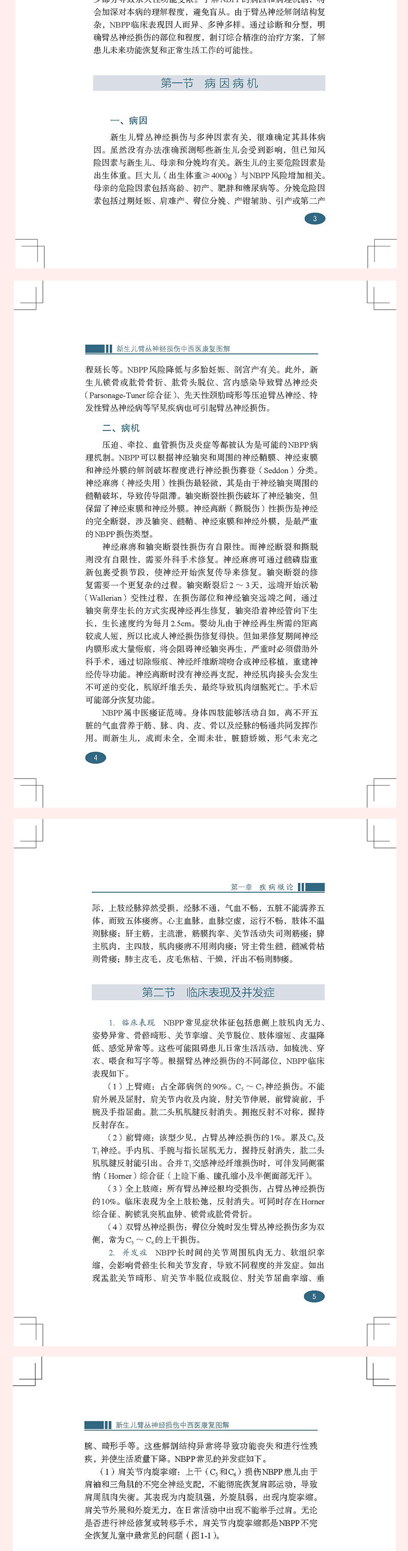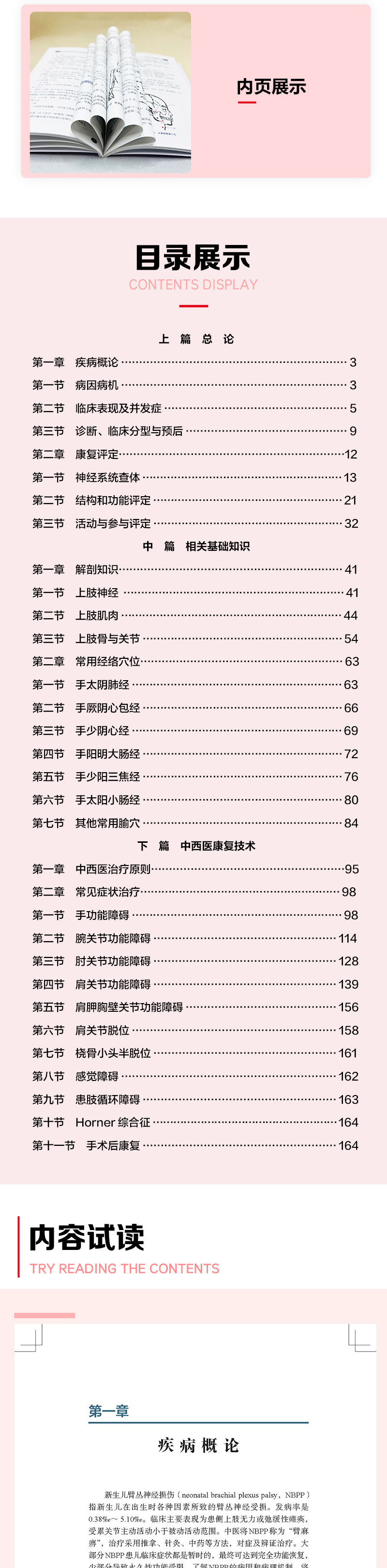 本书内容分为上、中、下三篇。上篇总论主要包括了疾病概论和常用的康复评定。帮助医务人员认识本病,了解相应的临床查体、诊断方法以及评定手段。中篇为新生儿臂丛神经损伤的中西医康复治疗原则和方法。按照患肢功能受限的部位,采用中医按摩、针灸,西医康复训练进行治疗。图文结合,重点技术配有视频指导,方便读者学习。下篇的相关基础知识,是中西医治疗的基础,从解剖和经络两方面着重进行介绍。解剖知识围绕臂丛神经分布、上肢肌肉作用、关节活动功能进行了详细叙述。经络内容围绕上肢手三阴经、手三阳经的常用穴位,具体介绍了穴位的定位、穴位解剖和治疗作用。下篇的主要内容采用图文、视频及表格形式呈现,方便读者学习和查阅。