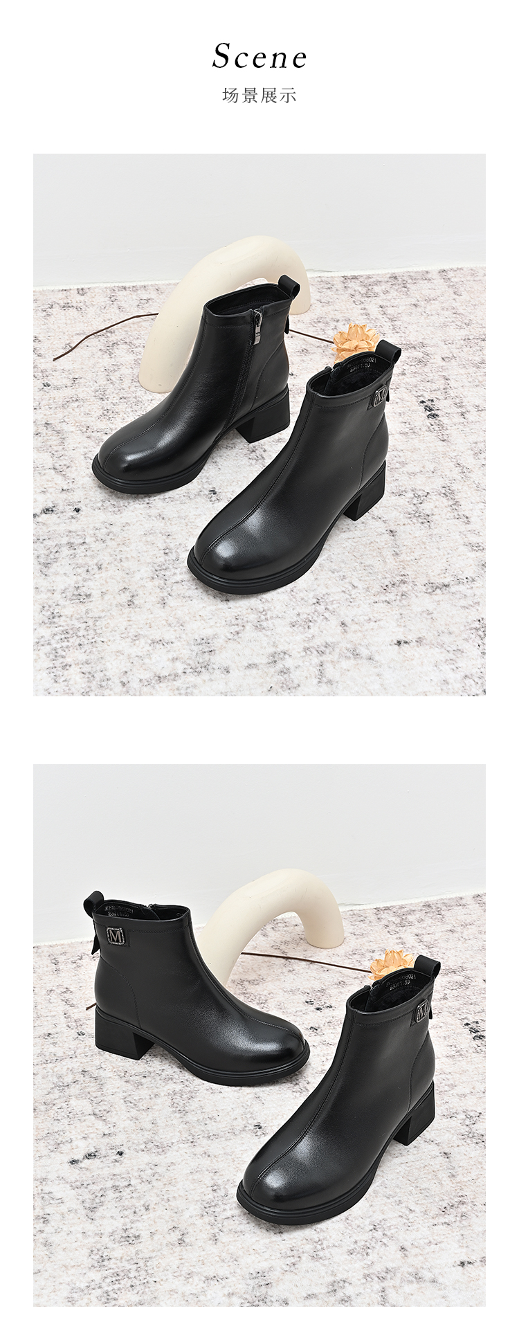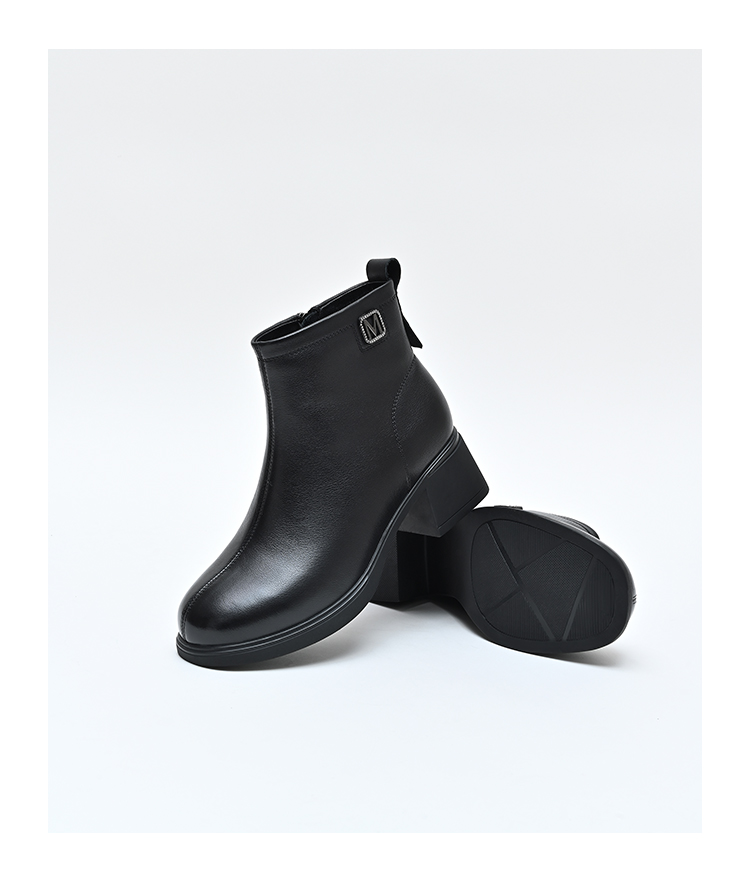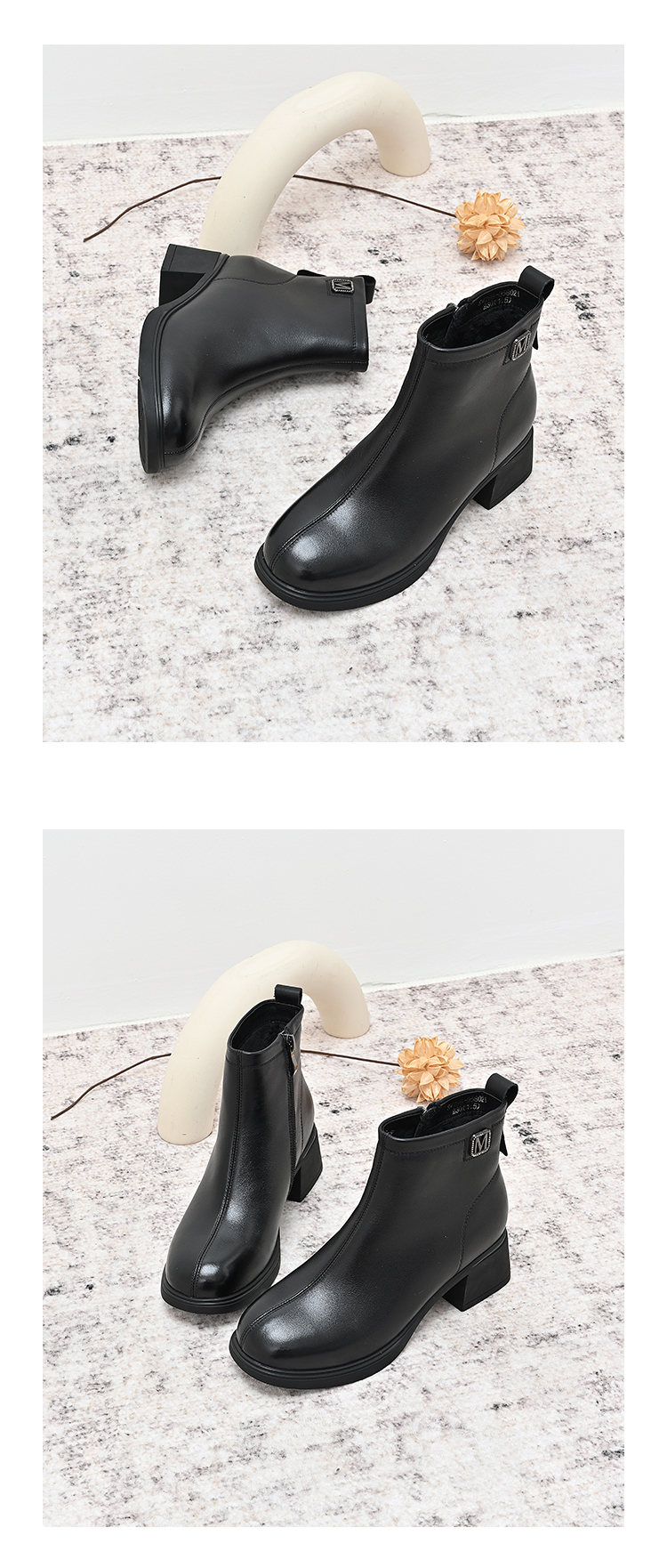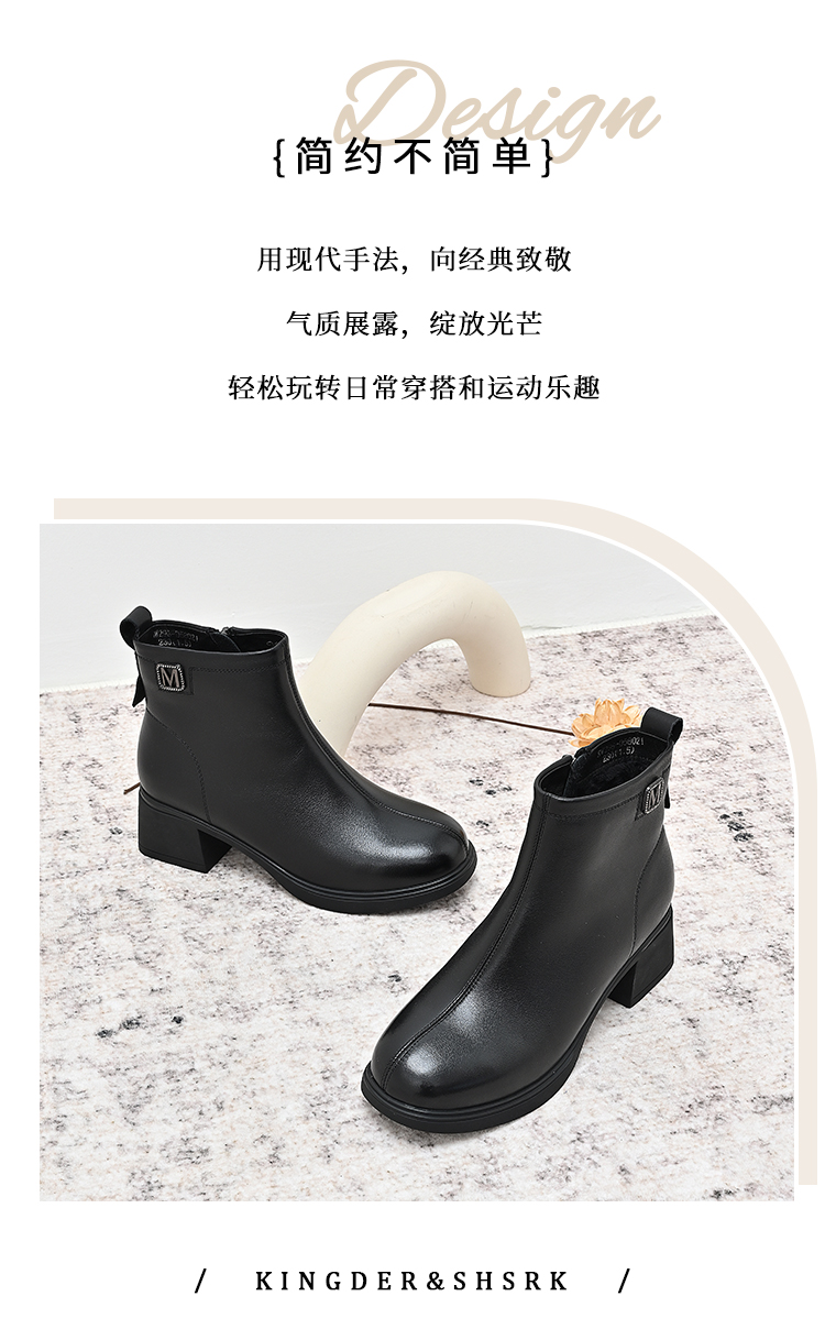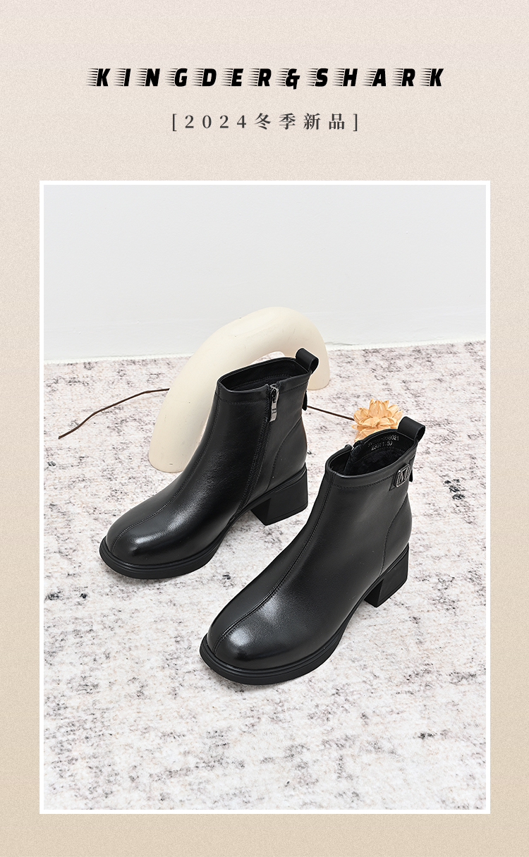 经典鲨2024年冬季新款百搭圆头侧拉链加绒中粗跟时装短靴女KW296-D58021