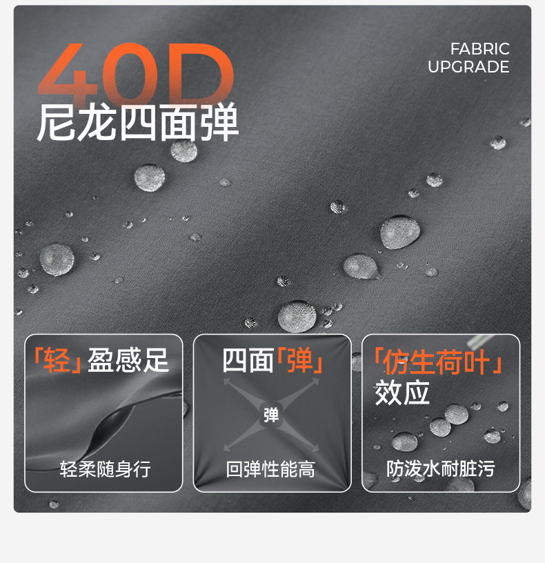 采用了更轻量、肤感更柔软舒适的尼龙四面弹材质,没有传统厚硬外套的约束感。