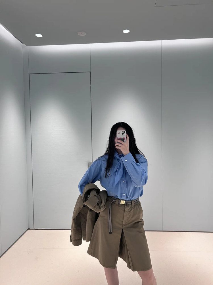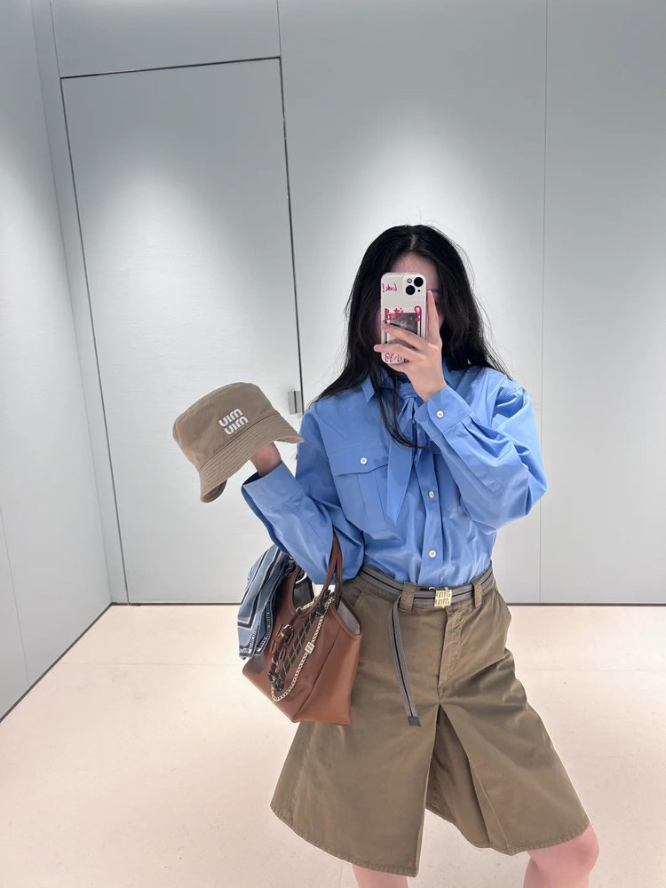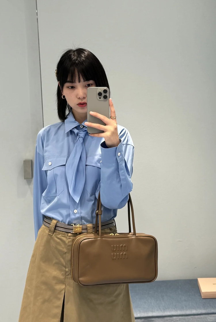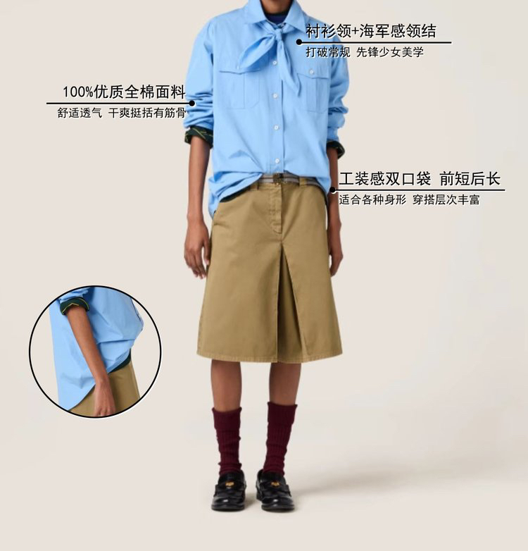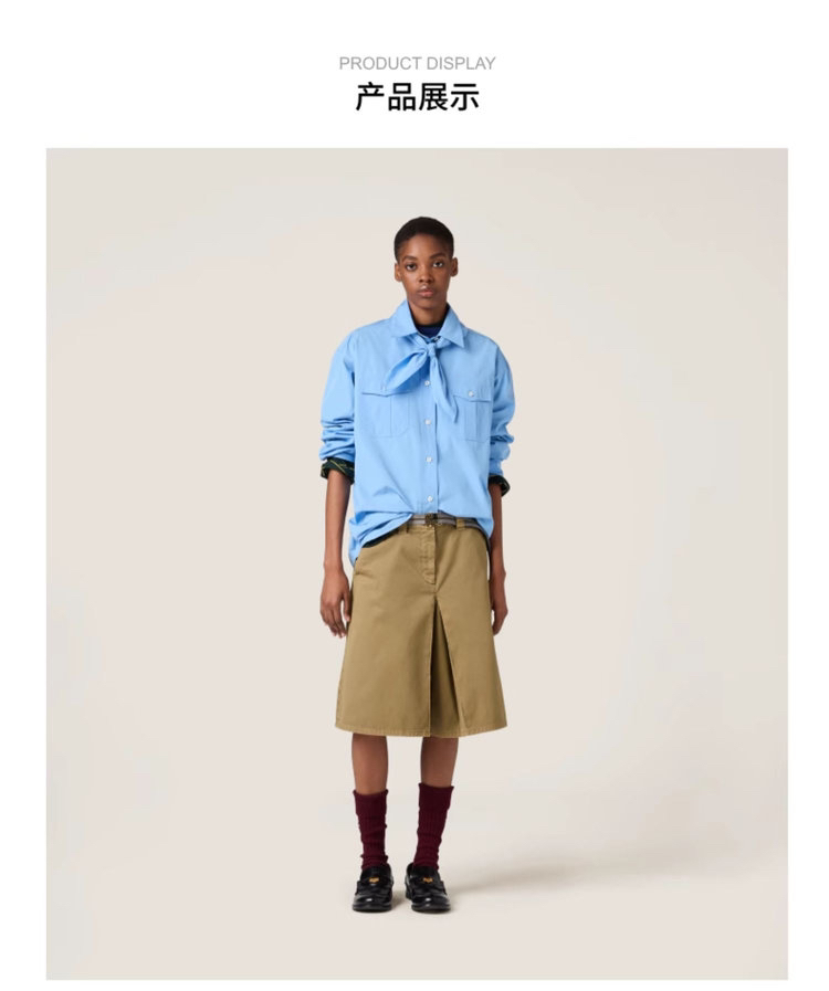 工艺:细节之处见真章,精致藏于毫厘间,MIUMIU 对工艺的执着,在这件衬衫上体现得淋漓尽致。标志性领结设计,以流畅剪裁与精准车线勾勒优雅弧度,海军风领结的灵动与衬衫的利落碰撞出奇妙火花,既保留少女感又不失摩登气场。