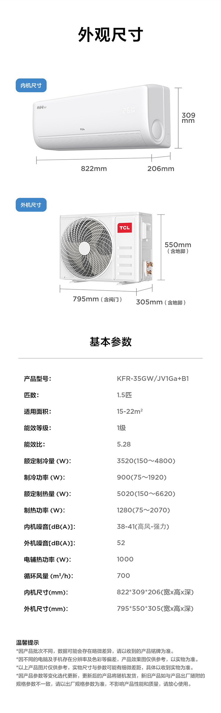 TCL 空调1.5匹小蓝翼真省电Air 空调挂机 超一级能效 省电26% KFR-35GW/JV1Ga+B1