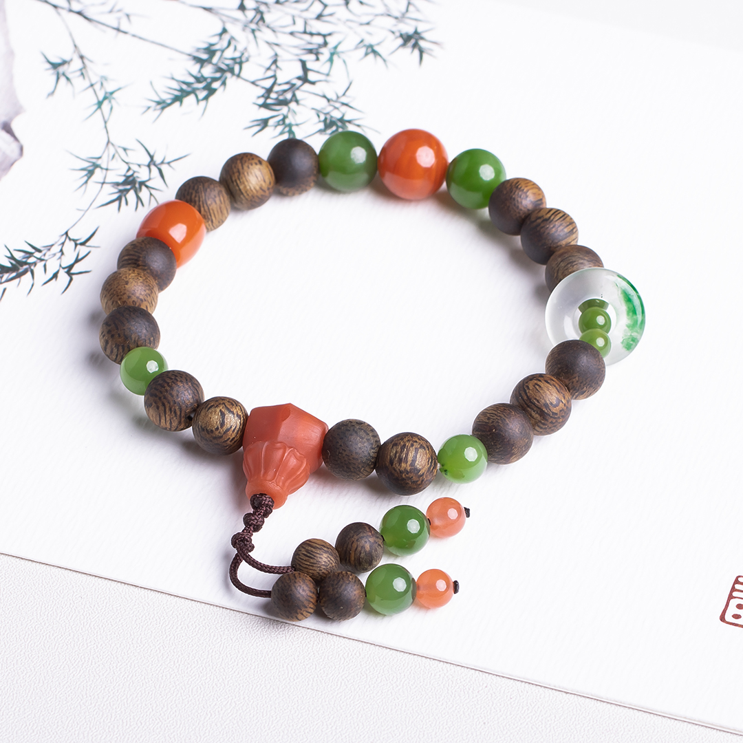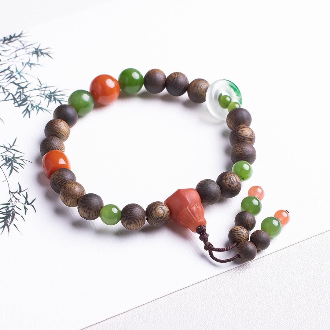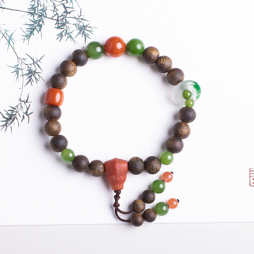 xy0405沉香+南红碧玉转运手串,天然沉香约7.3mm,原色原味,香味自然清甜,经典的红绿吉祥配色,南红与碧玉的结合,色彩祥和,玉质温润细腻,再加一枚冰飘花的非洲翠做跑环点缀,既时尚新颖,轻轻一转,带来好运。