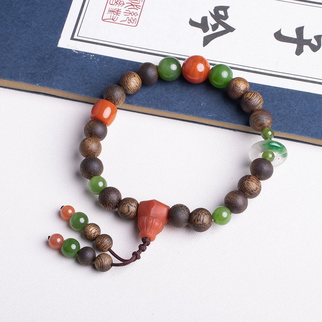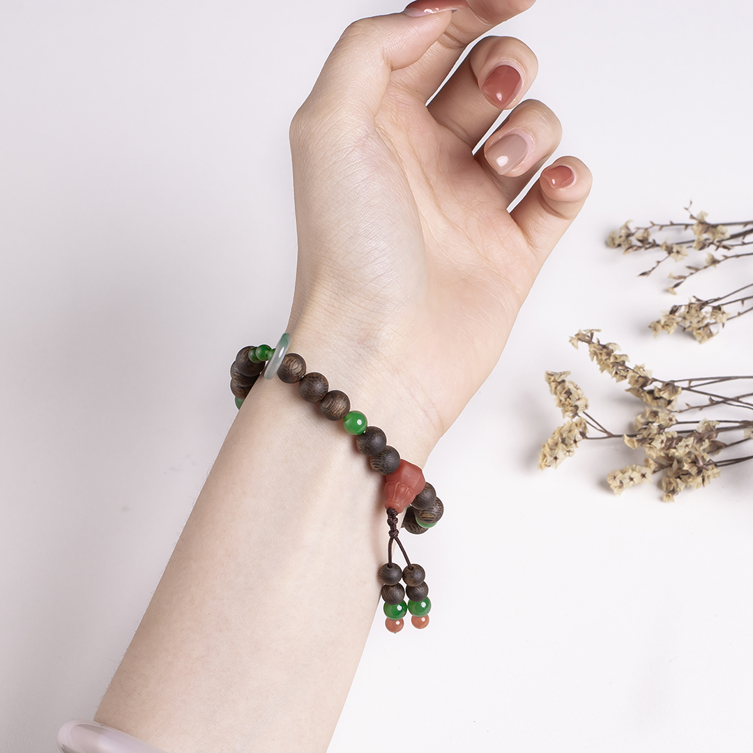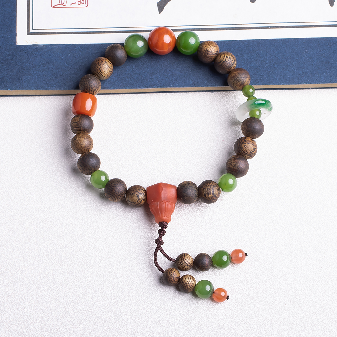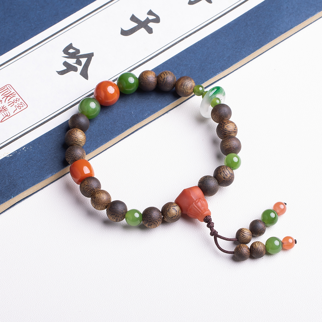 xy0405沉香+南红碧玉转运手串,天然沉香约7.3mm,原色原味,香味自然清甜,经典的红绿吉祥配色,南红与碧玉的结合,色彩祥和,玉质温润细腻,再加一枚冰飘花的非洲翠做跑环点缀,既时尚新颖,轻轻一转,带来好运。