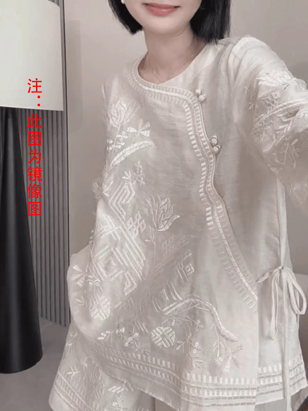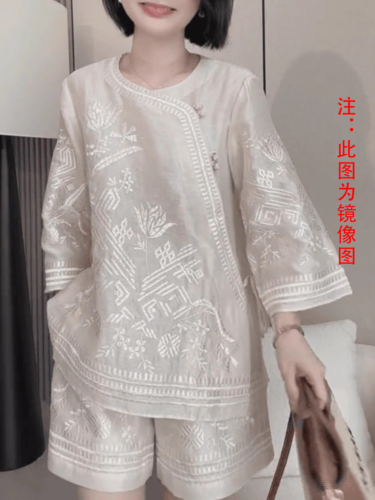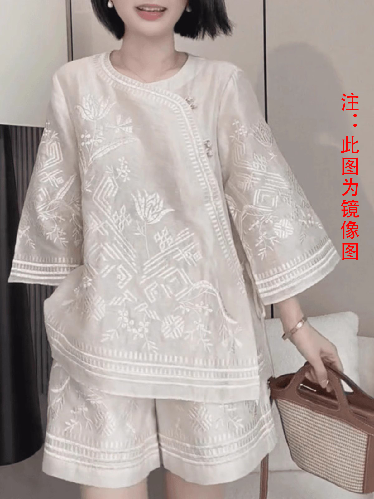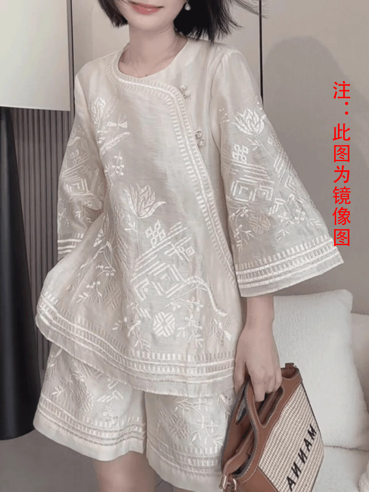 裁缝学苑AS517新中式国风斜襟盘扣衬衫短裤套装纸样女装小衫裤子两件套样板