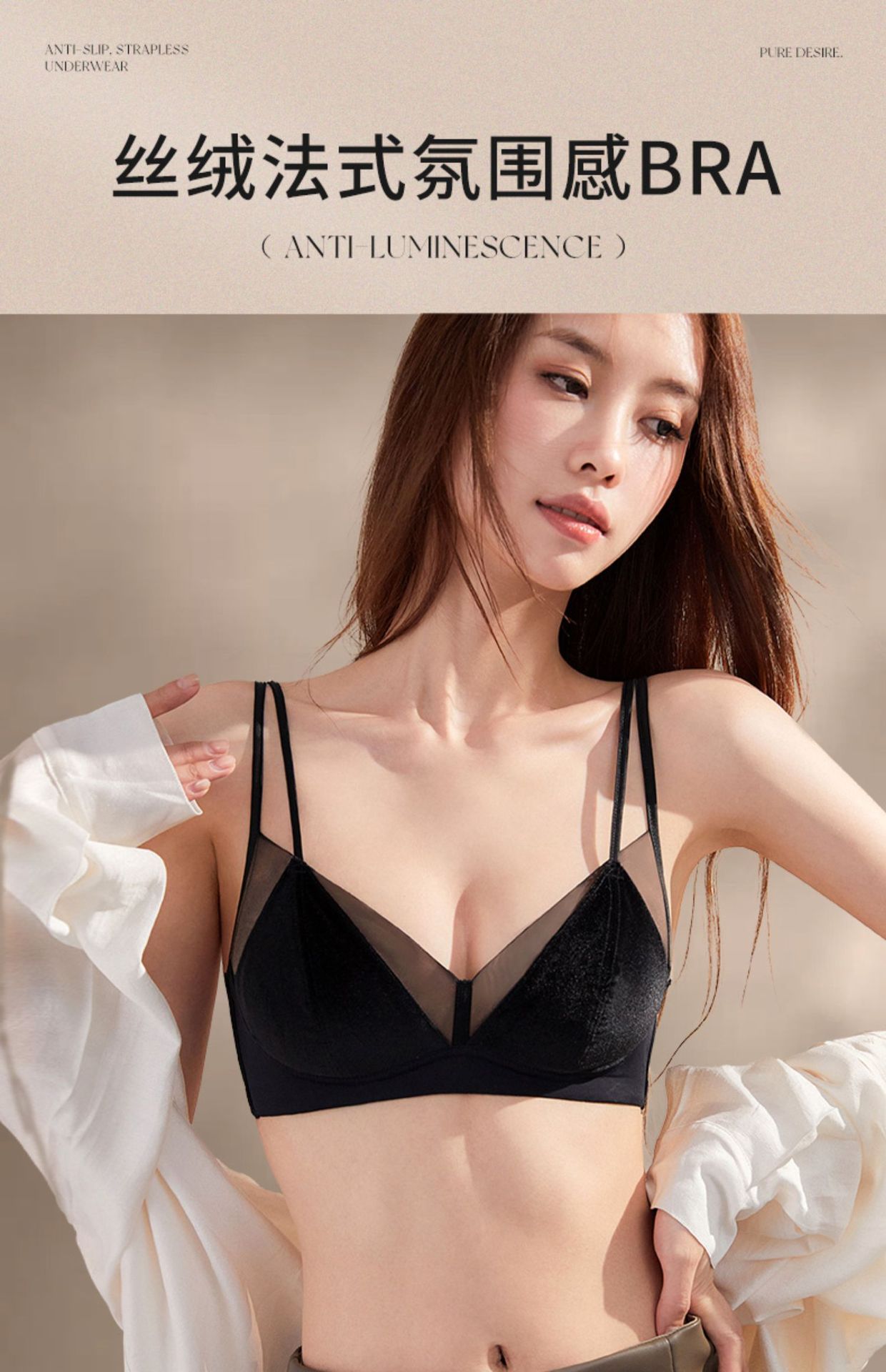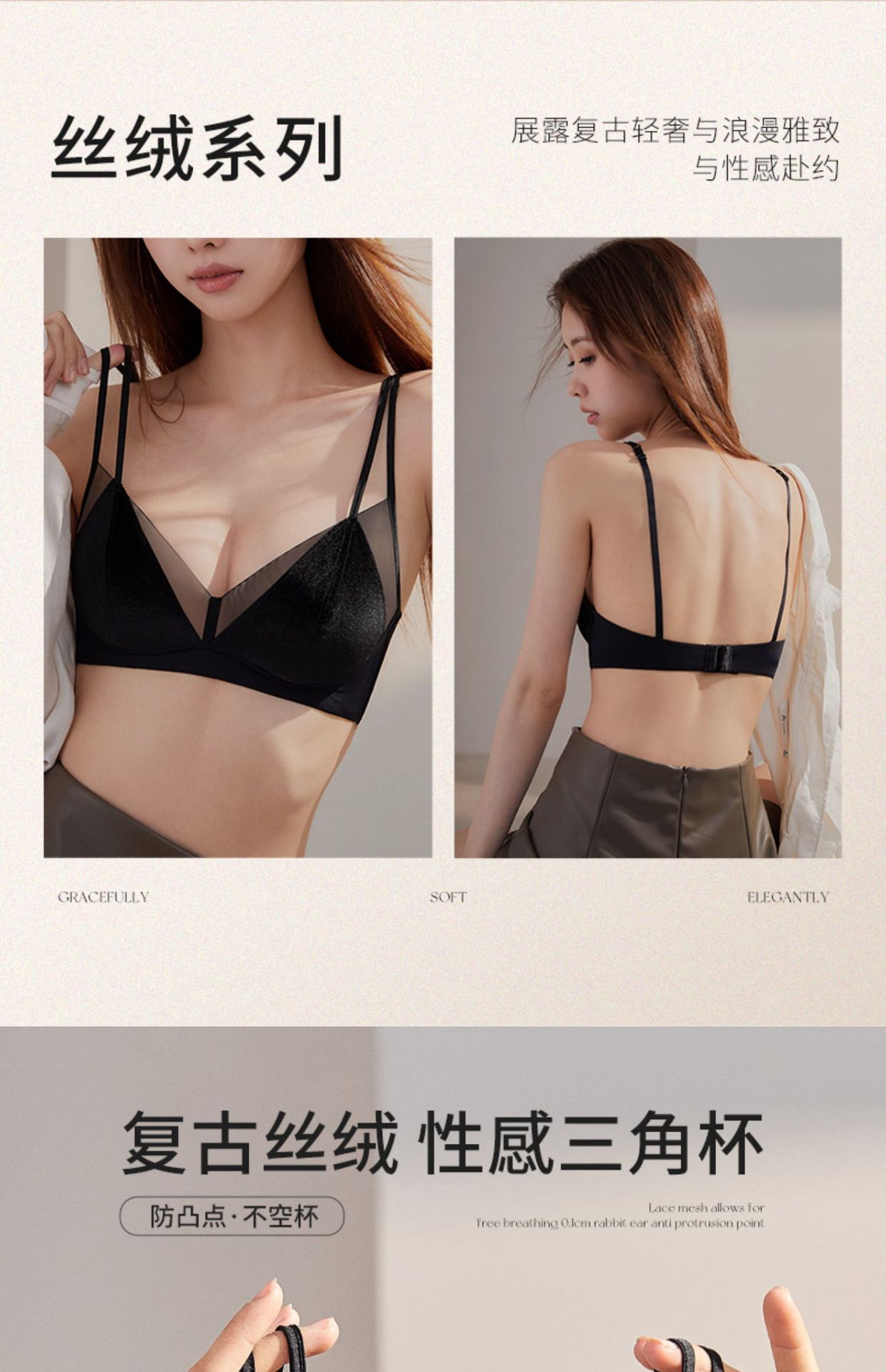 【法式慵懒风❗丝绒光感内衣套装】复古丝绒性感三角杯,裸感轻托自然贴合,稳固承托防下垂,小胸显大聚拢性感薄款防凸兔耳朵细肩带双提拉文胸QQ