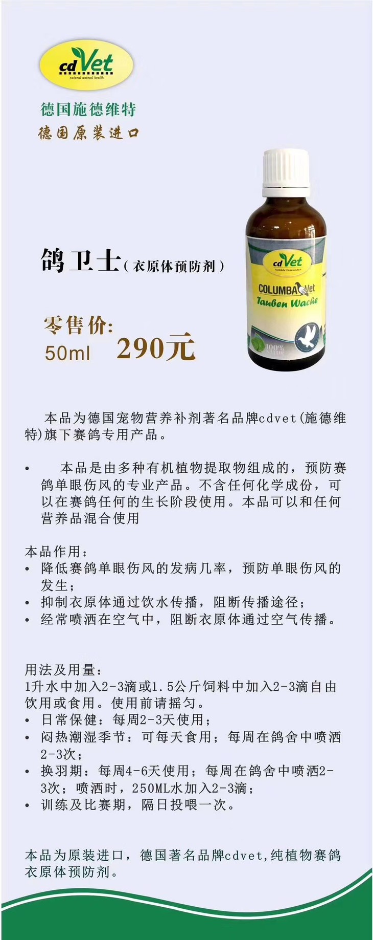 【鸽卫士】(衣原体预防)50毫升/鸽药赛鸽衣原单眼伤风(德国施德维特)