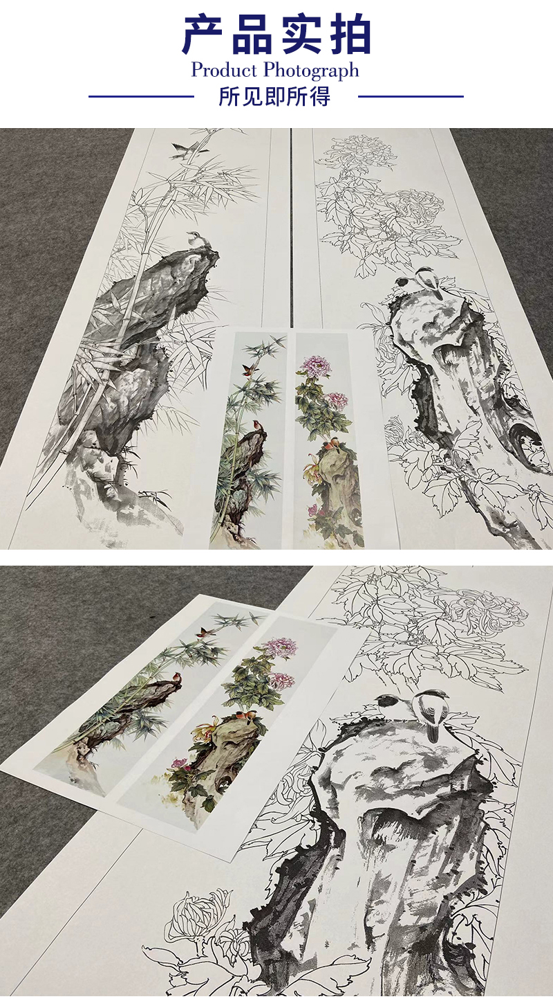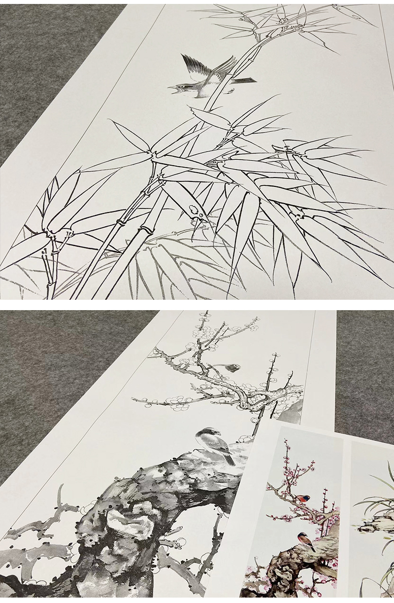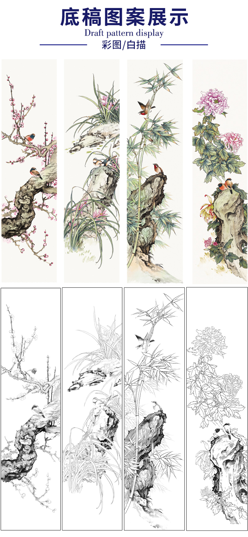【四条屏】陈军工笔画白描底稿桃花树临摹勾线花鸟线稿CJ68
