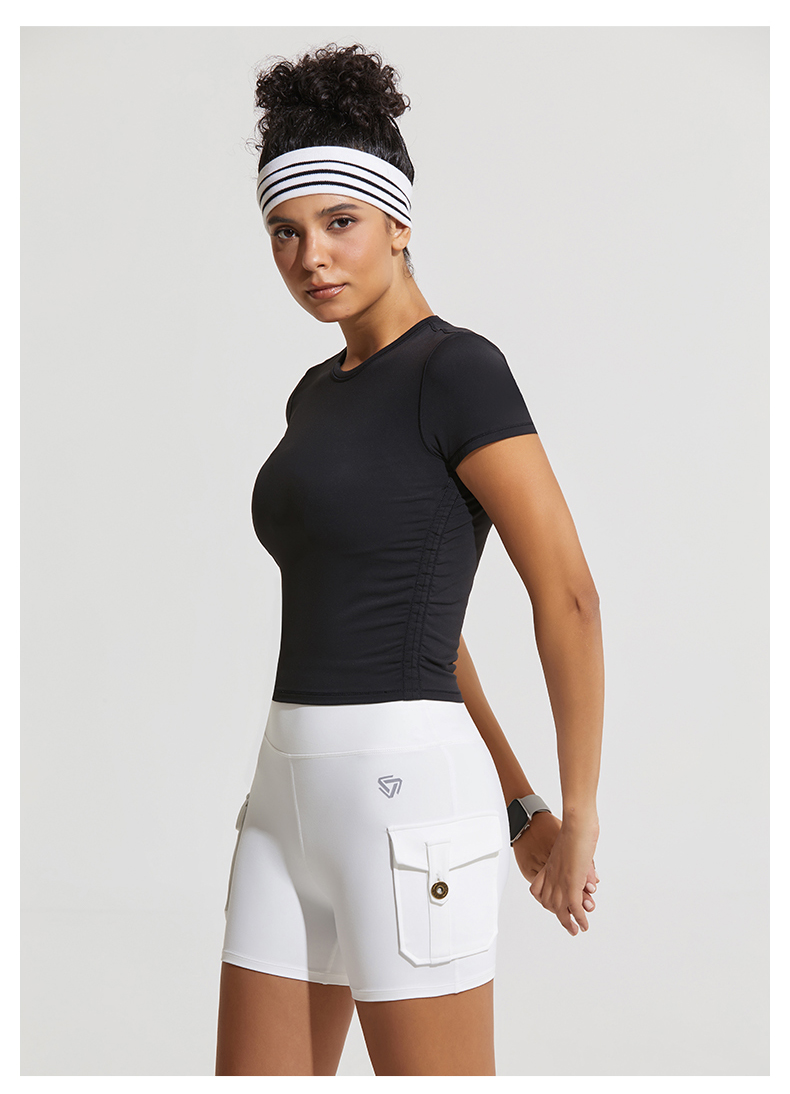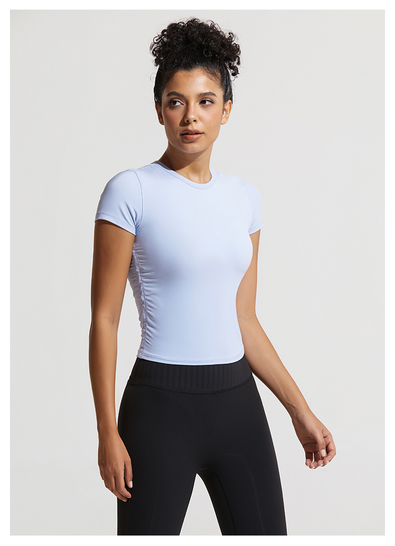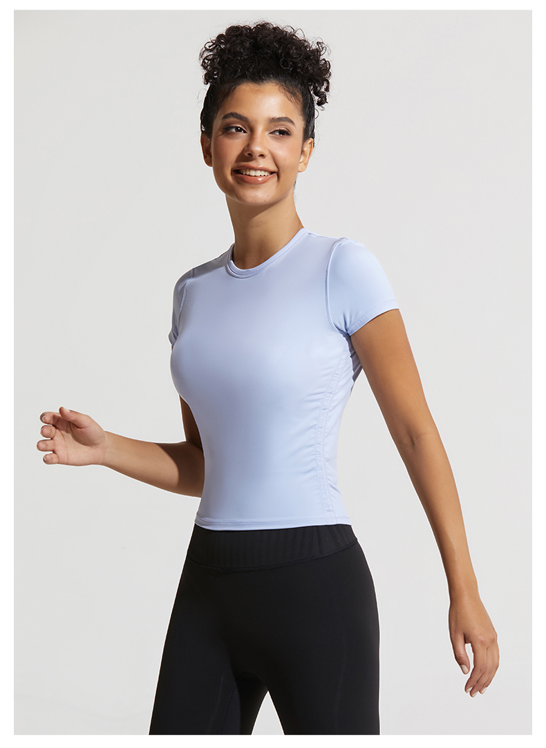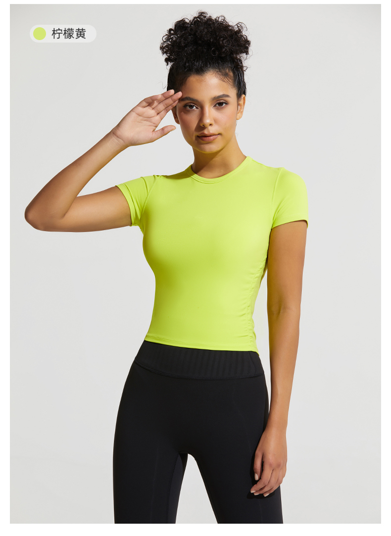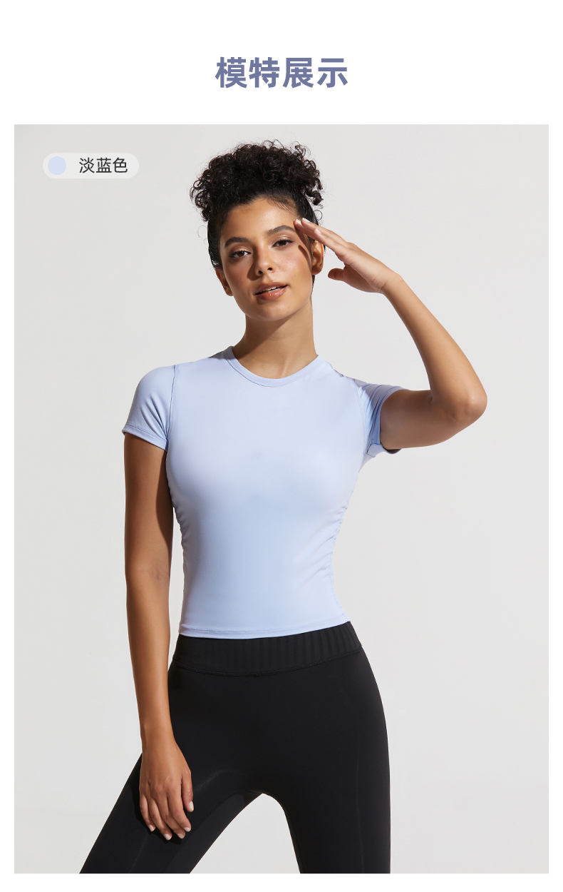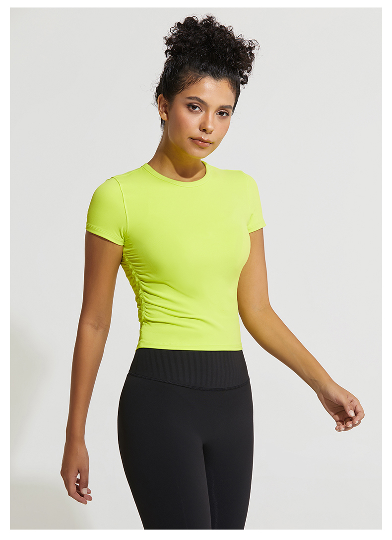 【特卖】科里芙侧腰褶皱圆领运动短袖美式健身服运动修身春夏