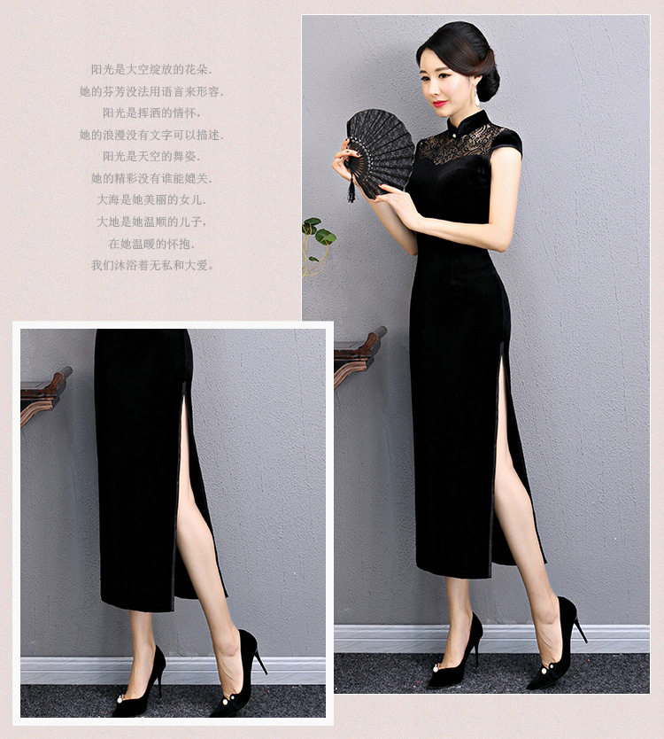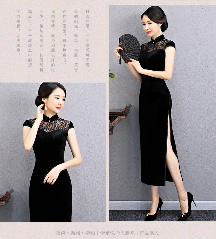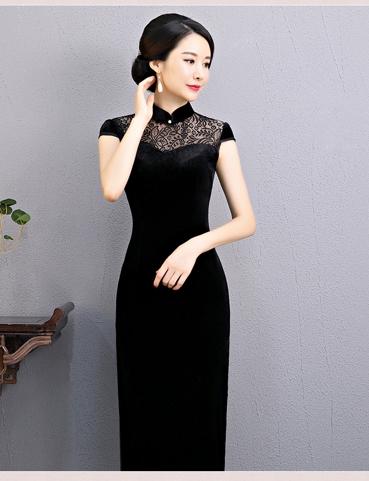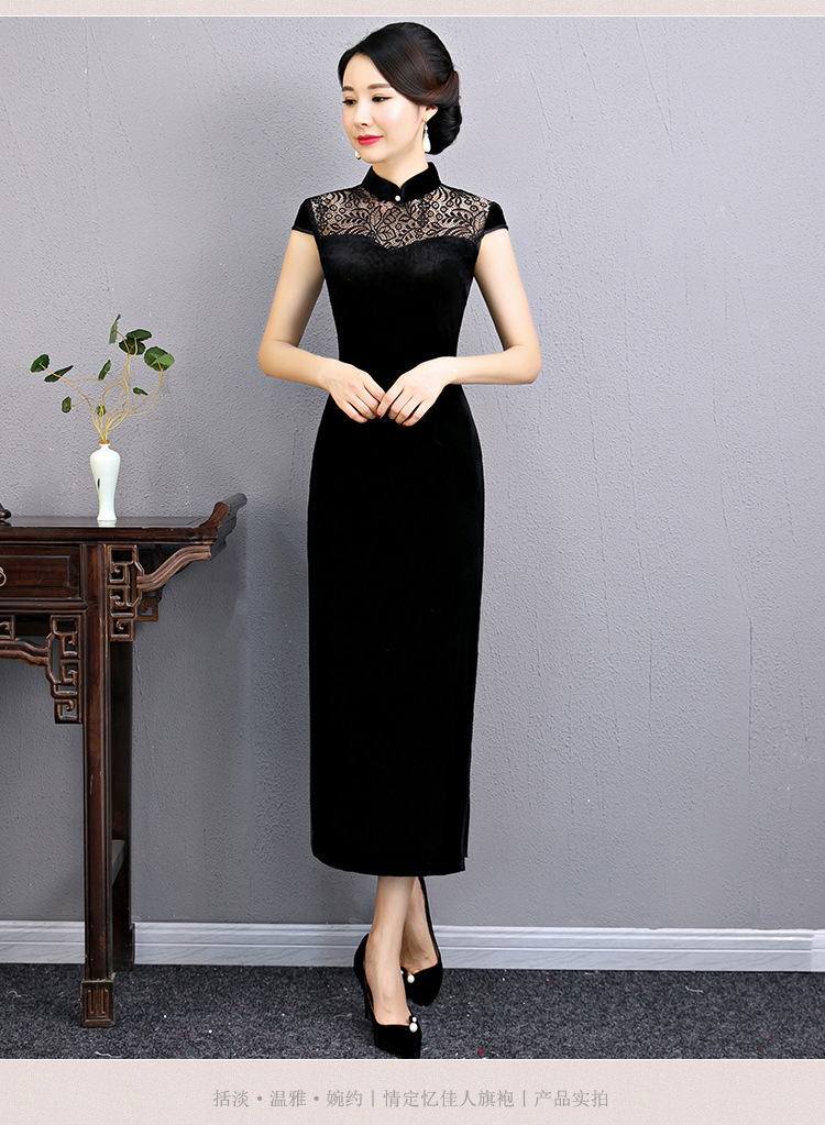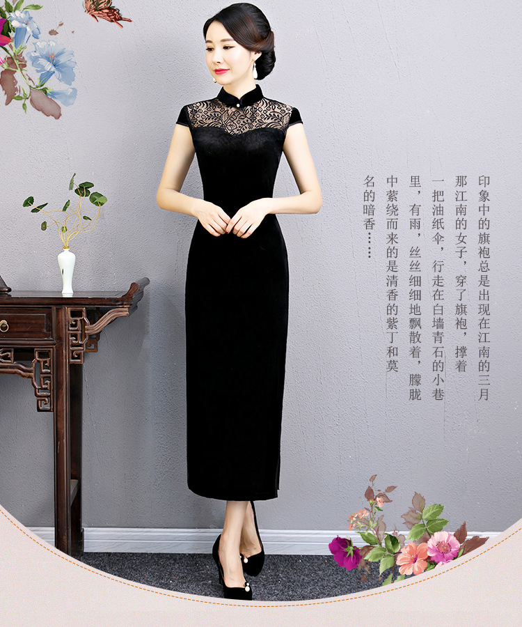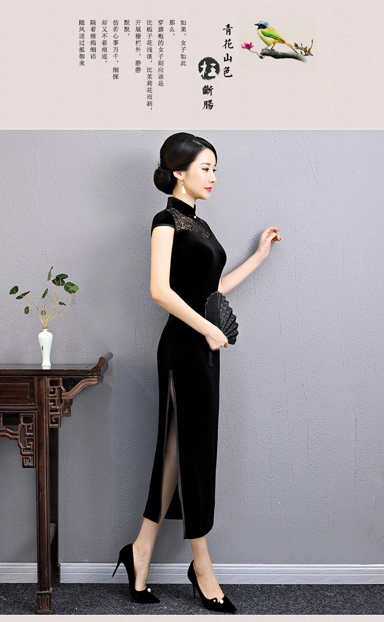 上海旗袍厂BJ-180197新款改良旗袍 长款高开衩复古镂空丝绒旗袍连衣裙