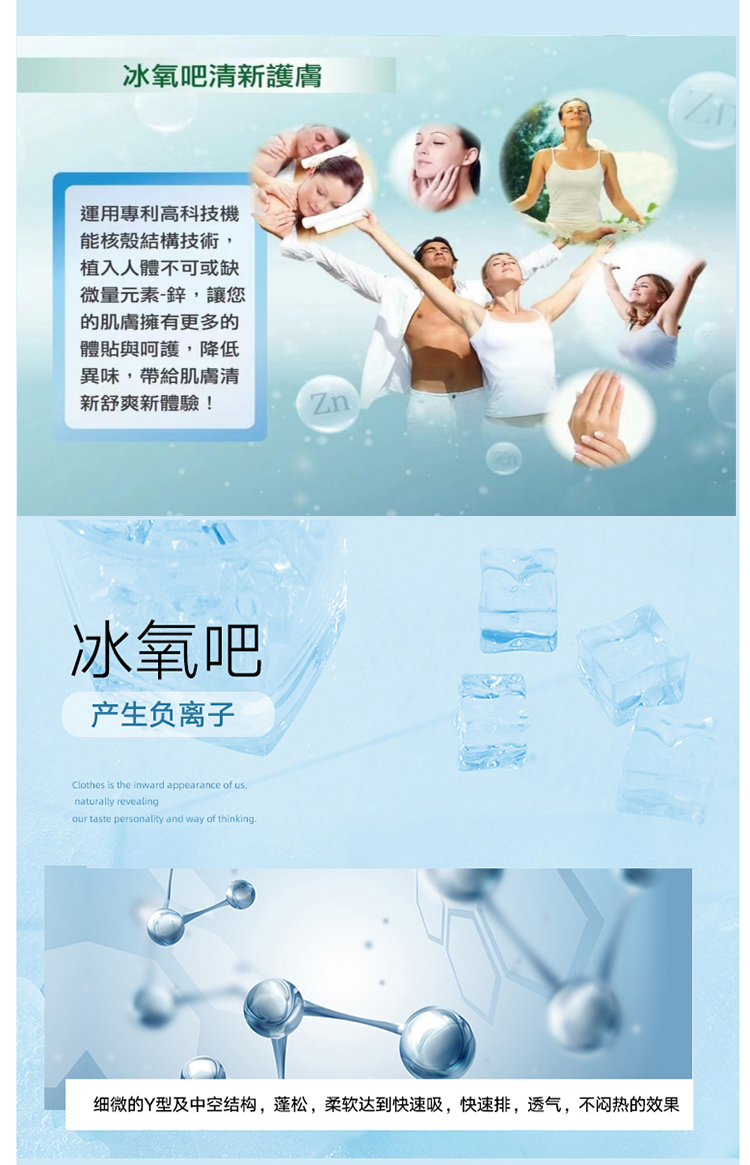 冰氧吧面料是一种健康、护肤、长效低温的黑科技面料其中添加锌玉纤维成分,使得肌肤与面料摩擦后产生大量负离子,具有清新护肤,促成人体合成和储存维生素的作用,高速散热材料与面料本身排汗纤维结构结合能迅速将皮表热量导向纤维外端维持肌肤冰凉感,同时避免过多湿气残留维持一定比例水汽,感受长效低温