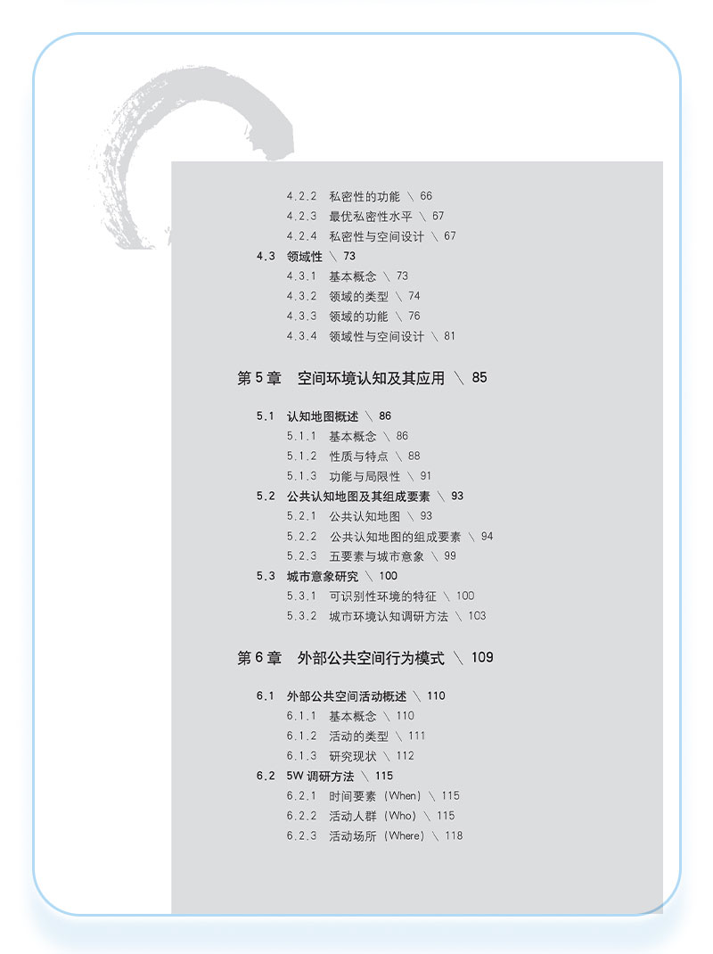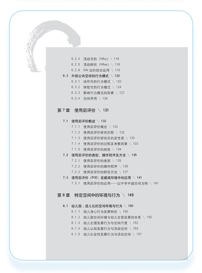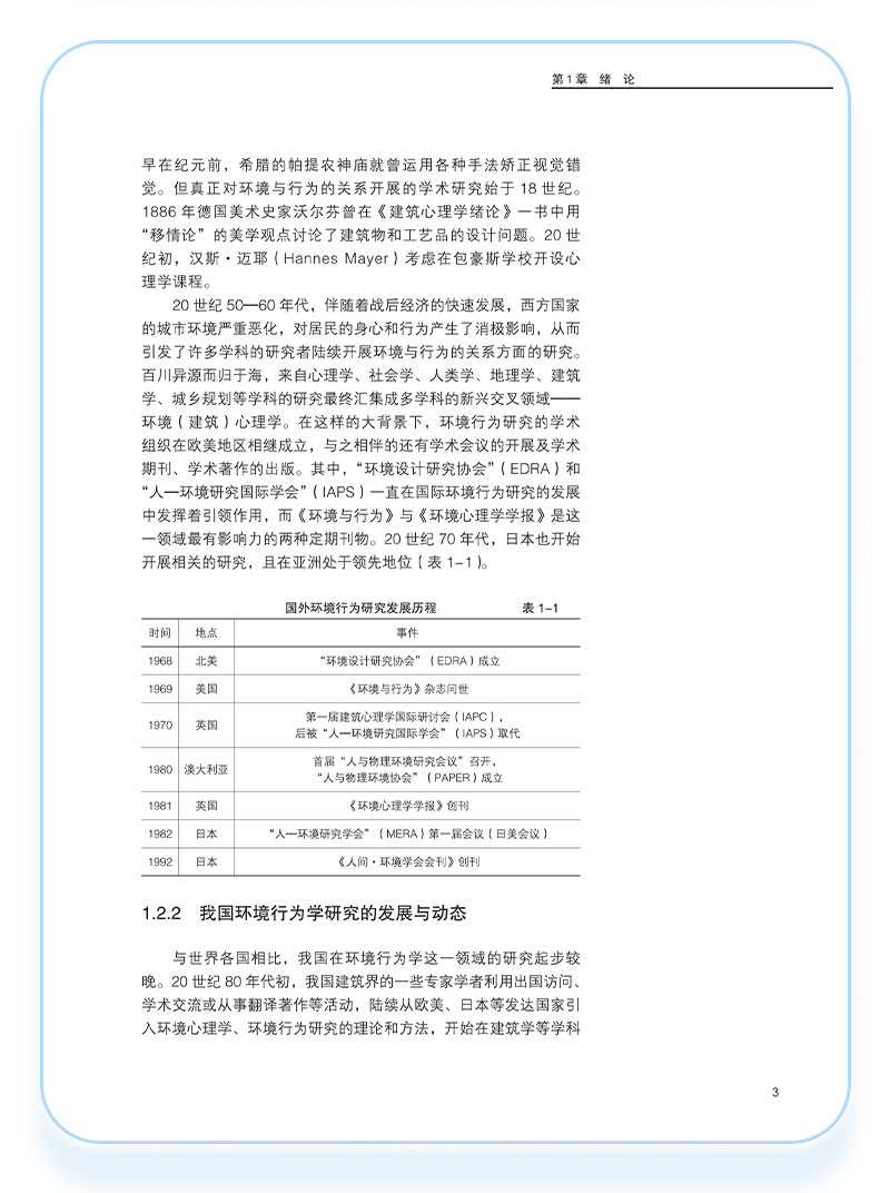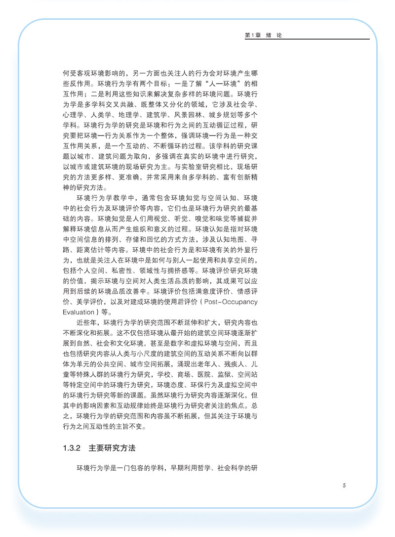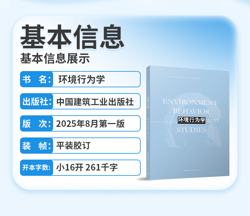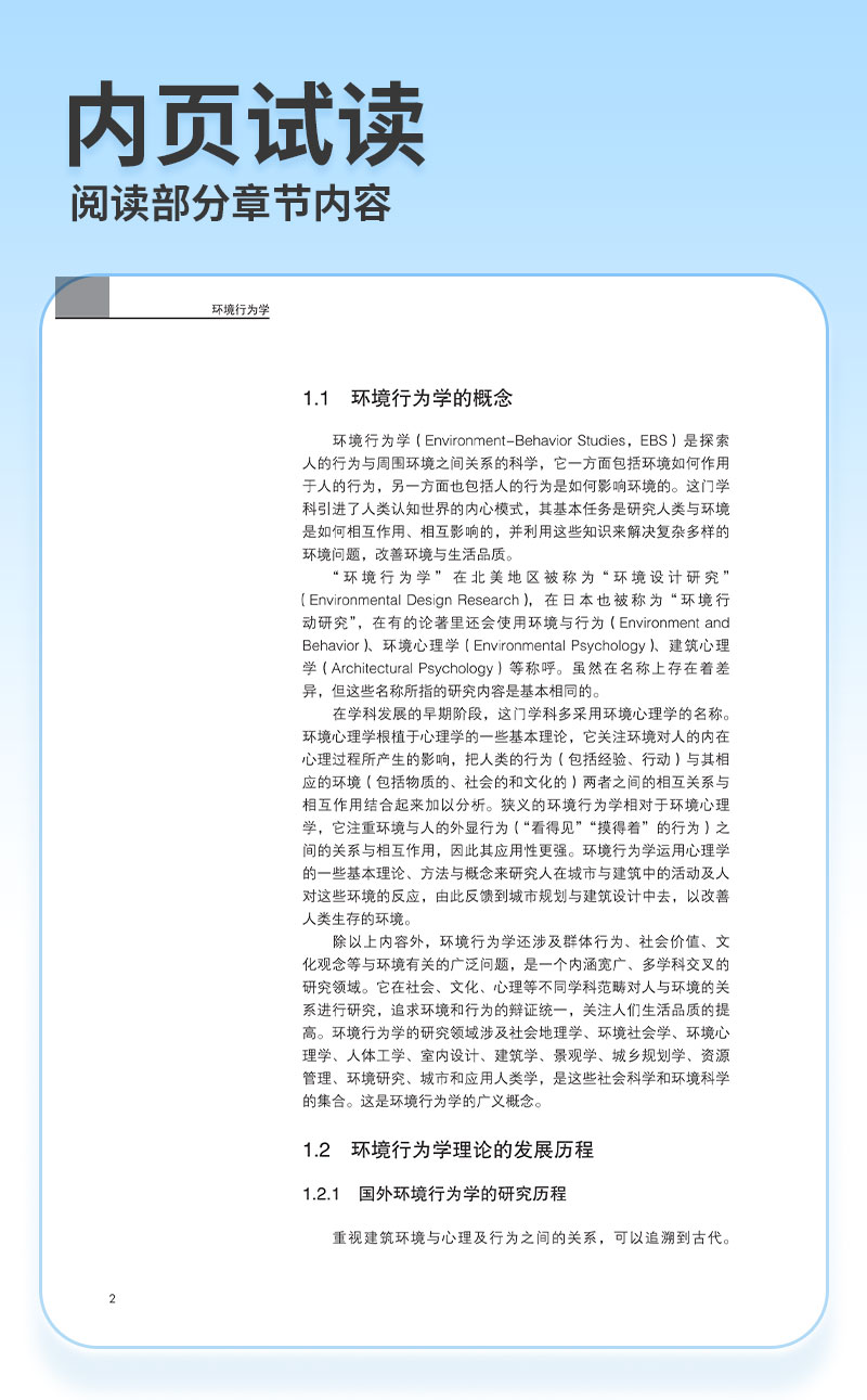 环境行为学是研究人与人所处的物质环境之间相互关系的学科。环境行为学是新型交叉学科与应用学科, 涉及心理学、社会学、地理学、文化学、人类学、建筑学、城市规划、园林规划与设计和环境保护等多种领域。 本教材主要阐述环境行为学的基本理论及方法,共九章,包括:绪论、感觉、知觉与认知、环境知觉理论、个人空间、私密性与领域性、城市环境认知、外部公共空间行为模式、使用后评价、特定空间中的环境与行为、优秀作业评析。可作为建筑学、城乡规划学、城市设计、风景园林学、环境设计等专业的本科生及研究生教材,也可为相关专业的设计人员与科研人员提供参考。