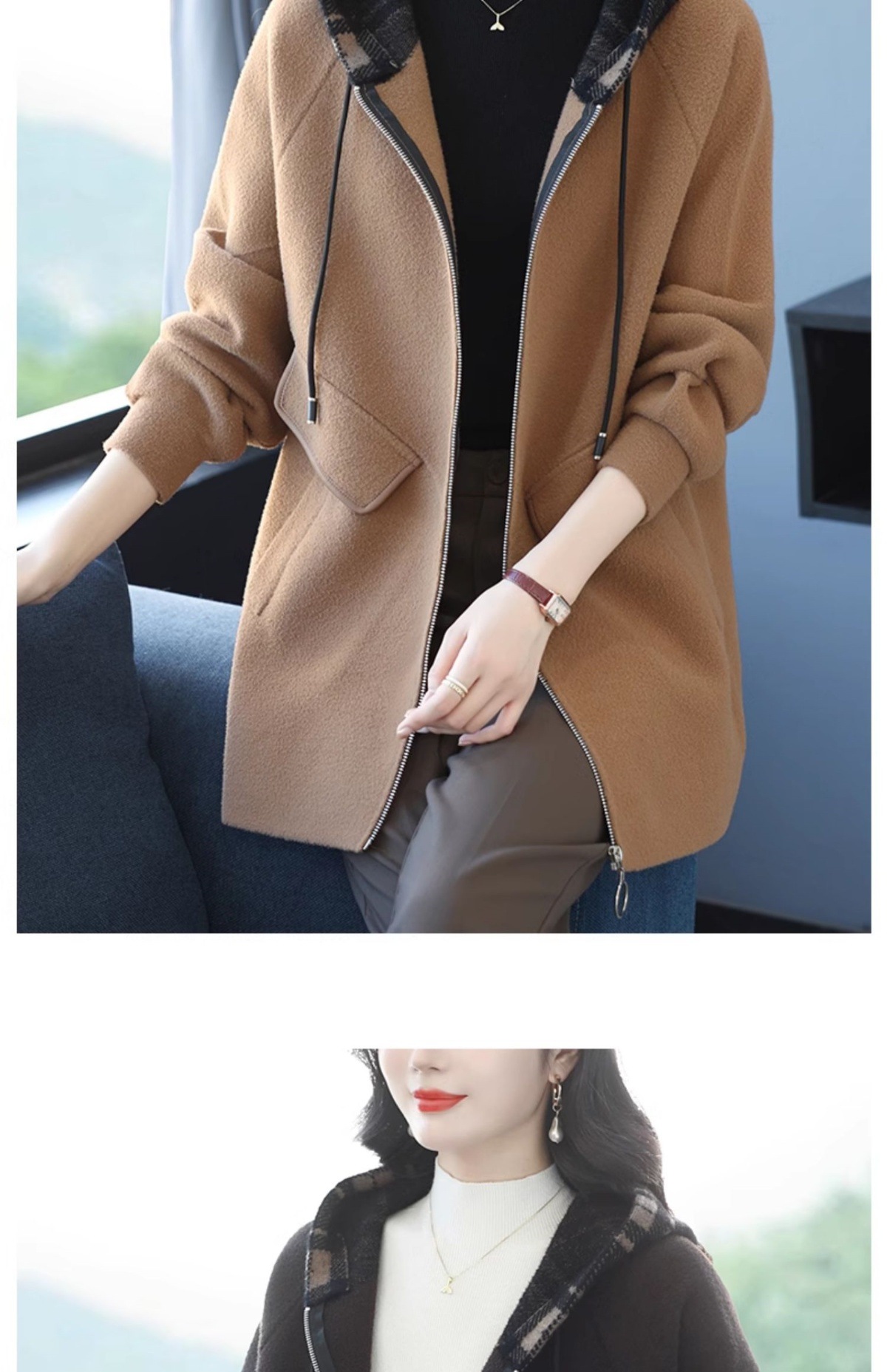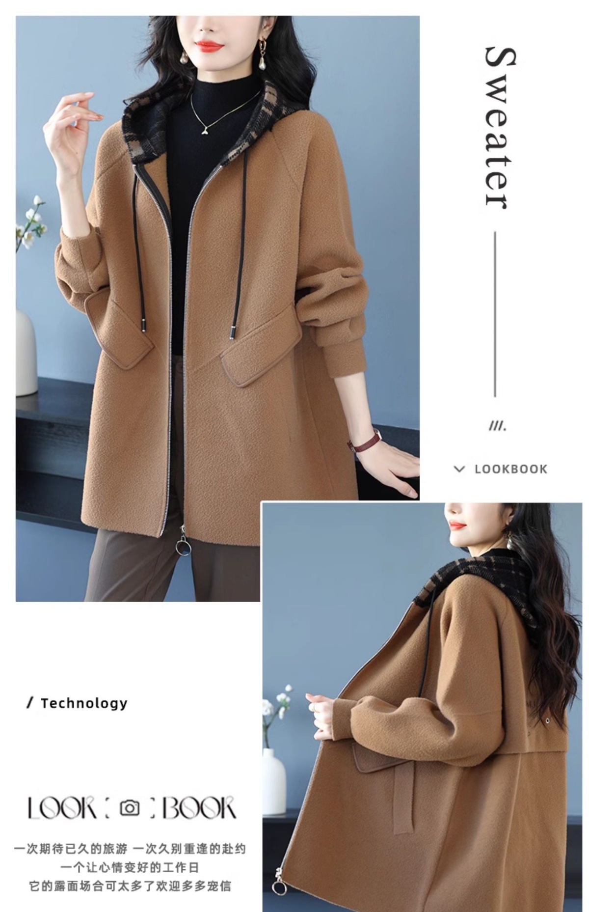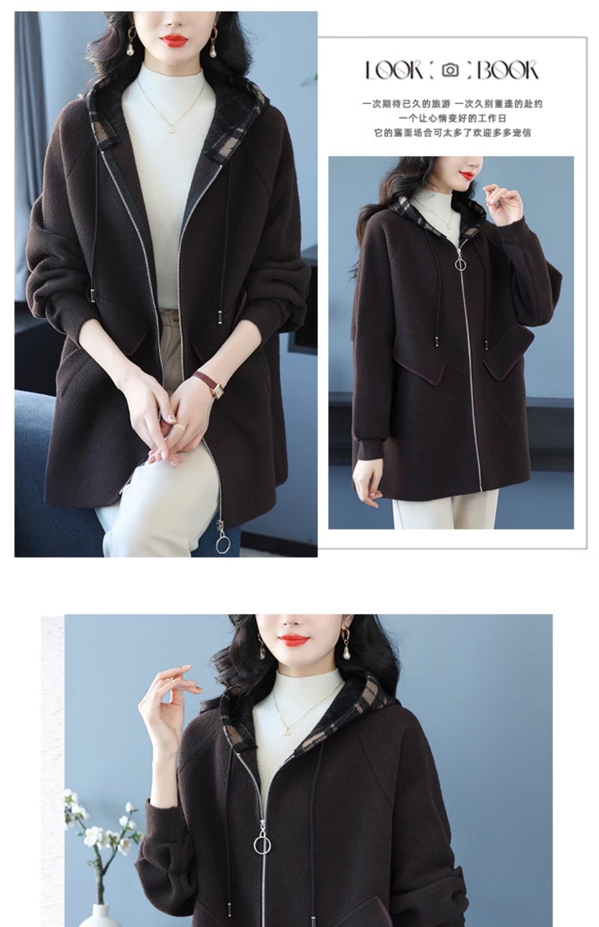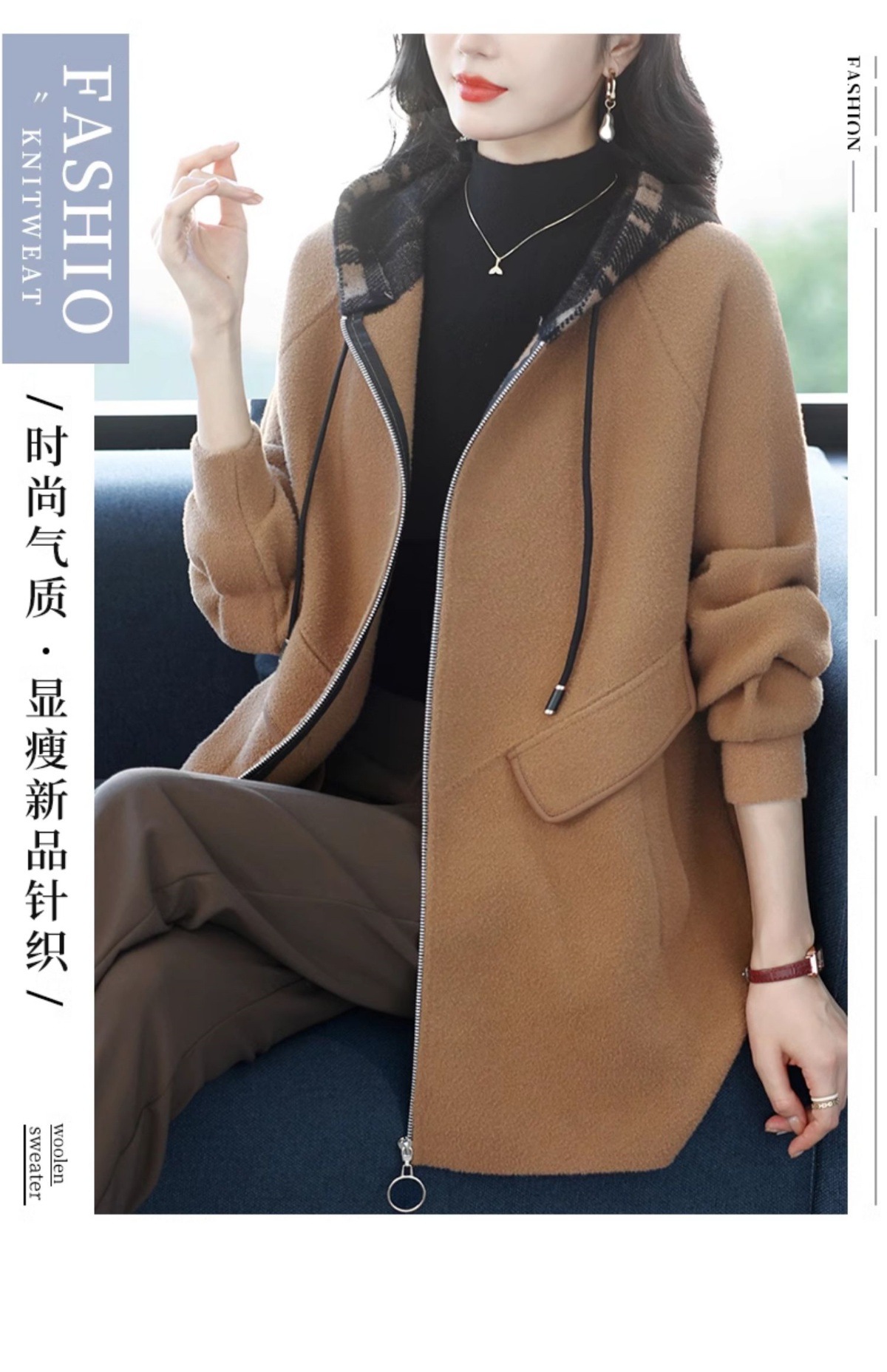 CC-10-5752连帽毛呢外套韩版宽松拉链开衫女士秋冬季时尚休闲大码胖MM上衣潮