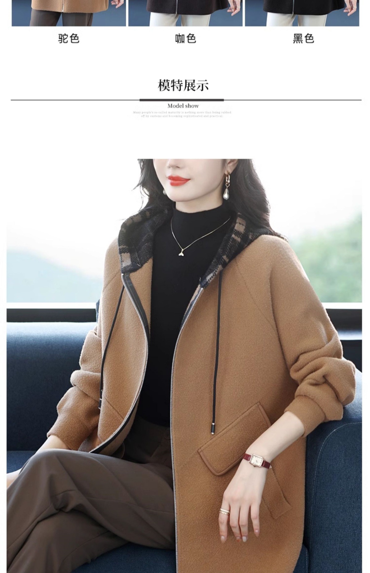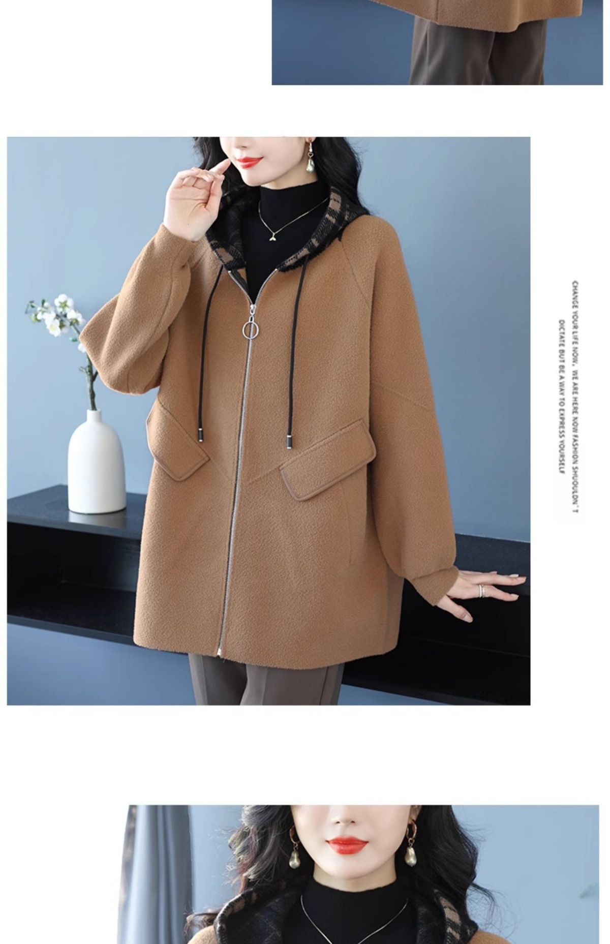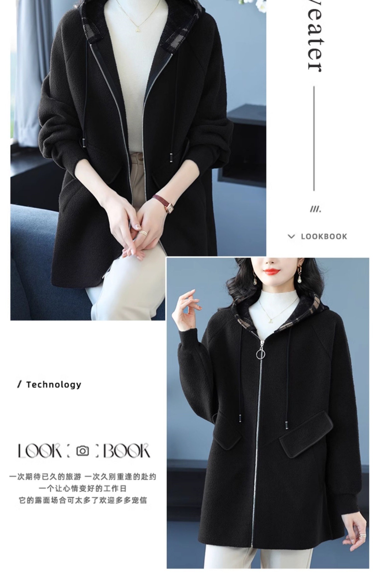 CC-10-5752连帽毛呢外套韩版宽松拉链开衫女士秋冬季时尚休闲大码胖MM上衣潮