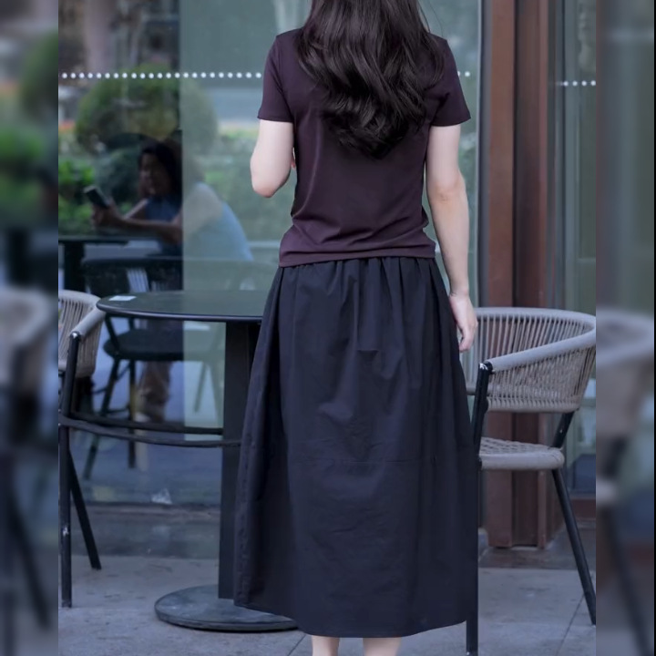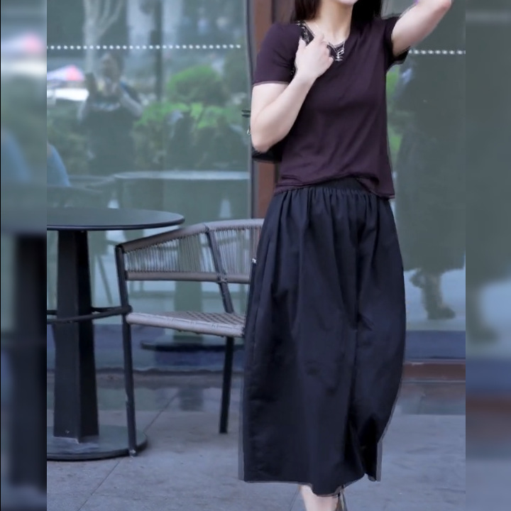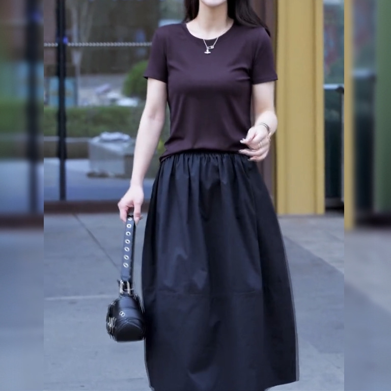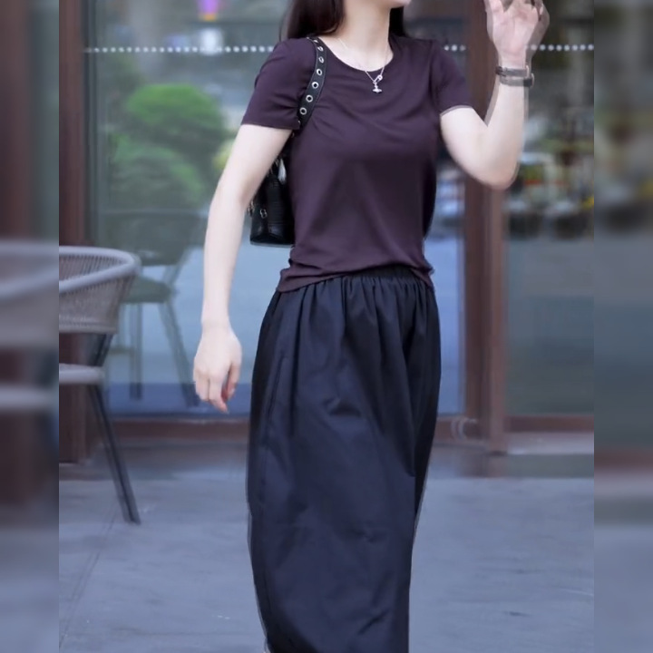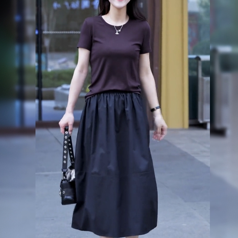 X179+Q312【套装】纯色遮肚夏季短袖上衣搭高腰休闲半身裙套装