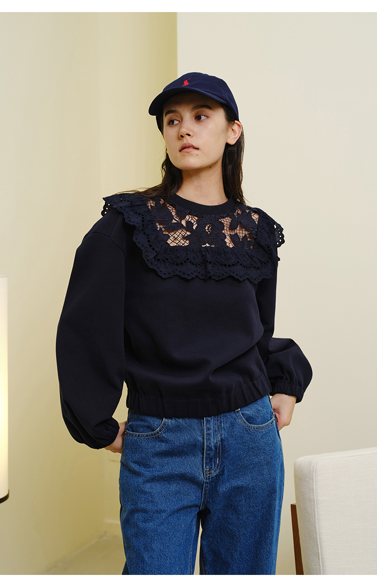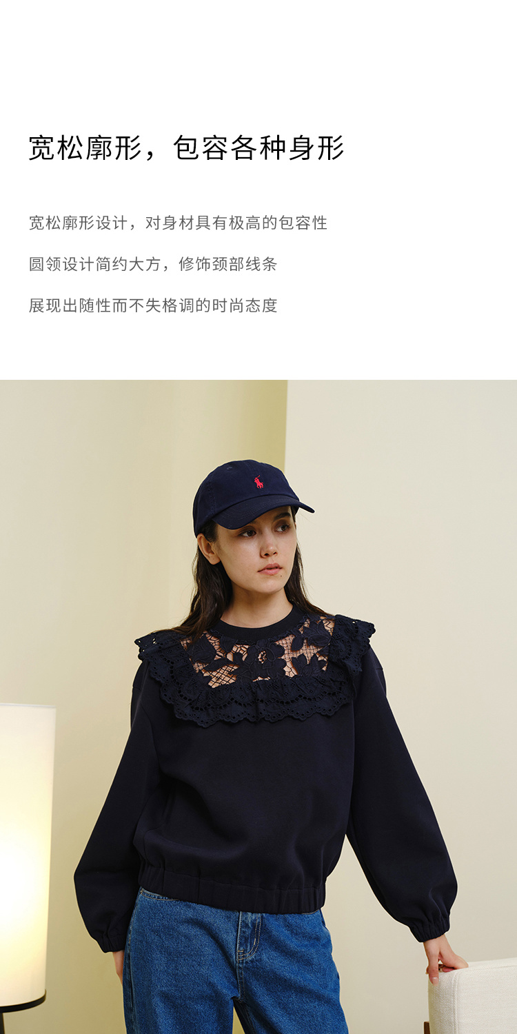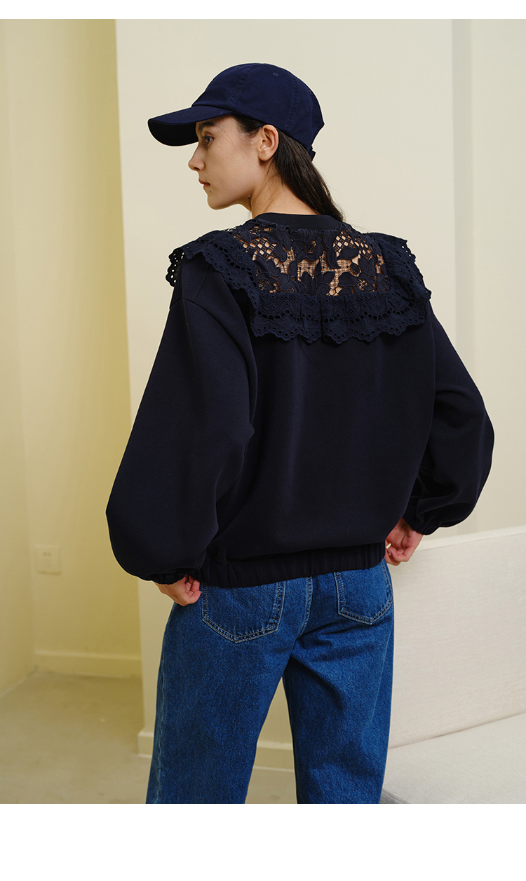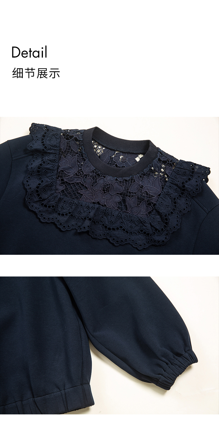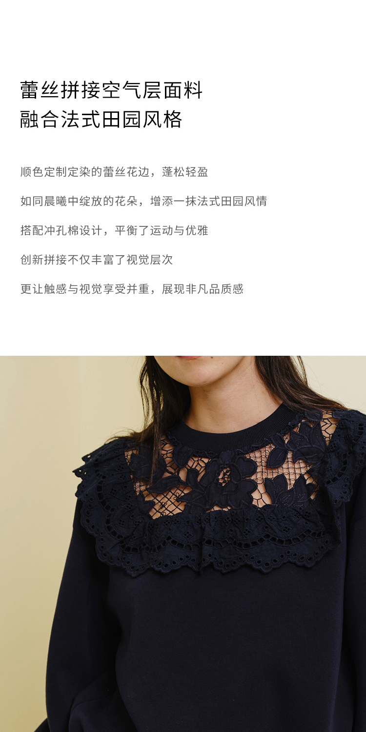 HeyDress法式蕾丝拼接卫衣女秋季复古圆领浪漫气质设计感短款上衣