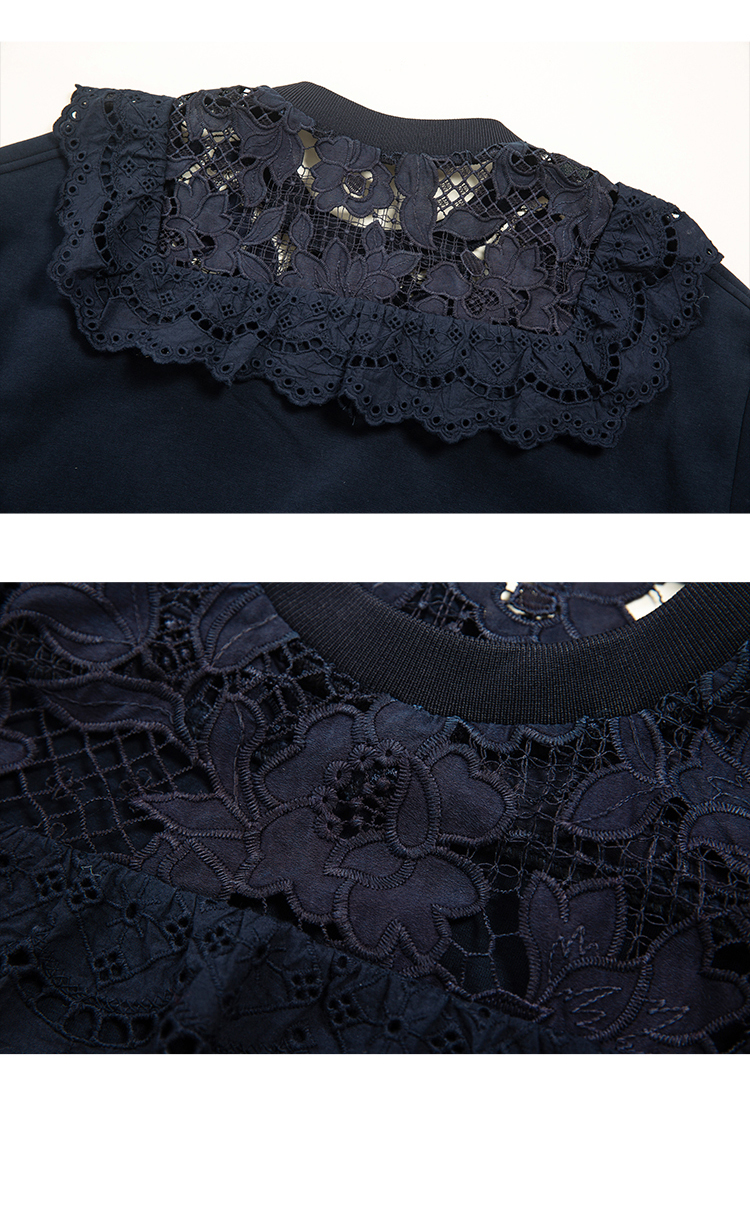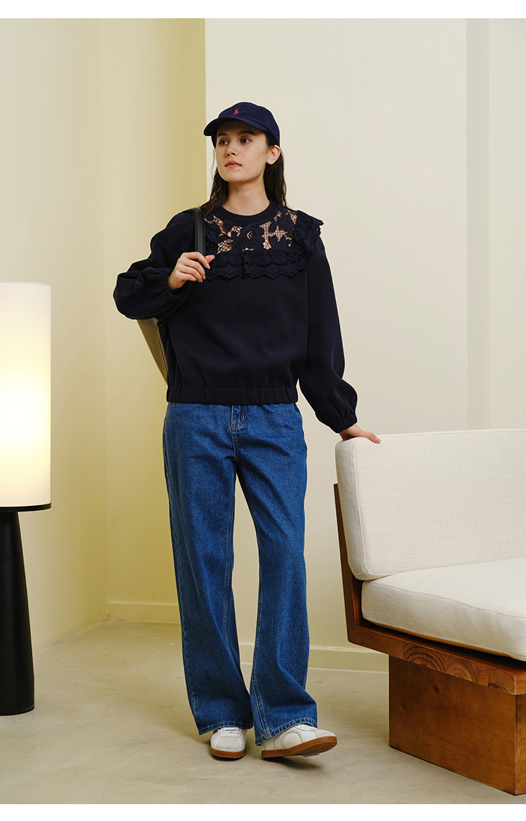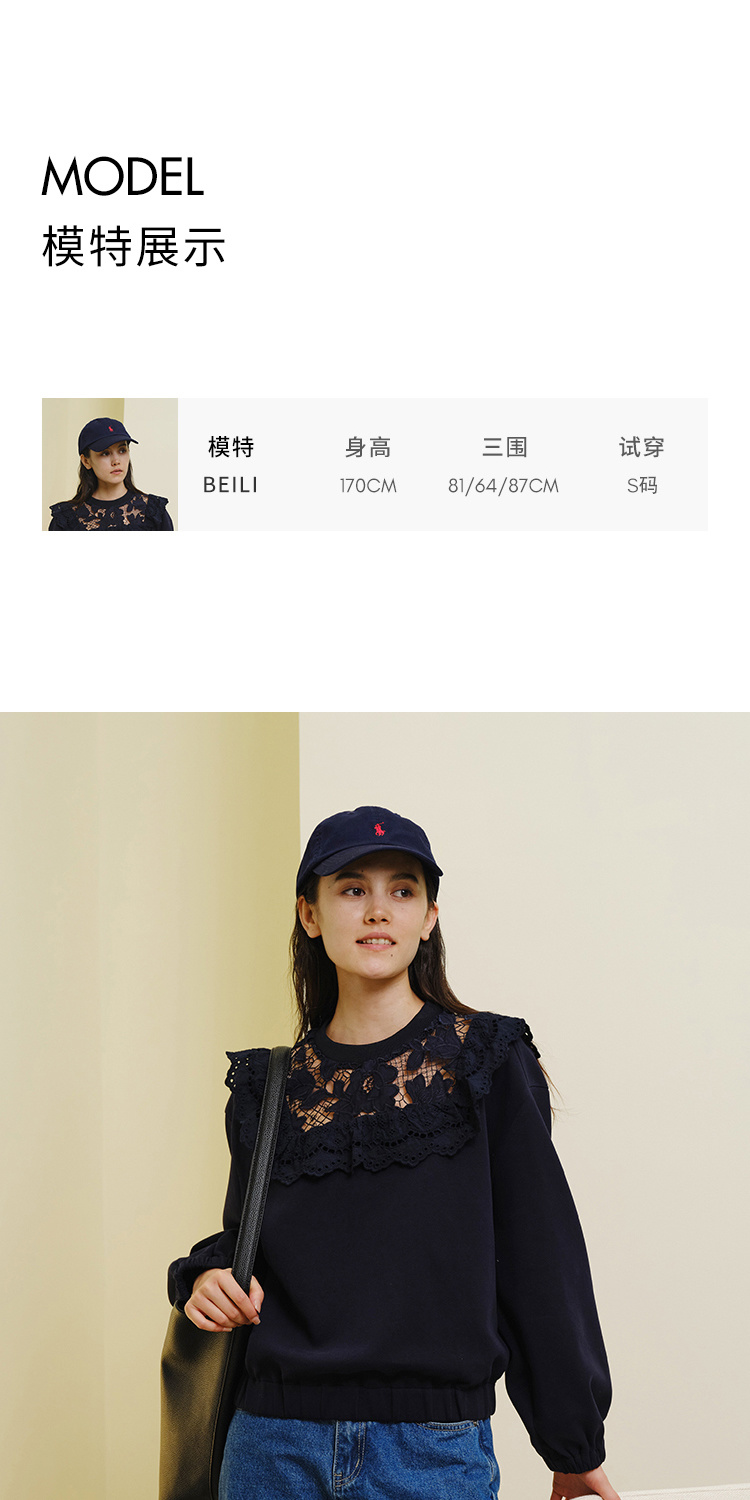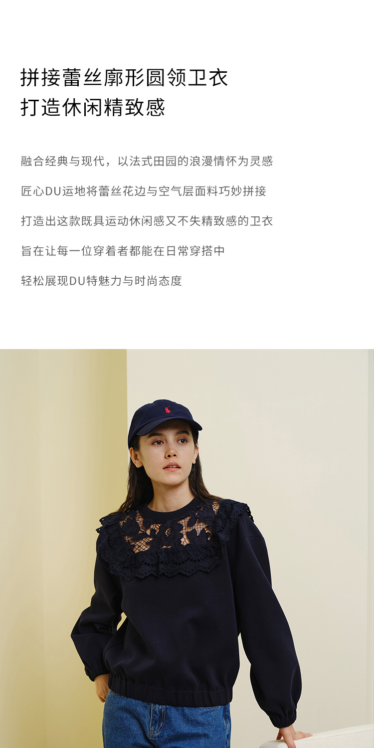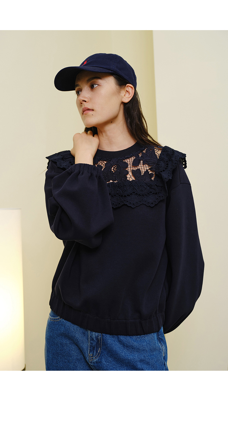 HeyDress法式蕾丝拼接卫衣女秋季复古圆领浪漫气质设计感短款上衣