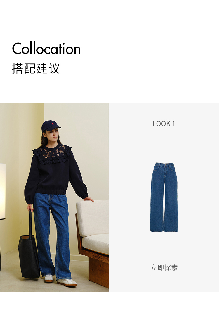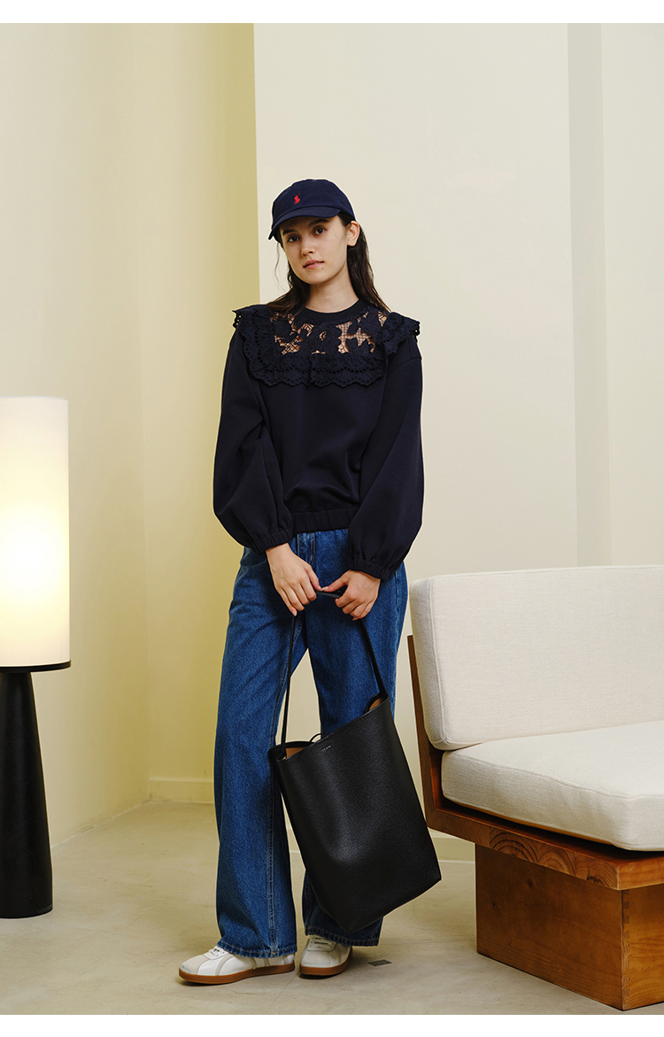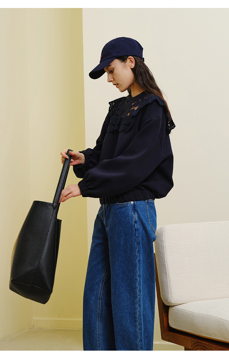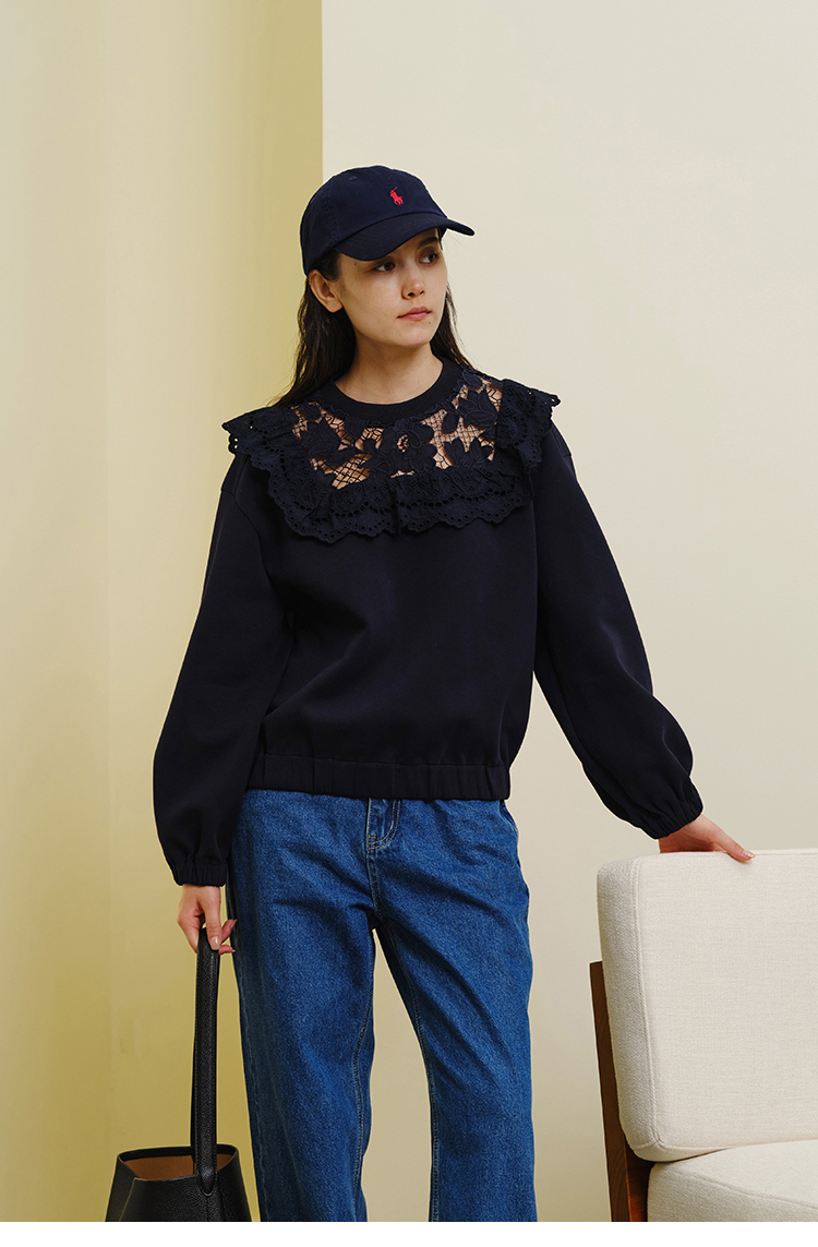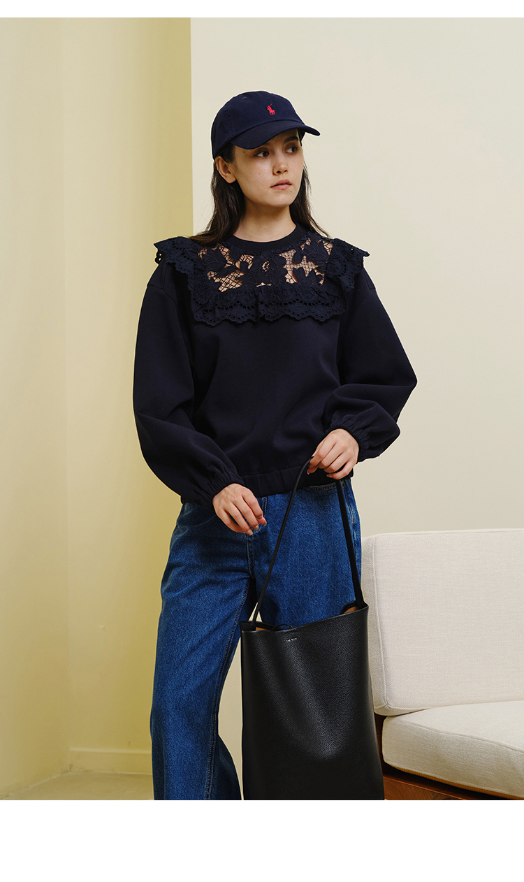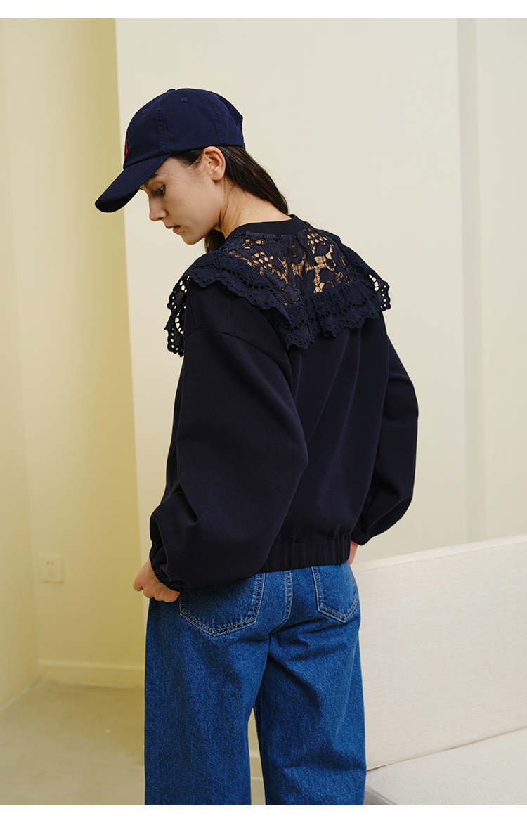 HeyDress法式蕾丝拼接卫衣女秋季复古圆领浪漫气质设计感短款上衣