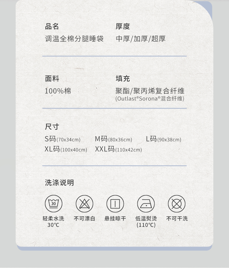 升级款恒温睡袋宣称里料具有吸湿性,能够吸收宝宝贴身衣物的汗液,使身体保持清爽。