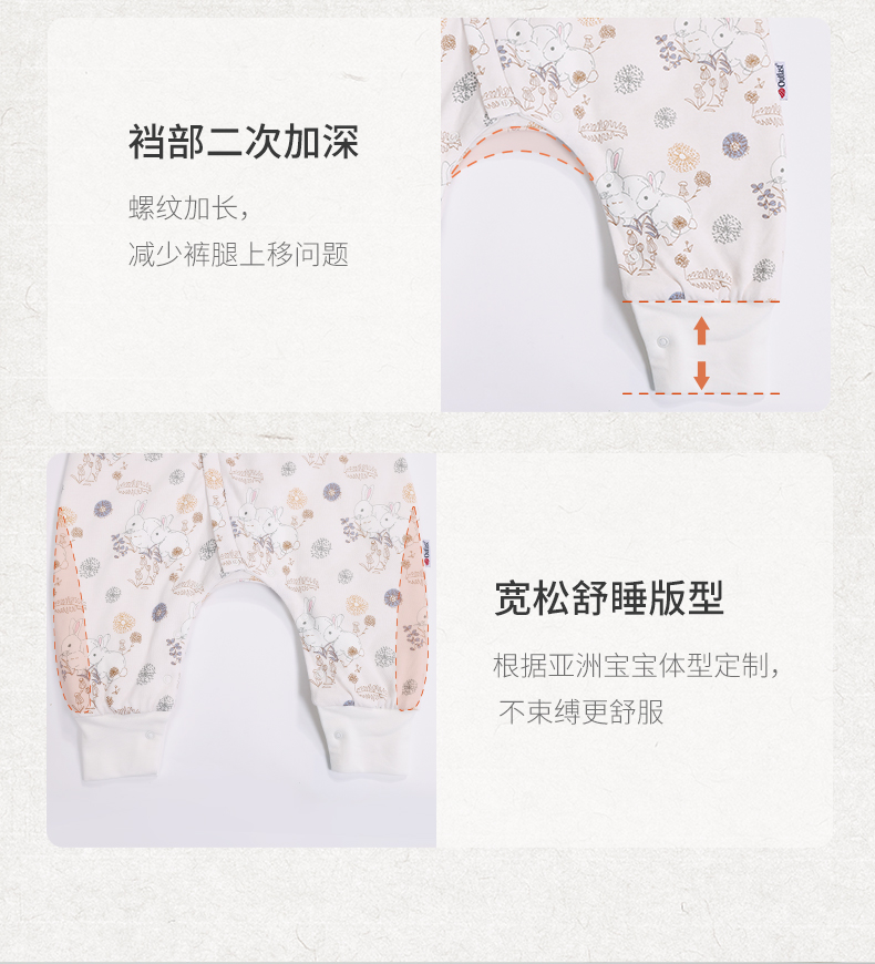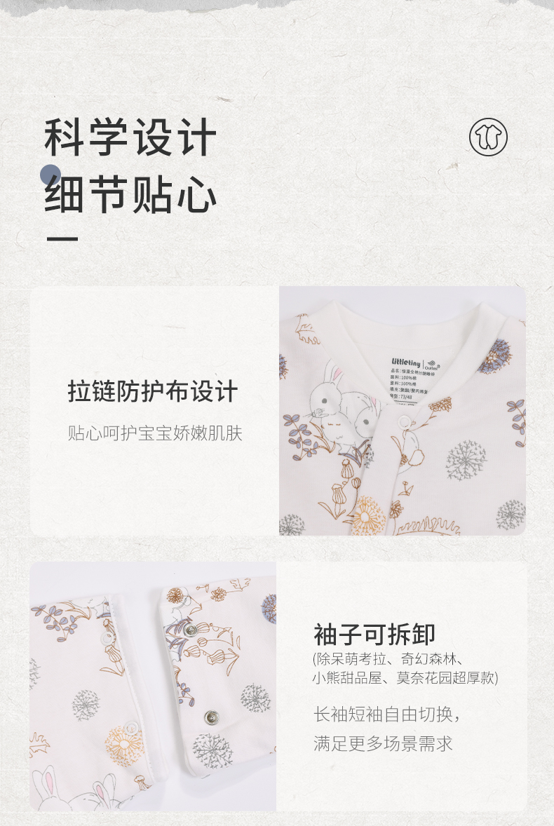 细节之处贴心:按扣式切换长短袖、拉链护片宽大、领口尺寸适中,不勒也不松垮、裆部可打开便于换尿布