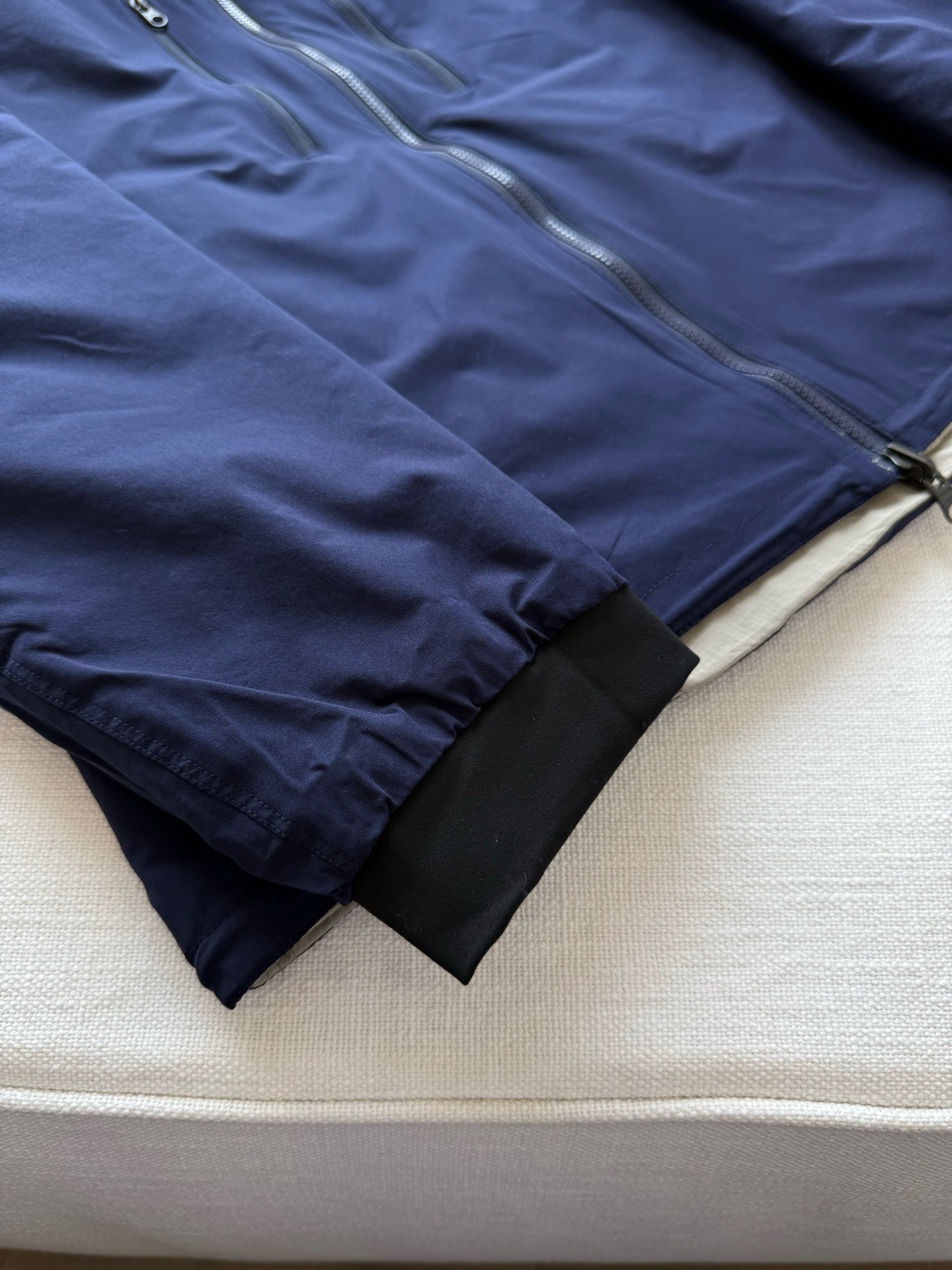 两面都有拉链口袋,下摆弹力橡筋收窄穿起来特别干练,拉伸弹性也很足,贴合束口防灌风!一体两面穿设计,一件顶两件!