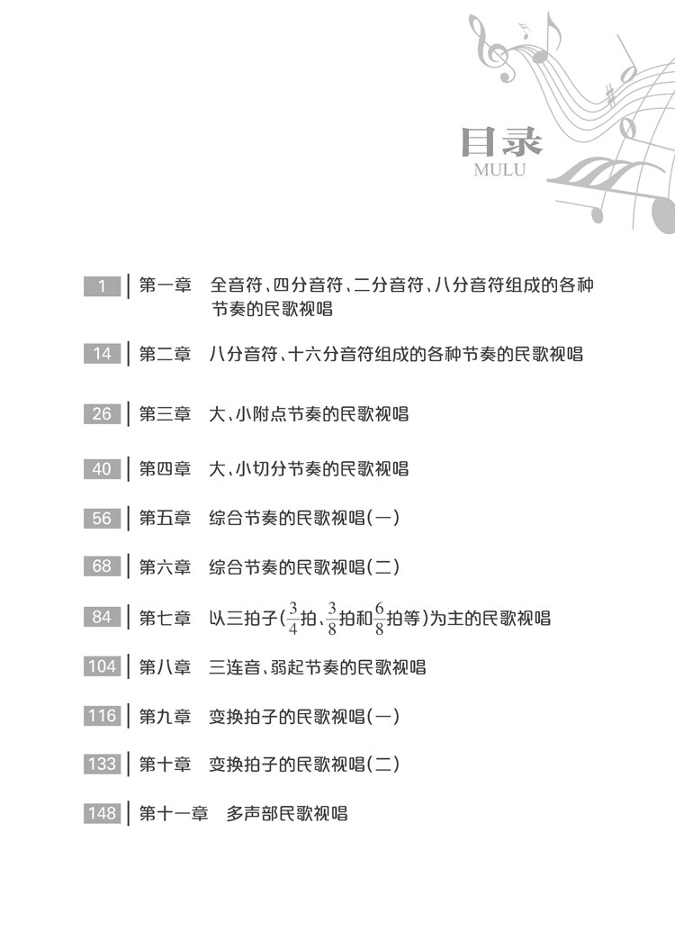 本教材编写准备工作历时两年,作者在咨询多方当地民歌演唱者和从事视唱专业教师专家建议后最终形成本书《西南多民族民歌视唱教程》。 此教材主要针对民族大学音乐类专业的学生编写,选曲内容主要以西南三省少数民族民歌为主,同时也选用了三省的部分汉族民歌,其中以四川省汉族民歌居多。 全书的结构是按节奏的难易程度分章的:第一章为全音符、二分音符、四分音符、八分音符组成的各种节奏组合的民歌;第二章为八分音符、十六分音符组成的各种节奏组合的民歌;第三章为带有大小附点节奏的民歌;第四章为带有大小切分节奏的民歌;第五、六章为综合节奏的民歌;第七章为3/4拍、3/8拍和6/8拍的民歌;第八章为带有三连音、弱起节奏的民歌;第九章、十章为变换拍子的民歌;第十一章为贵州省大歌、号子和锣鼓经多声部民歌。