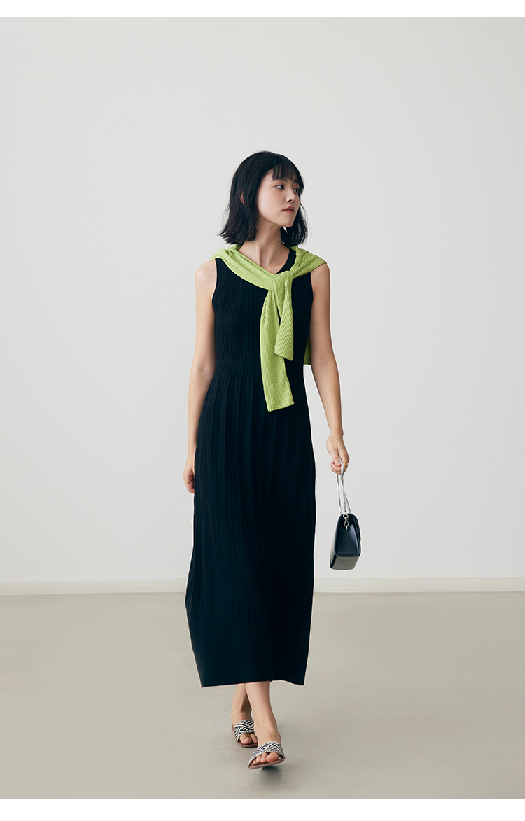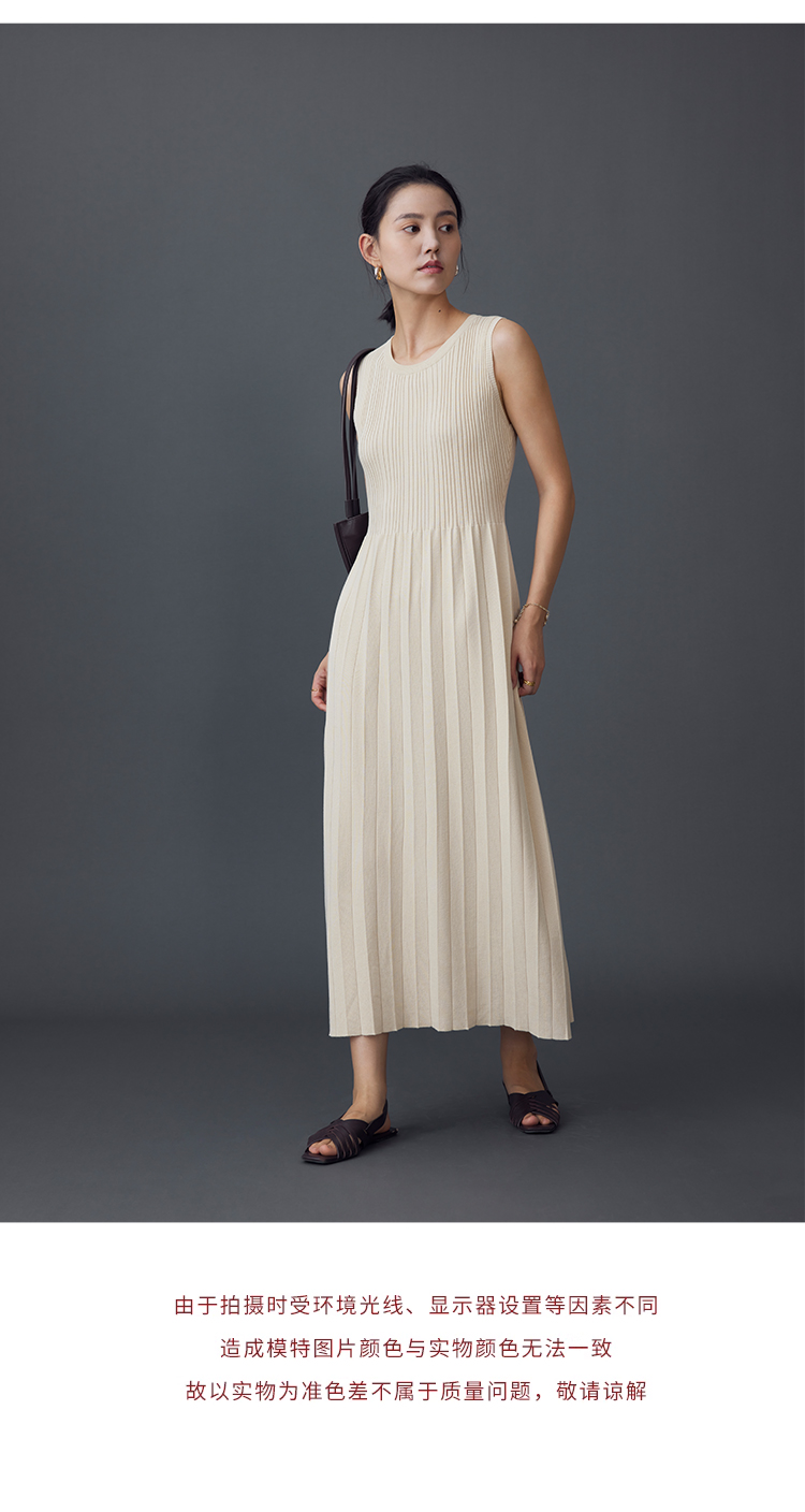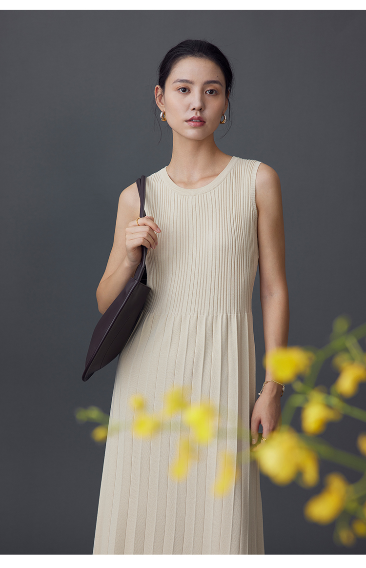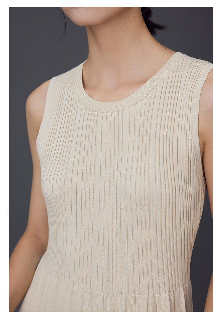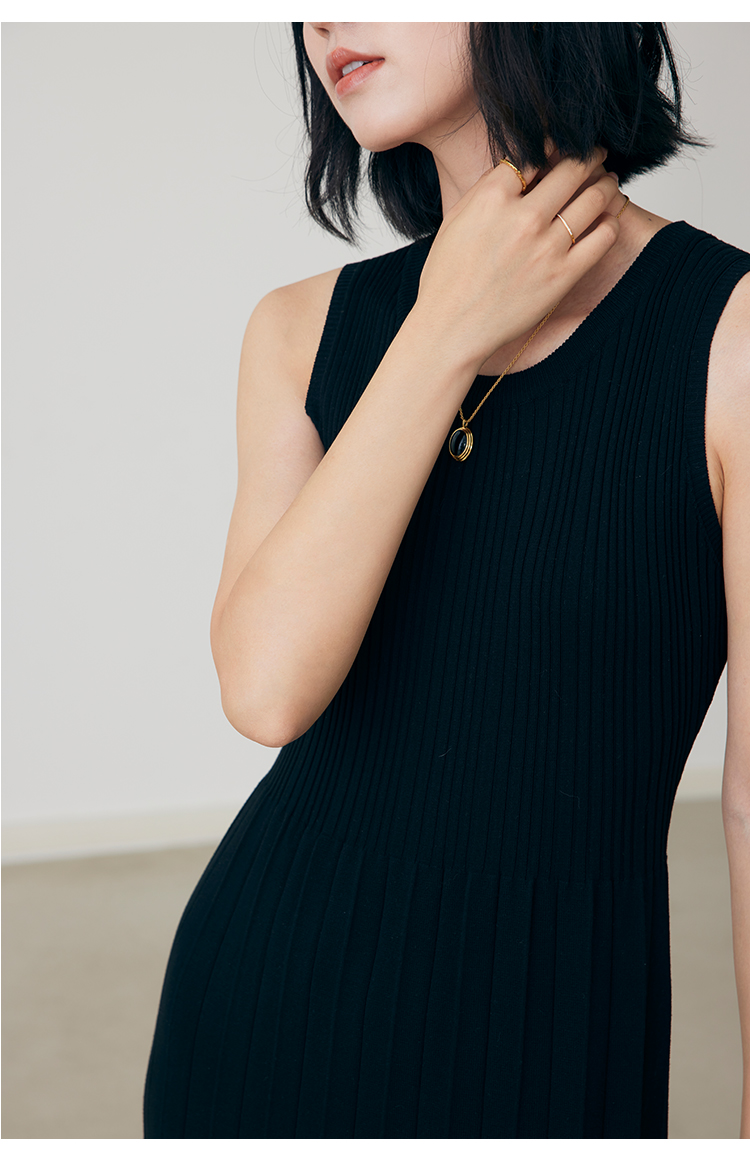 HeyDress法式针织连衣裙女早秋圆领高腰坑条设计感气质无袖裙子