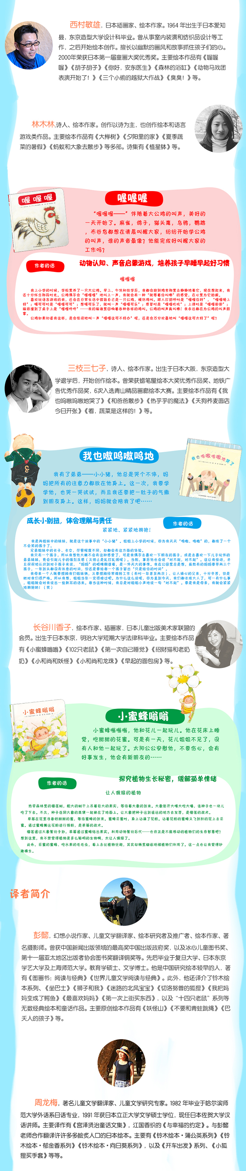 “铃木绘本•蒲公英系列”上市后,凭借其趣味盎然的故事,细腻温馨的画面,以及优质的图书品质,获得了家长和孩子们的一致好评,也有很好的市场反响。现在在旧版的基础上,重新就封面和内容等进行了修改,又充实了部分资料,以焕然一新的姿态重新出现在大家面前,使经典与现代完美结合。蒲公英系列是铃木绘本中的低年龄段绘本,针对0~3岁儿童,精选了宫西达也、西村敏雄、宫本忠夫、秋山匡等日本具影响力的绘本大师代表作品,由彭懿、周龙梅等翻译名家倾情翻译,译文生动有趣。故事充满哲理,包含亲情、友情、成长、勇气与分享等主题。画风亲切细腻,色彩鲜明柔和,整体作品极具亲和力,是亲子共读的精品之作。环保大豆油墨印刷、圆角设计,助宝宝安全度过童年。