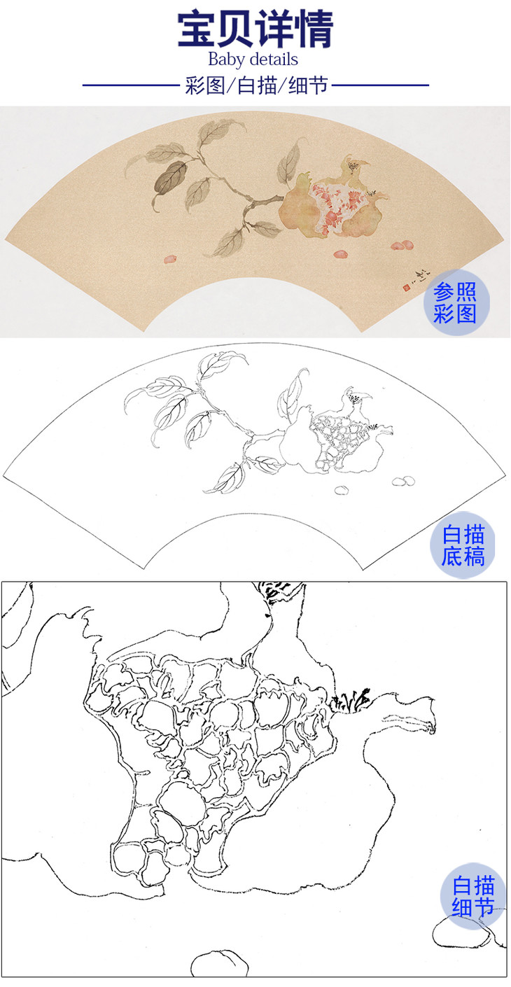 张莉莉没骨画工笔花鸟白描底稿-石榴扇面小品-ZA43