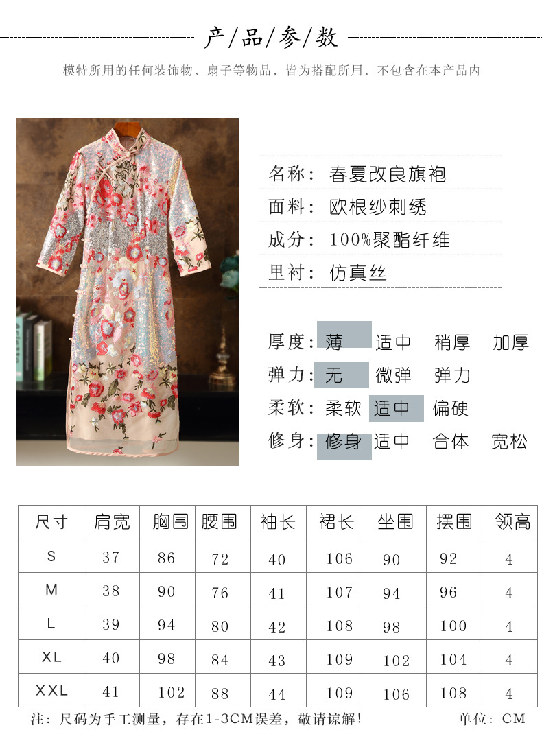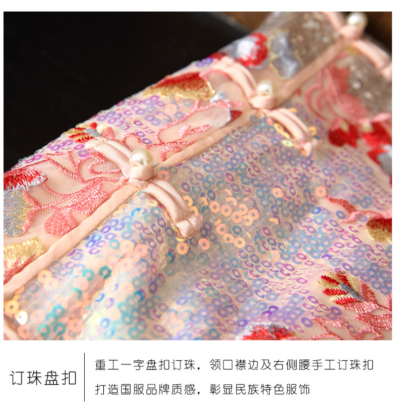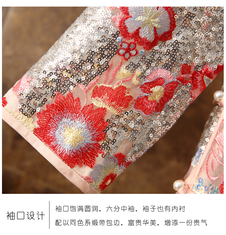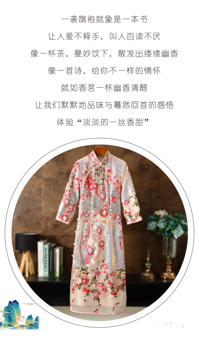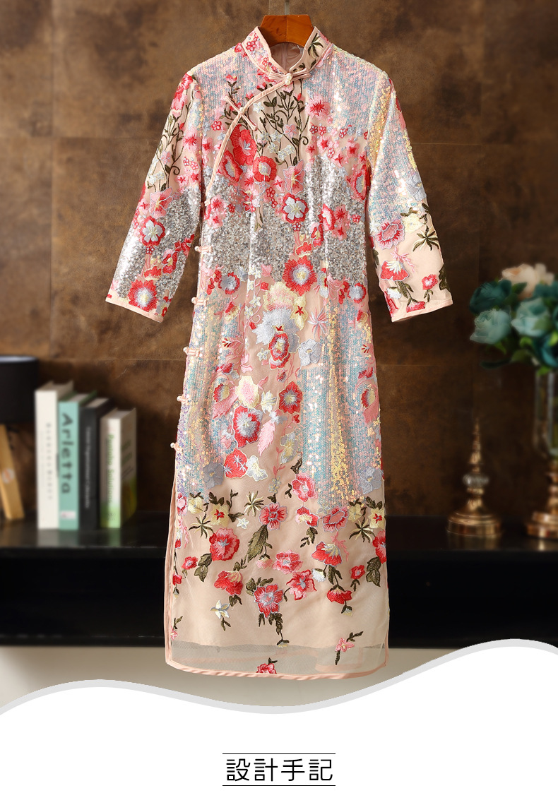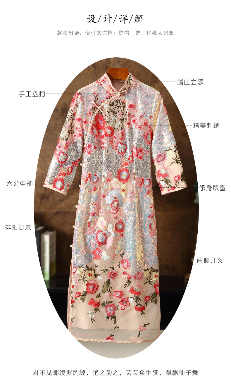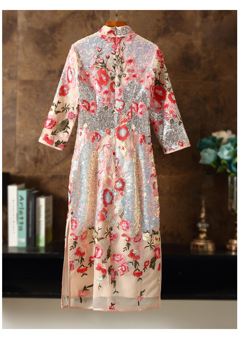 春夏中式立领,七分袖亮珠片时尚改良版女连衣裙刺绣花旗袍裙ZSM-230325