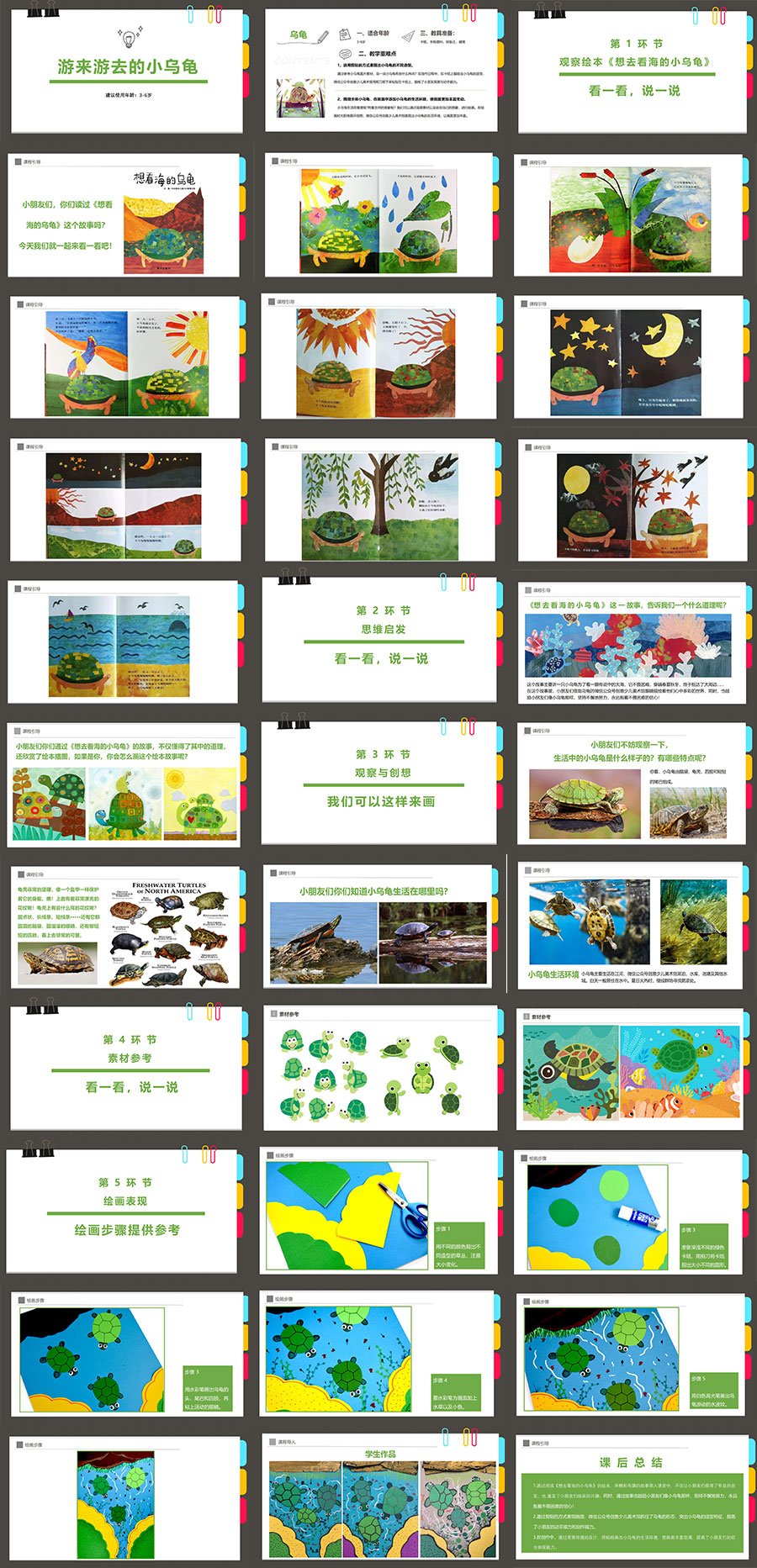 1、运用剪贴的方式表现出小乌龟的不同造型。