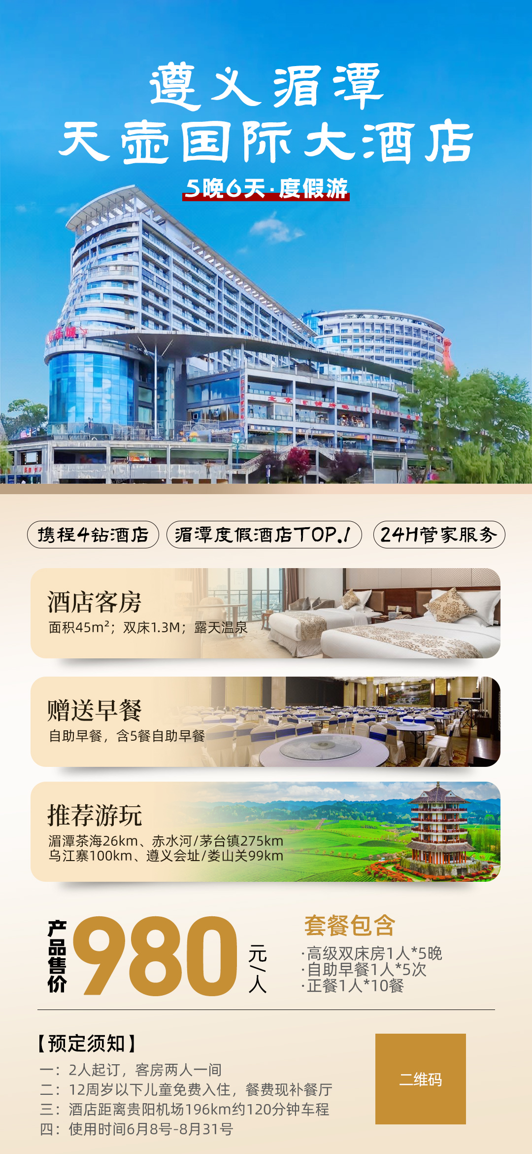旅居贵州·遵义湄潭天壶国际大酒店 6天5晚 单人含餐